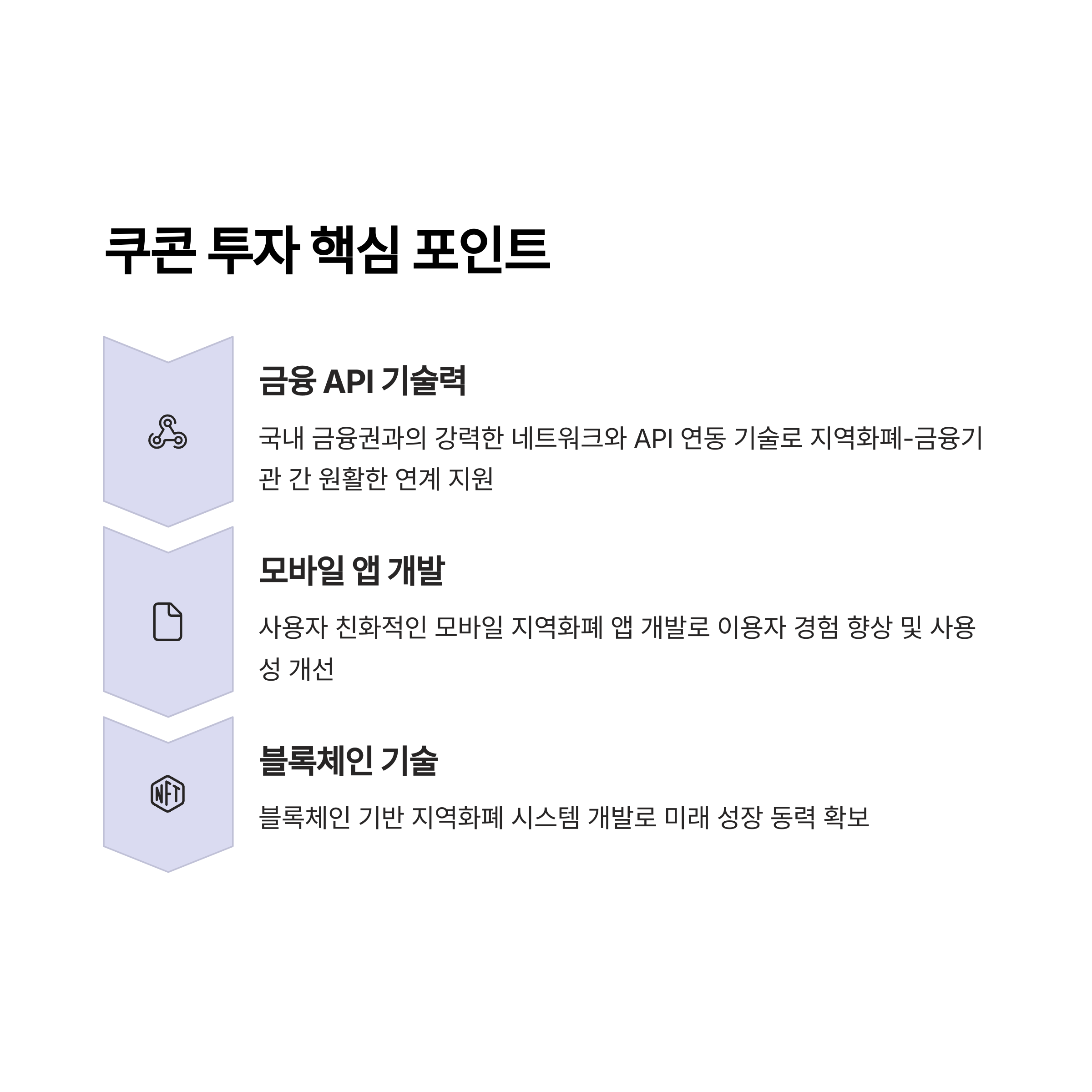 코나아이의 핵심 투자 포인트는 1) 높은 시장 점유율을 바탕으로 한 안정적인 수수료 수익, 2) 플랫폼 기반의 부가 서비스 확장 가능성, 3) 해외 시장 진출 모색 등 세 가지로 요약할 수 있습니다. 특히 지역화폐 플랫폼을 통해 확보한 트래픽을 활용한 광고, 마케팅, 데이터 판매 등 B2B 사업 확장이 기대됩니다.