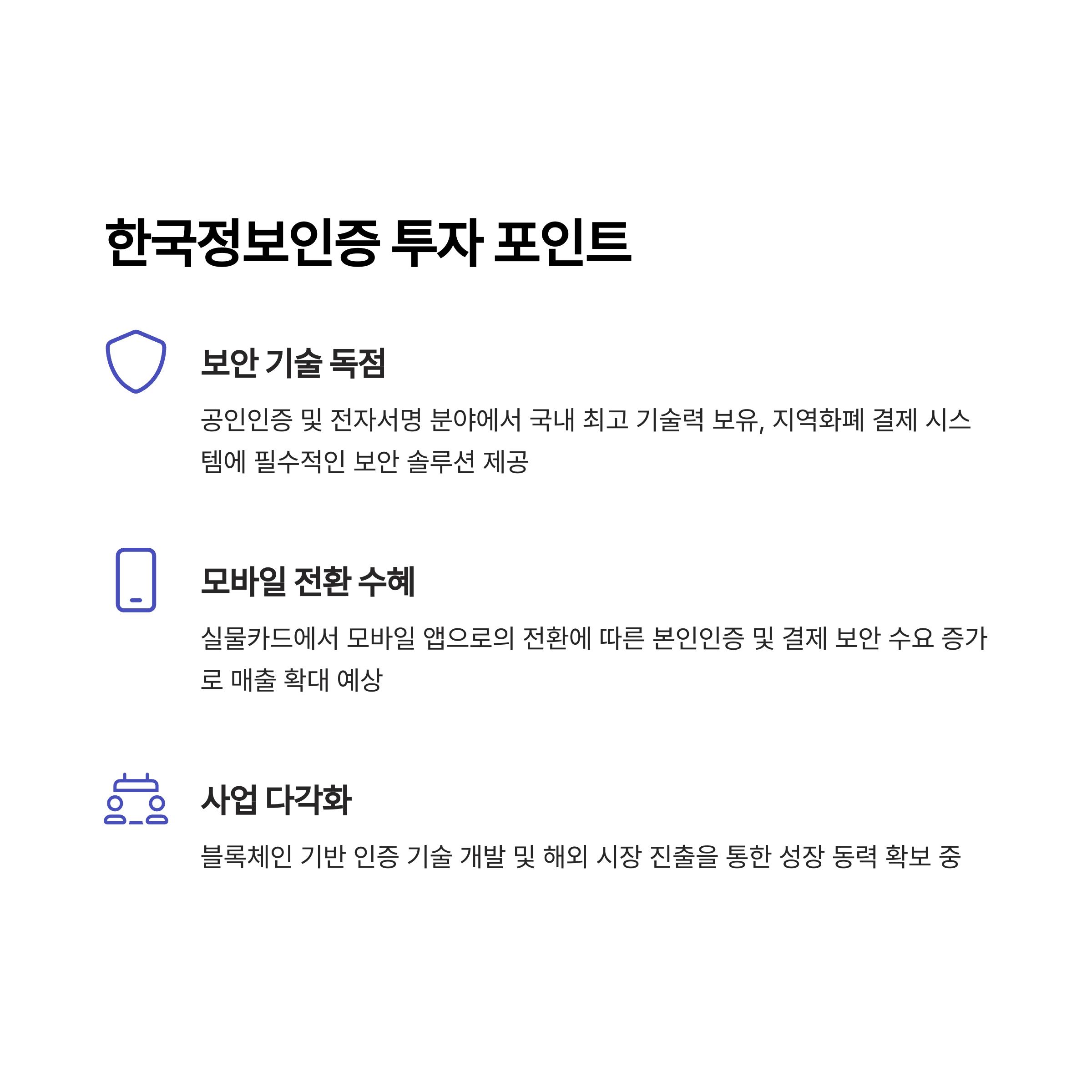 '몰빵' 투자는 절대 금물입니다. 1) 플랫폼 대장주(코나아이), 2) 안정적 대기업(KT), 3) 인프라주(NICE정보통신)를 적절히 섞어 포트폴리오를 구성하는 것이 안정적입니다. 이를 통해 특정 기업의 돌발 악재에 대한 리스크를 분산시키고, 시장 전체의 성장을 따라갈 수 있습니다.
