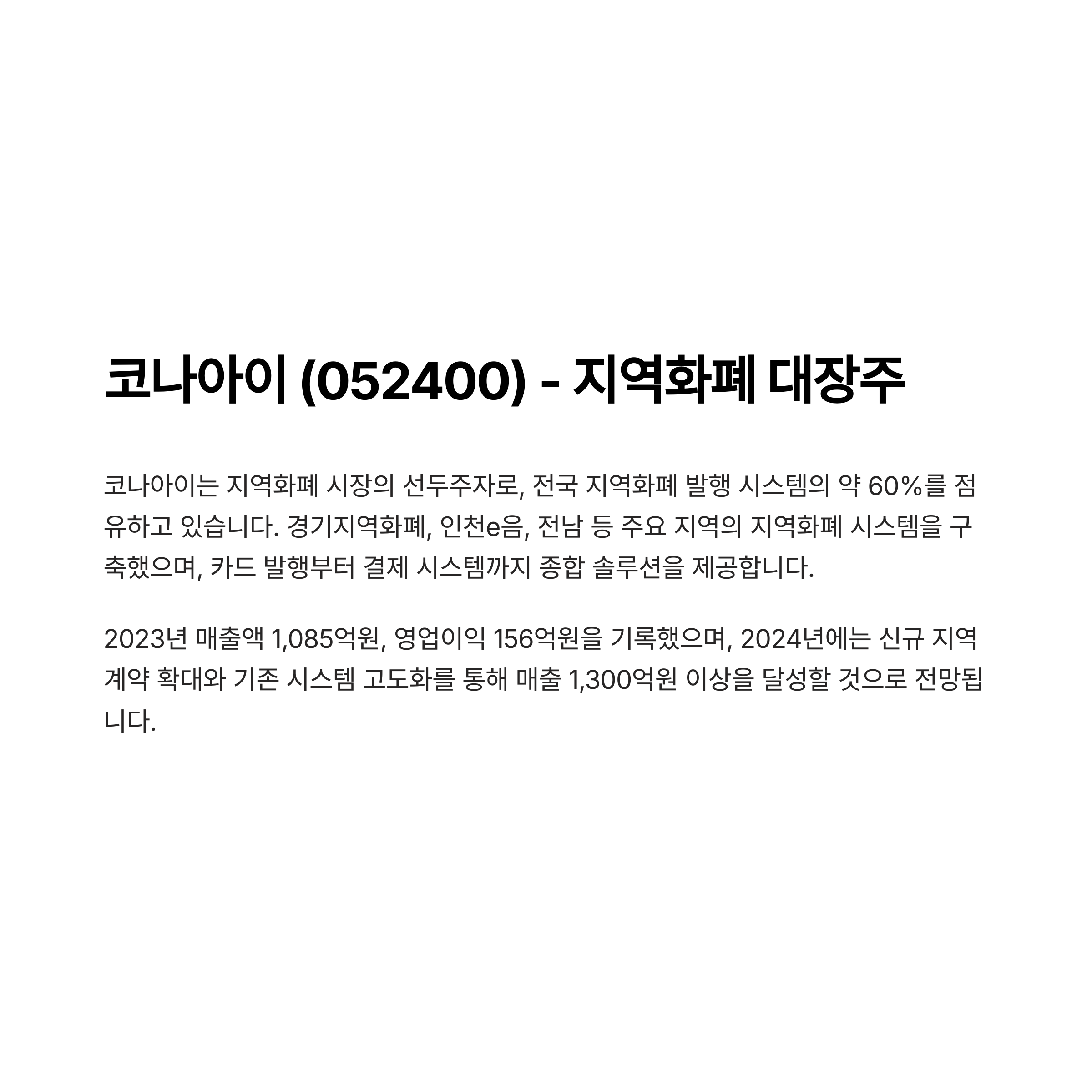 그 외에도 모바일 상품권, 쿠폰 사업을 영위하는 KT알파나, 지역화폐와 연동 가능한 POS(판매시점 정보관리 시스템) 기기 관련 기업들도 시장 확대에 따른 낙수효과를 기대해 볼 수 있습니다. 이러한 기업들은 주가 변동성이 클 수 있지만, 그만큼 높은 수익률을 안겨줄 '히든 챔피언'이 될 수 있습니다.