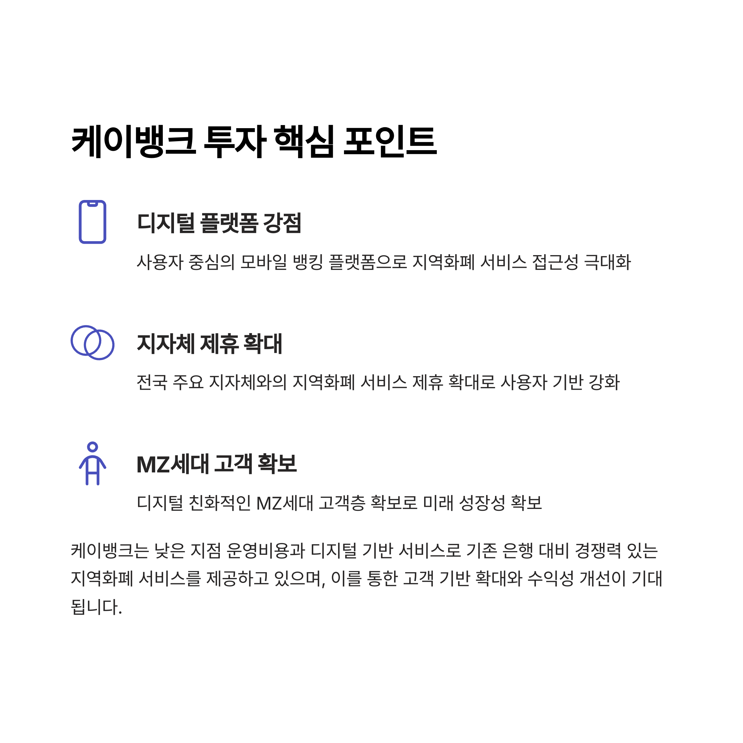 을 원하는 투자자에게 매력적인 선택지가 될 수 있습니다. KT의 지역화폐 사업은 AI, 클라우드 등 B2B 사업과의 시너지 효과도 기대할 수 있습니다.