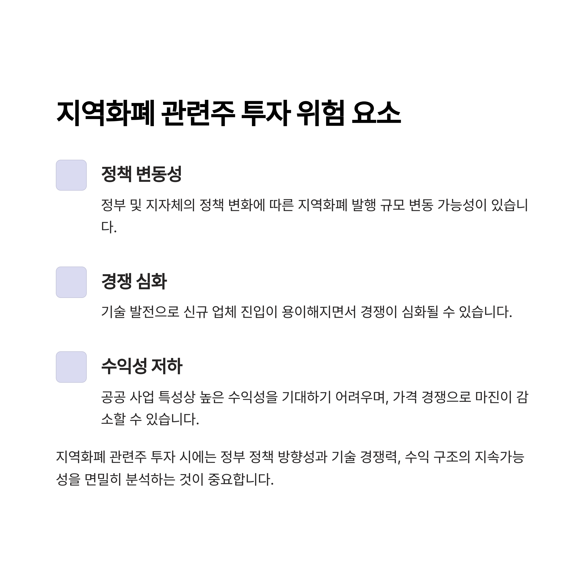지역화폐 관련주의 가장 큰 리스크는 정책의 비일관성입니다. 정권이 바뀌거나 정부의 재정 기조가 변하면 관련 예산이 급격히 축소될 수 있습니다. 투자 시에는 항상 관련 뉴스, 국회 예산 심의 과정 등을 면밀히 모니터링하고, 급격한 정책 변화 시나리오에 대비한 손절 라인을 명확히 설정해 두는 것이 필수입니다.
