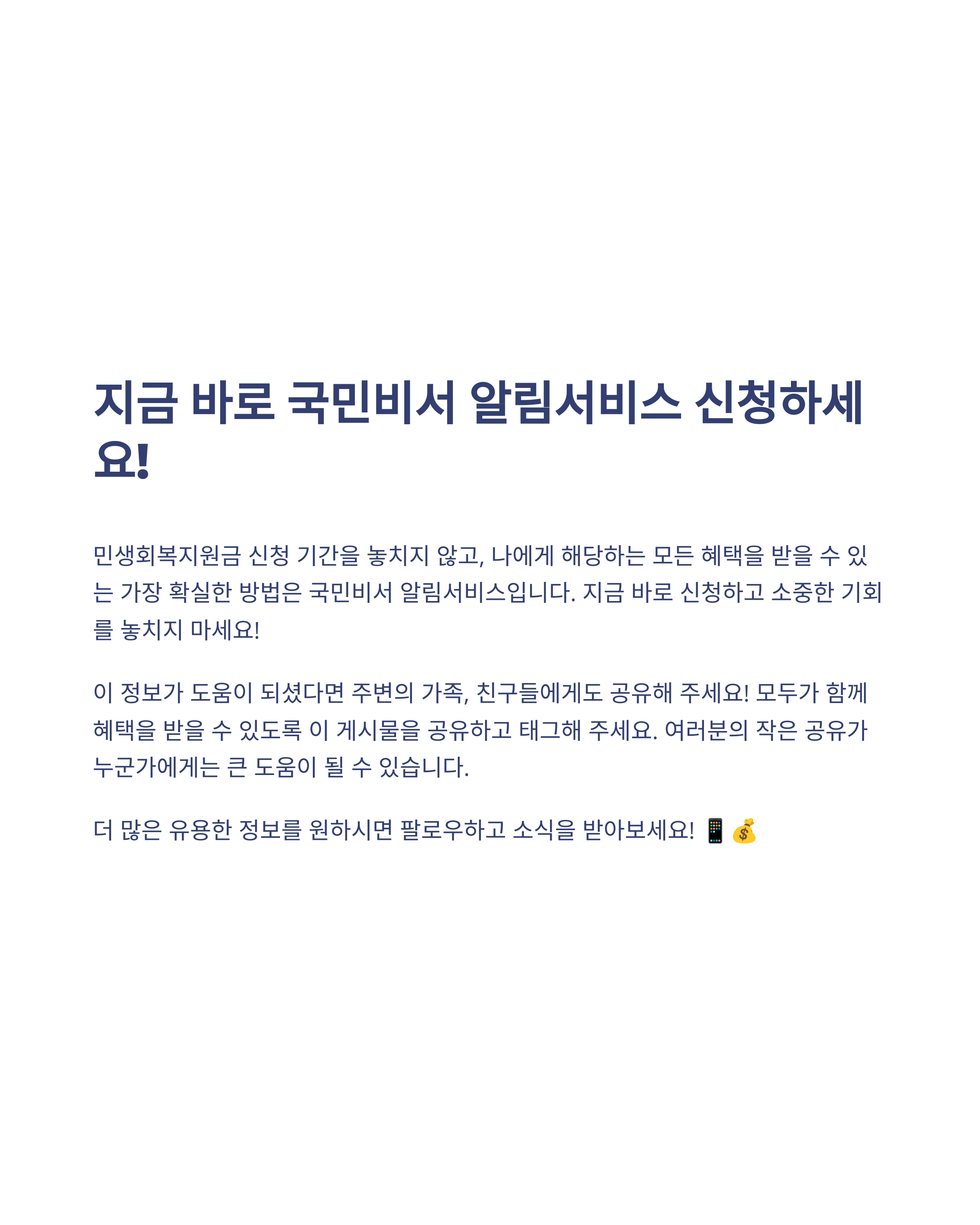 어르신이나 정보 접근성이 낮은 가족 구성원이 있다면, 국민비서 알림서비스를 대신 신청해드리고 민생회복지원금 등 중요한 정보를 함께 확인해드리는 것을 고려해보세요. 가족 모두가 혜택을 빠짐없이 받을 수 있도록 돕는 좋은 방법입니다.