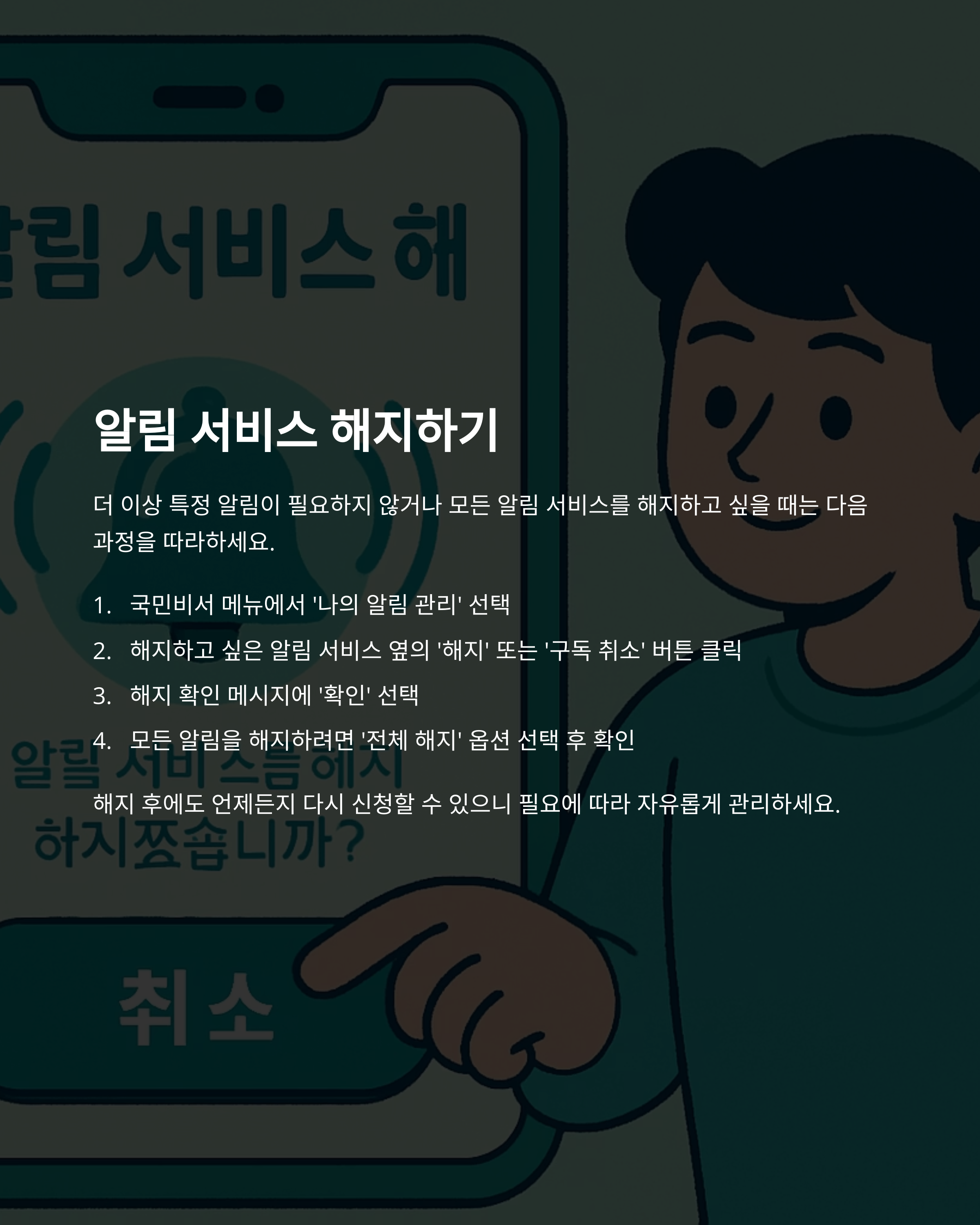 국민비서는 민생회복지원금 외에도 수십 가지의 알림 서비스를 제공합니다. 모든 알림을 받을 필요는 없으니, "나에게 꼭 필요한 정보"만 선택하여 설정하는 것이 중요합니다. 불필요한 알림은 꺼두고, 정말 중요한 정보에 집중함으로써 정보 피로도를 줄일 수 있습니다.
