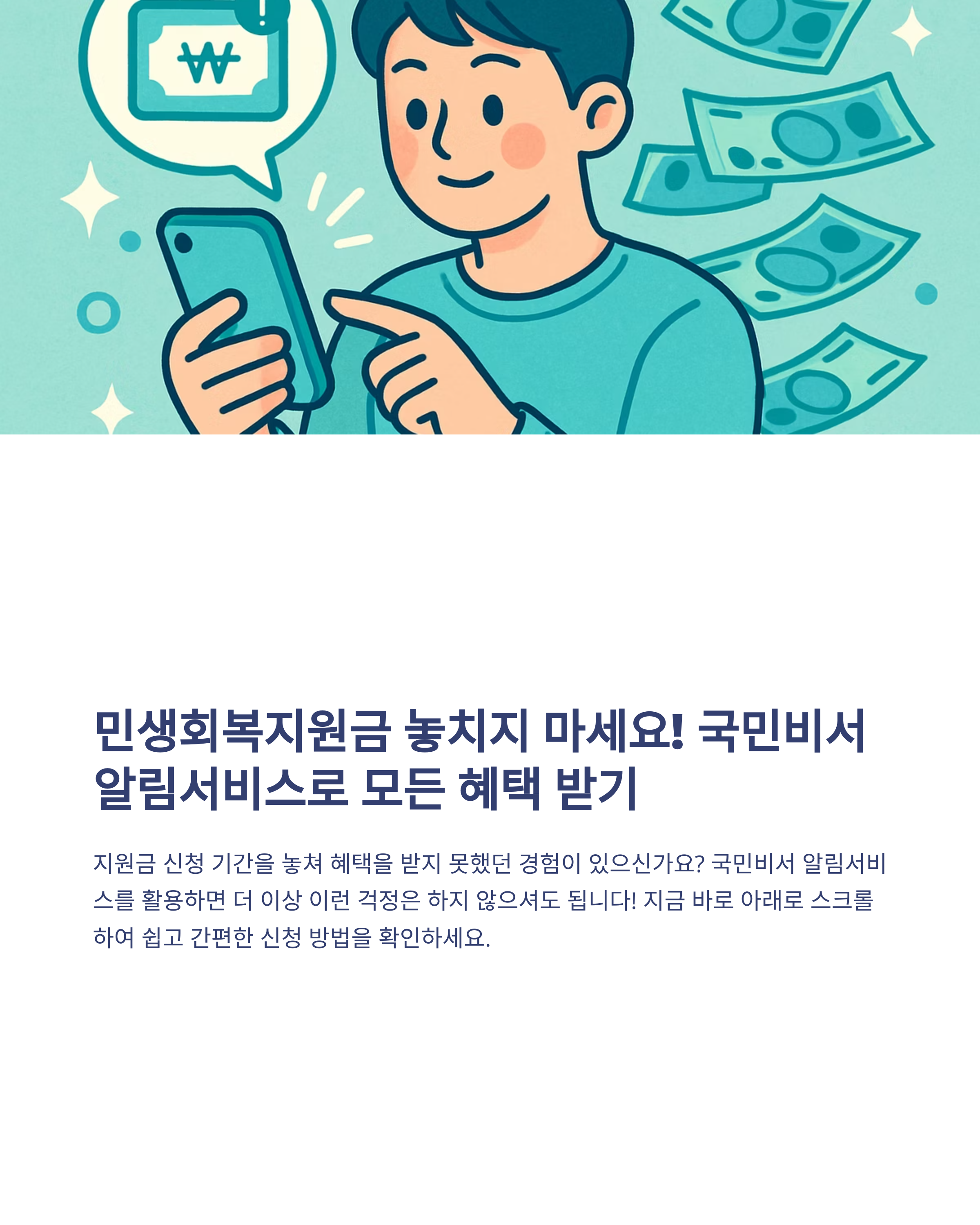 코로나19 팬데믹 이후 침체된 경제를 회복시키기 위해 정부가 시행하는 "민생회복지원금"은 많은 국민들에게 큰 도움이 될 것으로 기대됩니다. 하지만 복잡한 신청 절차나 시기를 놓쳐서 혜택을 받지 못하는 경우가 종종 발생하곤 합니다. 이런 걱정, 이제 국민비서 알림서비스가 해결해 드립니다! 이 글에서는 국민비서 알림서비스를 통해 민생회복지원금 정보를 놓치지 않고, 스마트하게 신청하는 최신 방법을 자세히 알려드립니다. 더 이상 불안해하지 마세요. 지금 바로 국민비서와 함께 소중한 지원금을 챙겨보세요!
