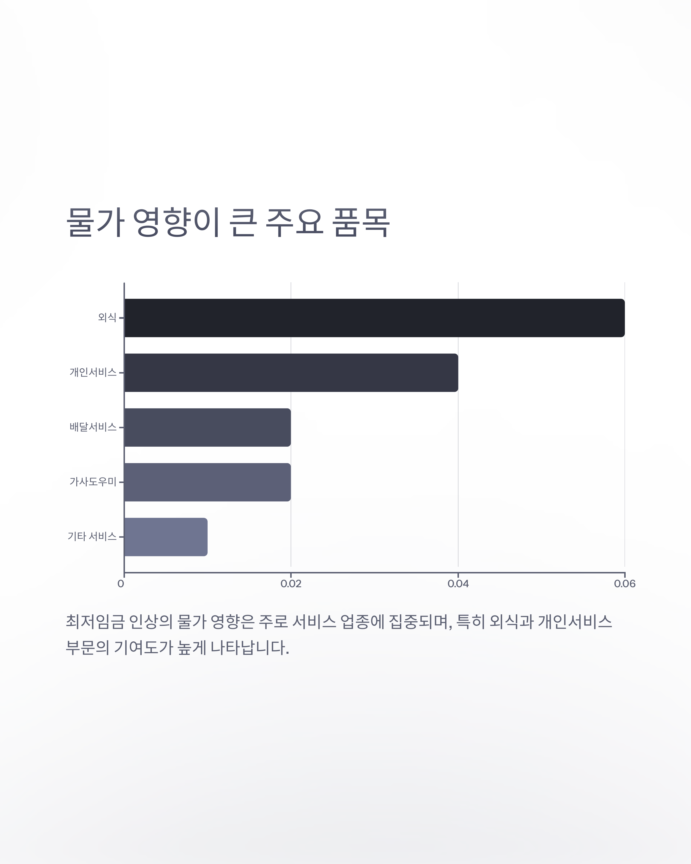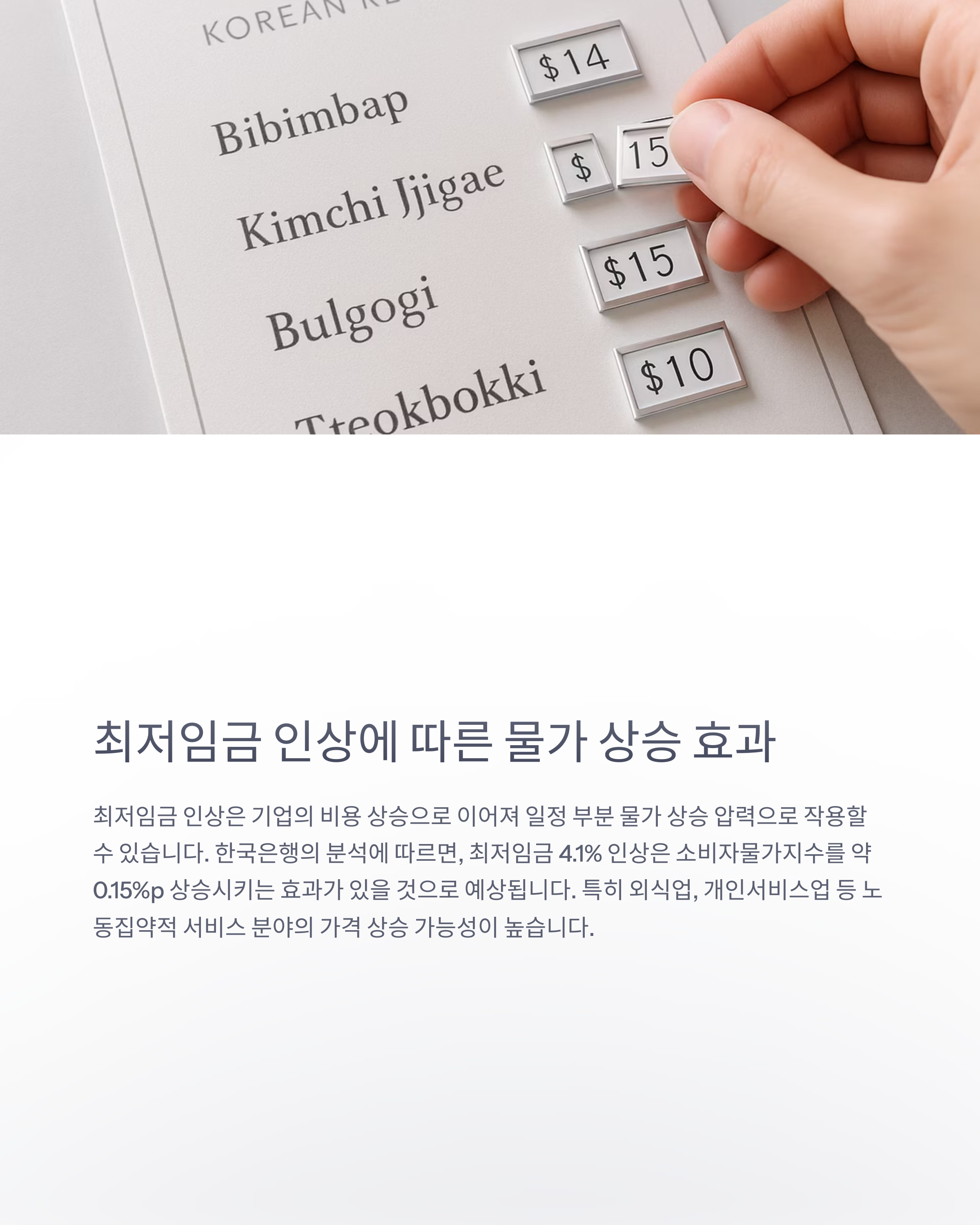 최저임금 인상은 인건비 상승을 통해 생산 비용을 증가시키고, 이는 최종 소비재 가격 인상으로 이어져 물가 상승 압력을 가할 수 있습니다. 특히 최저임금의 영향을 많이 받는 외식, 숙박, 소매업 등 서비스 분야에서 가격 인상이 두드러질 수 있습니다. 다만, 과거 최저임금 인상률과 물가 상승률의 관계를 보면 인과관계가 명확하지 않은 경우도 많아, 다른 경제 변수들과 함께 종합적으로 고려해야 합니다. 높은 물가 상승은 결국 실질 임금의 구매력을 다시 약화시킬 수 있다는 점도 간과해서는 안 됩니다.