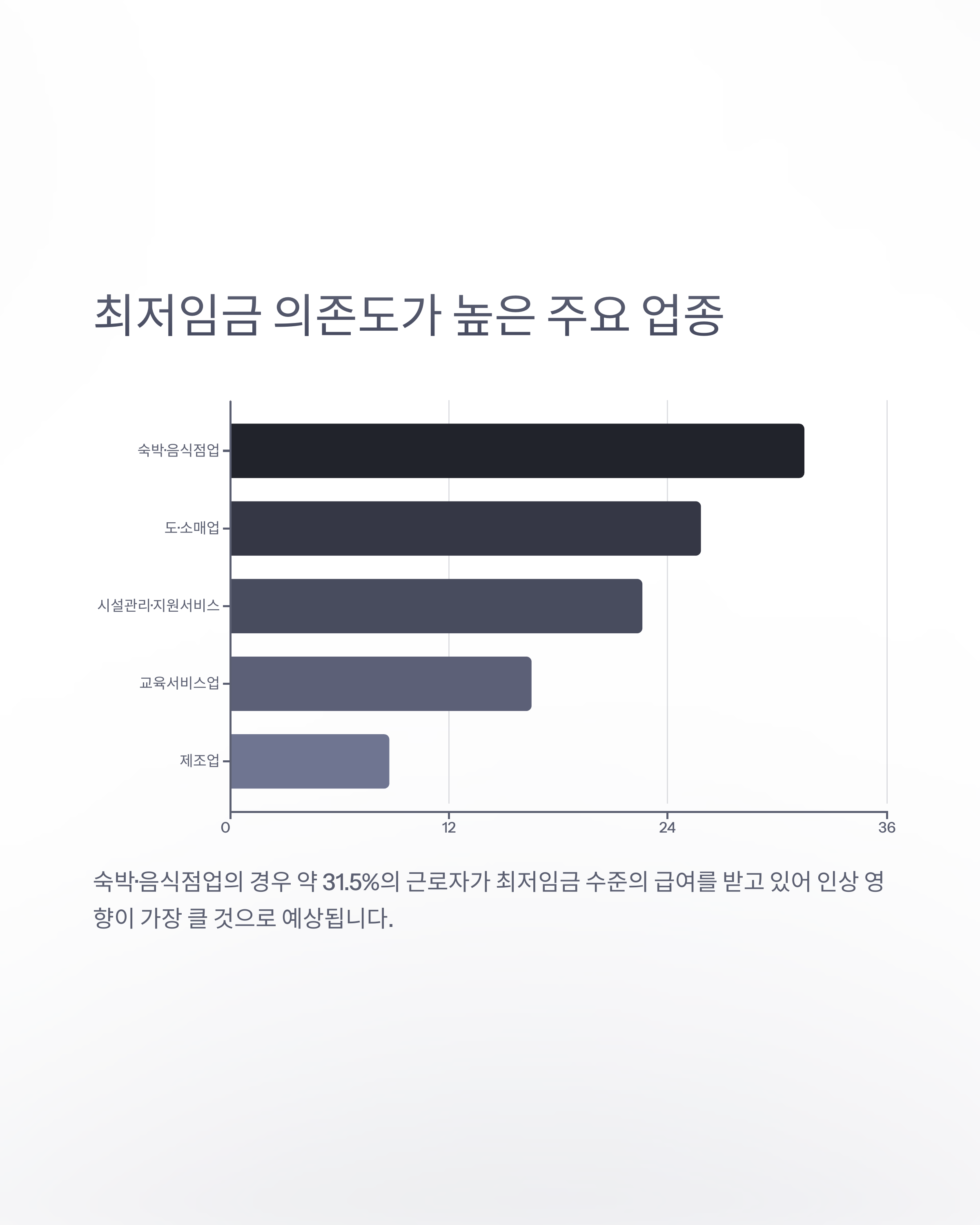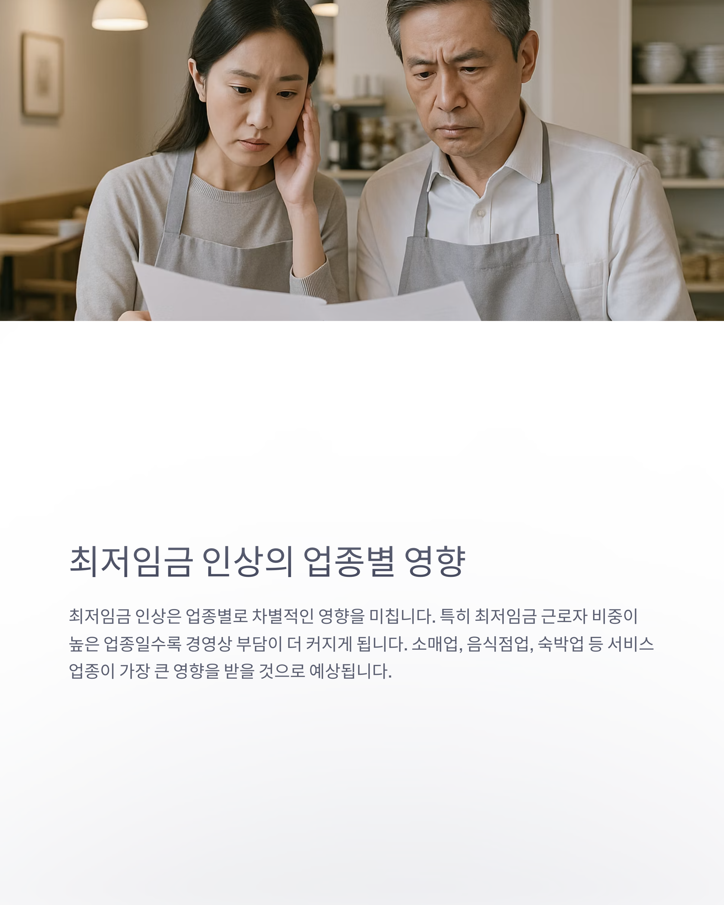 최저임금 인상에 따른 영향은 업종별로 상이하게 나타납니다. 인건비 비중이 높고 생산성 향상이 어려운 업종(예: 음식점, 소매업, 숙박업 등)은 더 큰 타격을 받을 수 있으므로, 정부의 업종별 맞춤형 지원책 마련이 중요합니다.