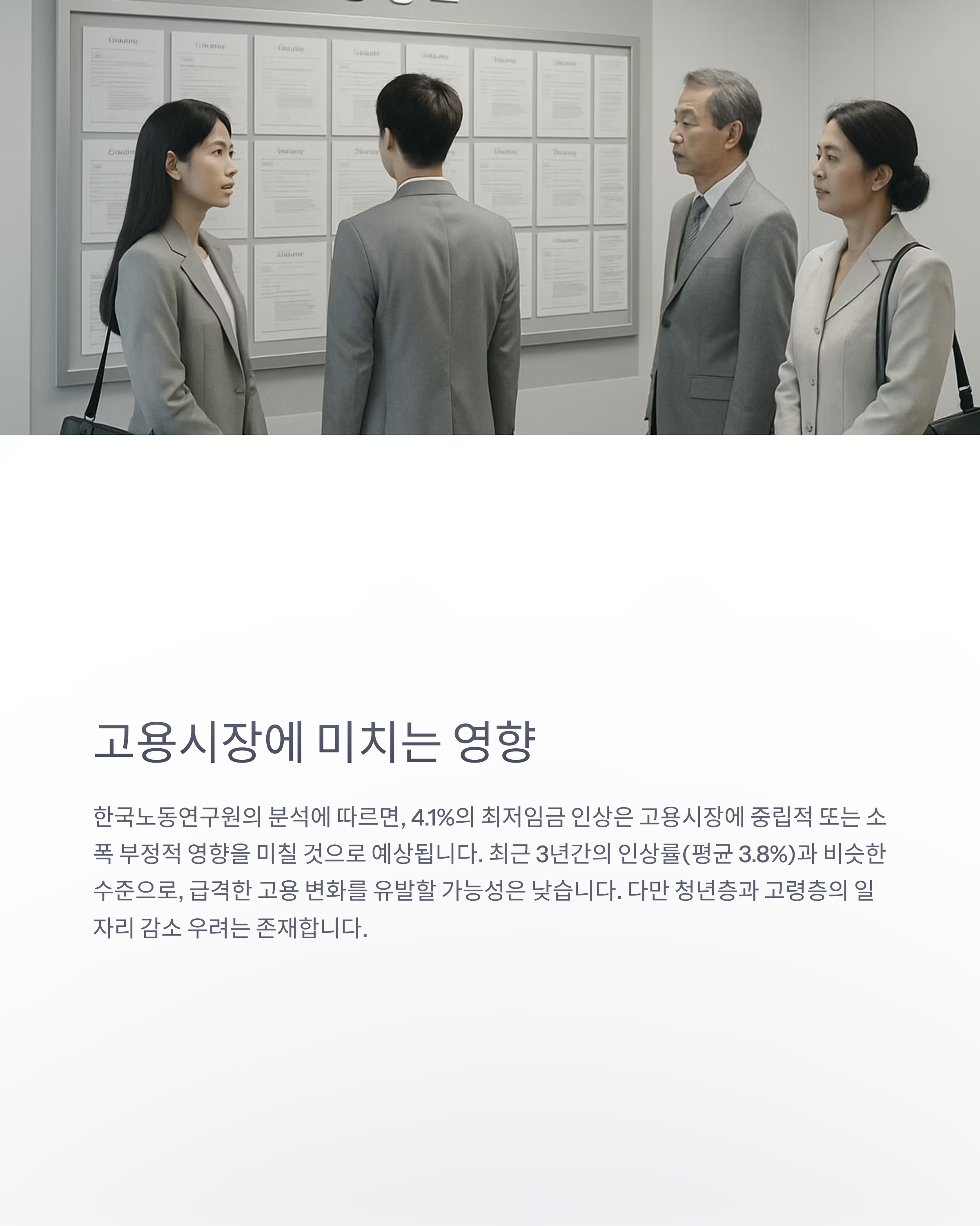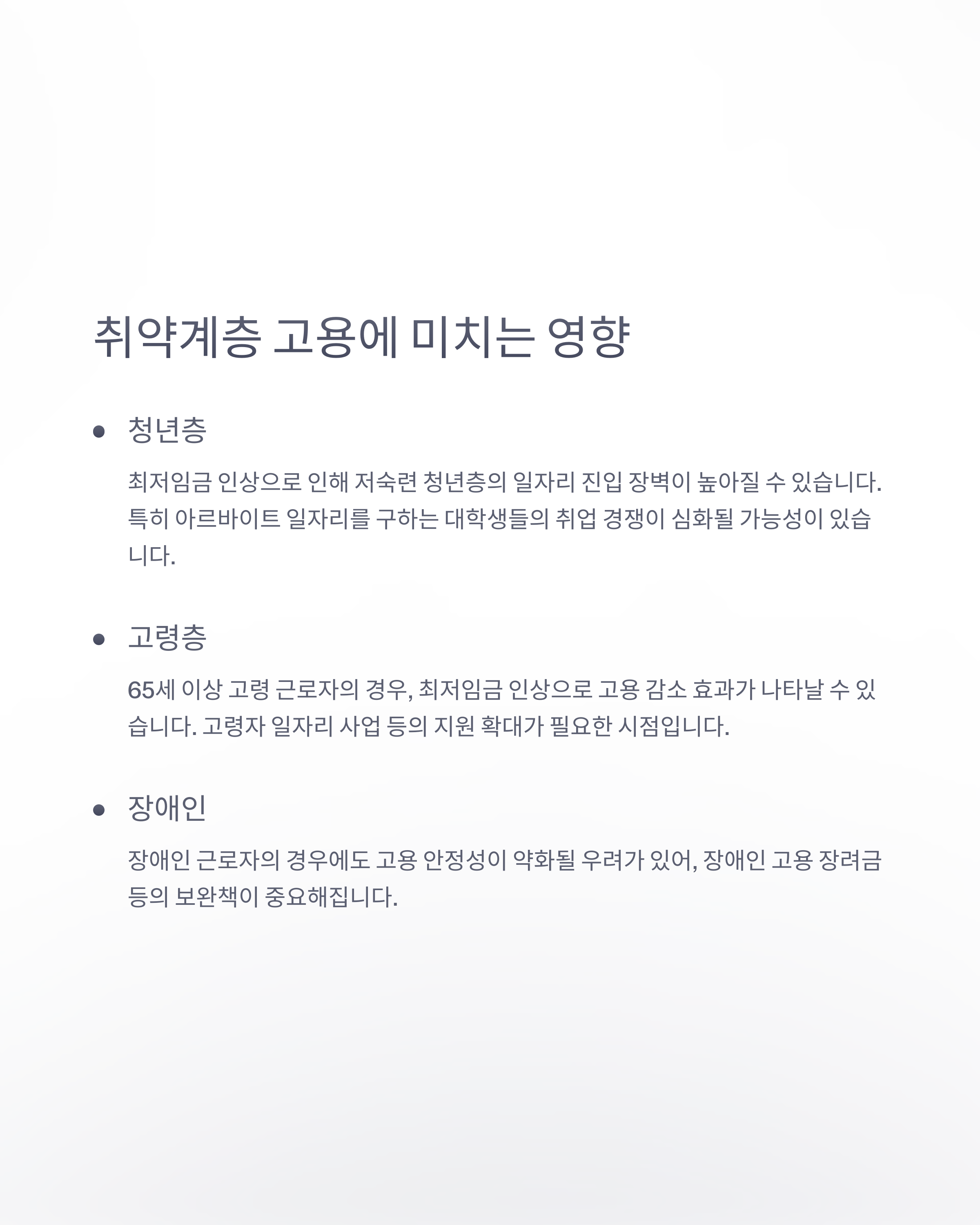 청년층은 진입 장벽이 낮은 일자리에서 최저임금을 받는 경우가 많아, 인건비 상승에 따른 채용 감소에 가장 민감하게 반응할 수 있습니다. 기업들이 신규 채용을 줄이거나, 자동화 투자를 늘리면서 청년층의 일자리 기회가 줄어들 가능성이 있습니다. 마찬가지로 은퇴 후 재취업을 통해 최저임금 수준의 일자리에 종사하는 고령층 역시, 인건비 부담으로 인한 기업의 고용 회피 대상이 될 수 있습니다. 이는 사회적 약자 계층의 경제 활동 참여를 위축시킬 수 있다는 우려를 낳습니다. 제가 직접 해보니, 주변 청년 구직자들 사이에서는 최저임금 인상 소식에 기대감도 있지만, 동시에 일자리 구하기가 더 어려워지는 것은 아닌지 걱정하는 목소리도 있었습니다.