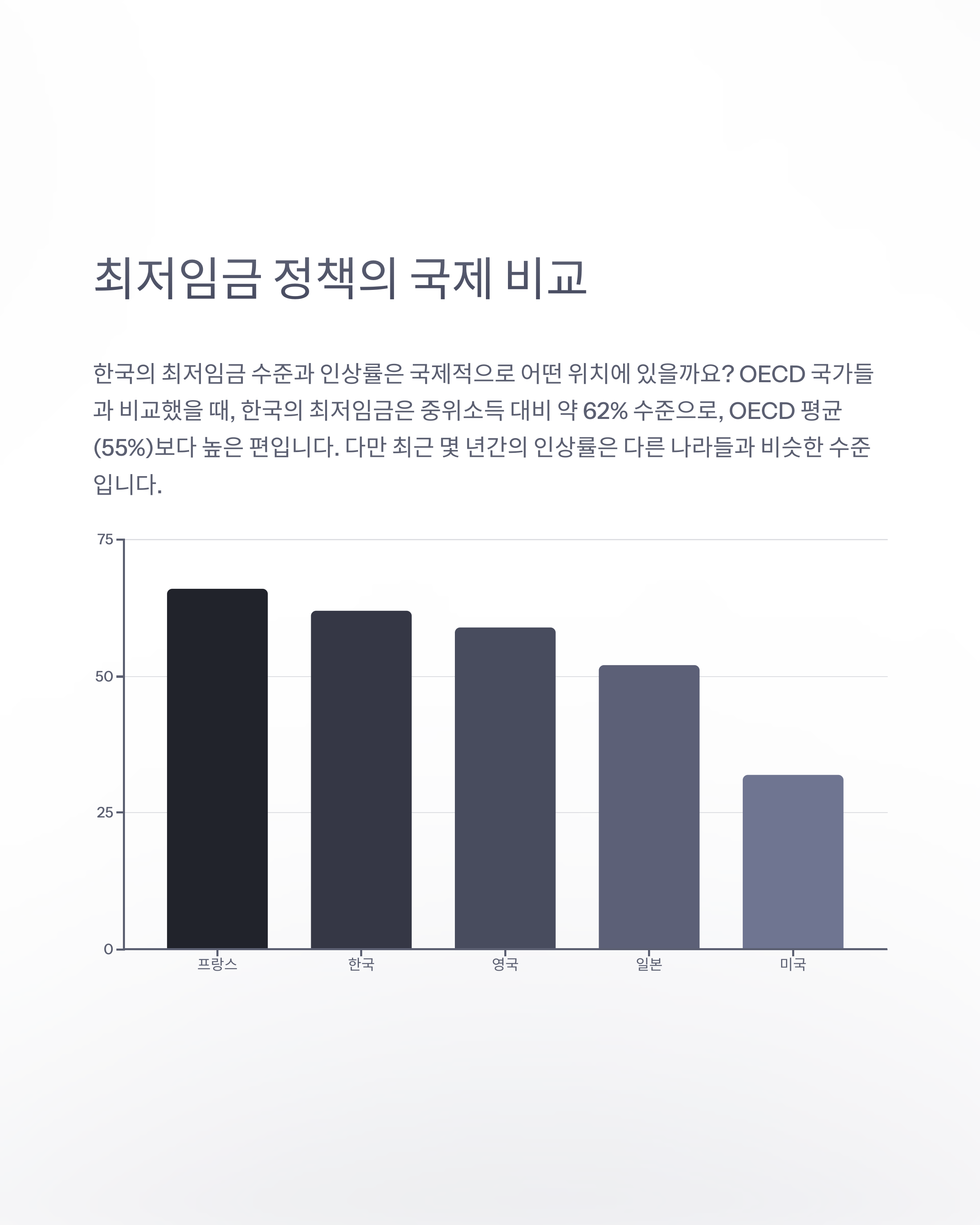 최저임금 인상과 그에 따른 경제적 파장은 비단 한국만의 문제는 아닙니다. 주요 선진국들은 저마다의 방식으로 최저임금 제도를 운영하고 있으며, 그들의 경험을 통해 우리는 2026년 최저임금 인상 효과에 대한 시사점을 얻을 수 있습니다.