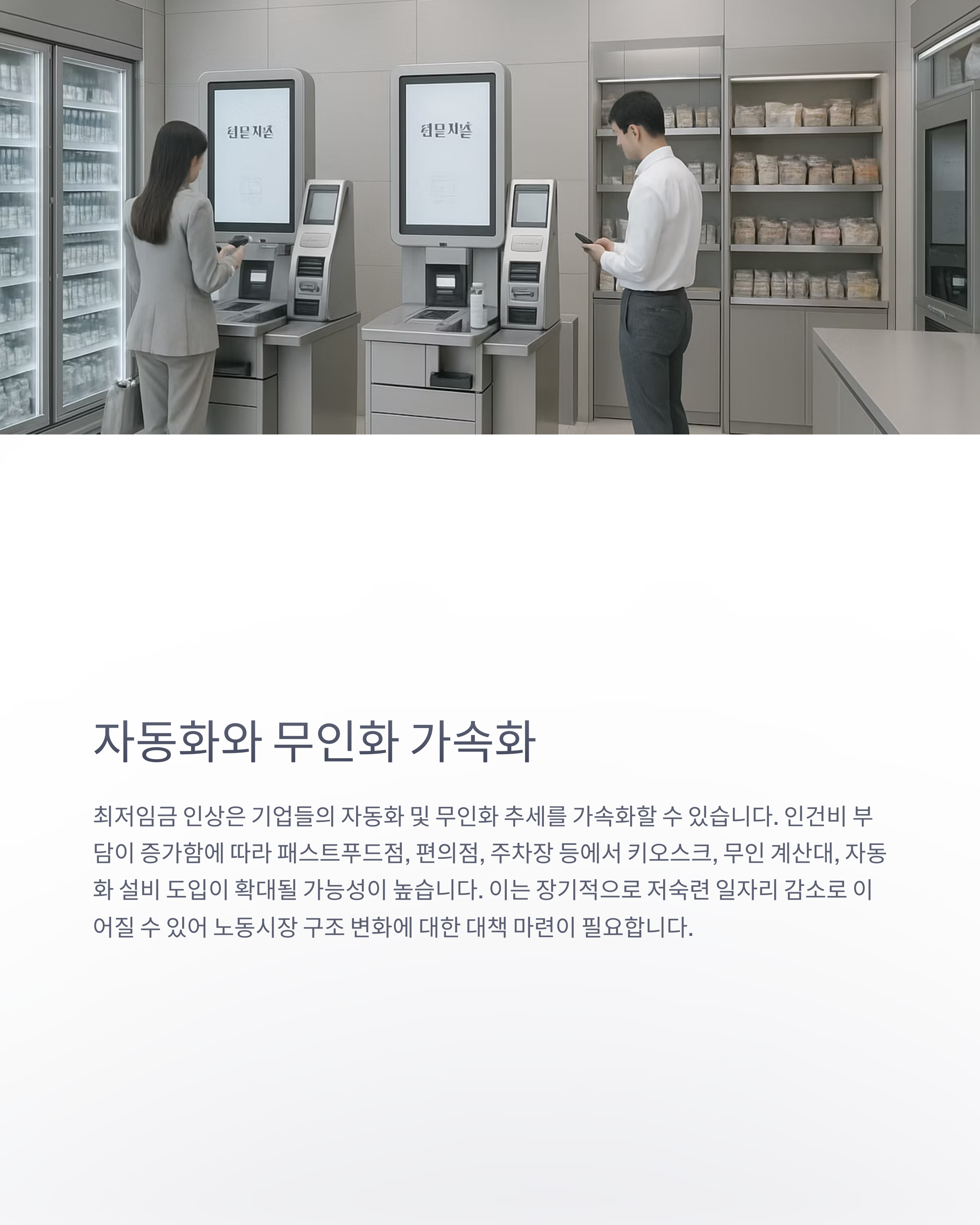 최저임금이 시급 10,440원으로 인상될 경우, 최저임금 근로자를 고용하고 있는 기업들은 인건비 지출이 증가하게 됩니다. 특히 인건비 비중이 높은 서비스업, 영세 제조업 등에서는 경영 압박이 더욱 커질 수 있습니다. 이는 수익성 악화로 이어져 신규 채용 축소, 기존 인력 감축, 또는 자동화 도입 가속화 등 고용 시장에 부정적인 영향을 미 미칠 수 있다는 우려가 제기됩니다.