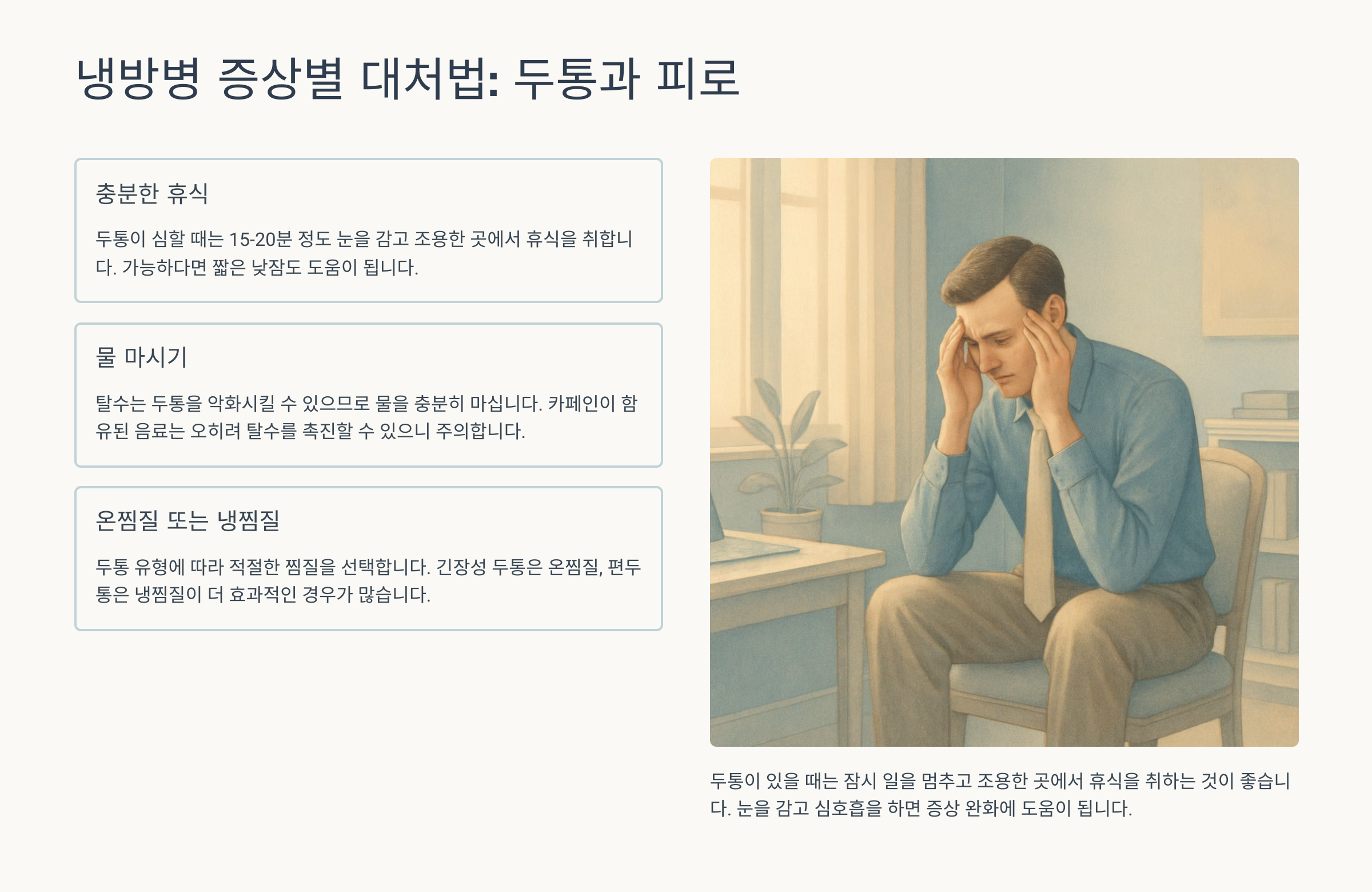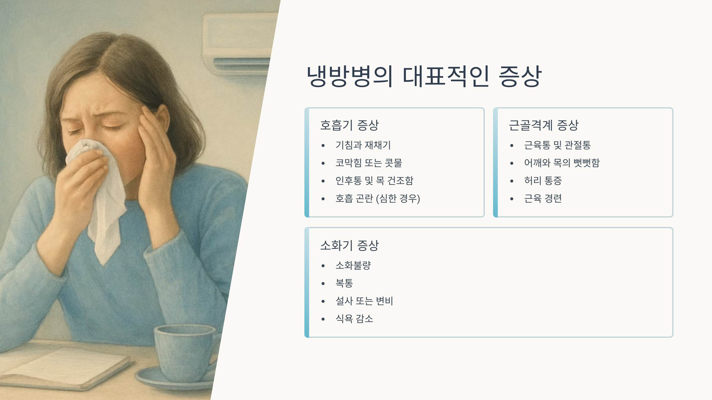 냉방병은 일반적인 감기와 유사한 증상을 보이므로 구별하기 어려울 수 있습니다. 마치 감쪽같은 위장술처럼 우리 몸을 혼란스럽게 만들죠. 주요 증상들은 다음과 같습니다.