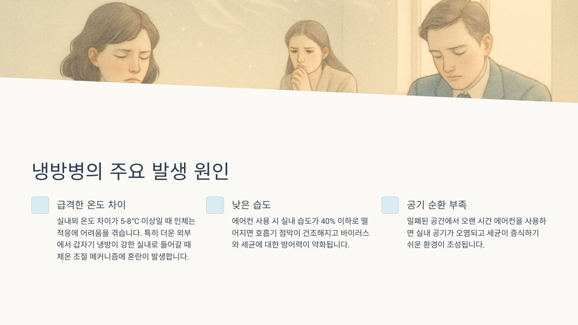 냉방병의 주요 원인은 다음과 같습니다. 우리가 여름철에 흔히 하는 행동들이 냉방병을 유발하는 주범이 될 수 있다는 사실, 알고 계셨나요?