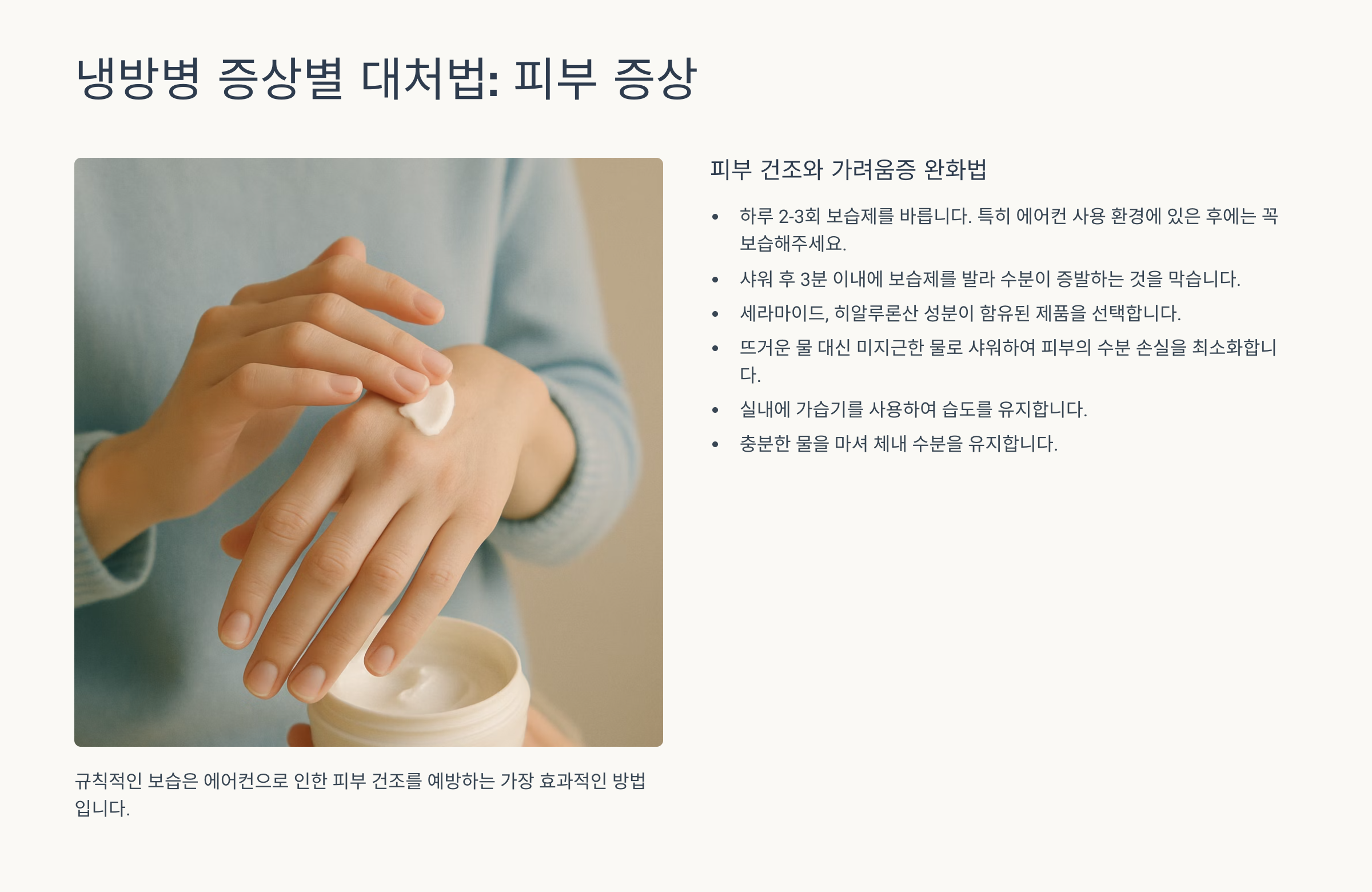 - 피부 건조: 에어컨은 실내 습도를 낮추기 때문에 피부가 건조해지고 푸석해질 수 있습니다. 수분 크림을 발라도 건조함이 가시지 않는다면 냉방병을 의심해 보세요.