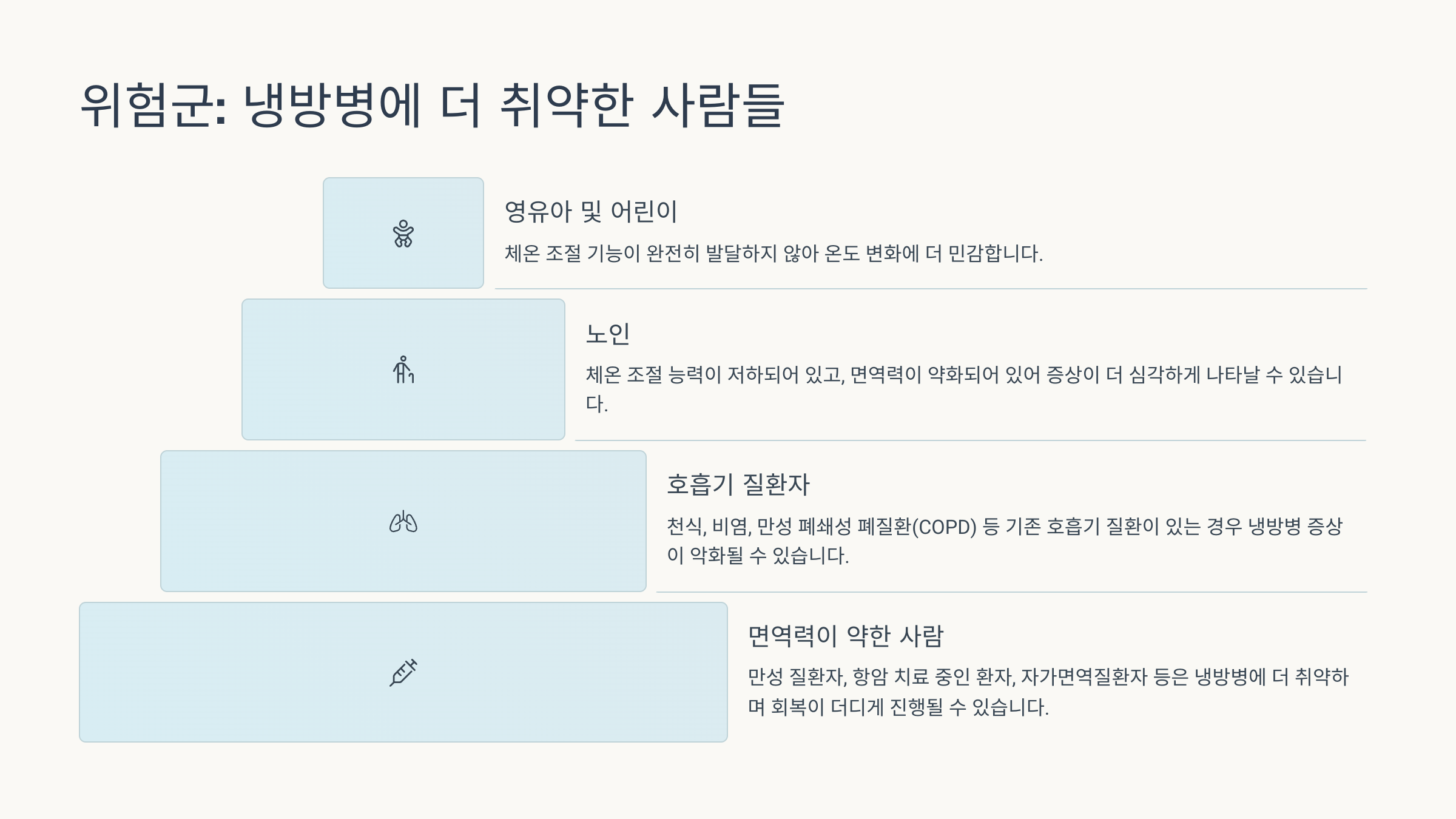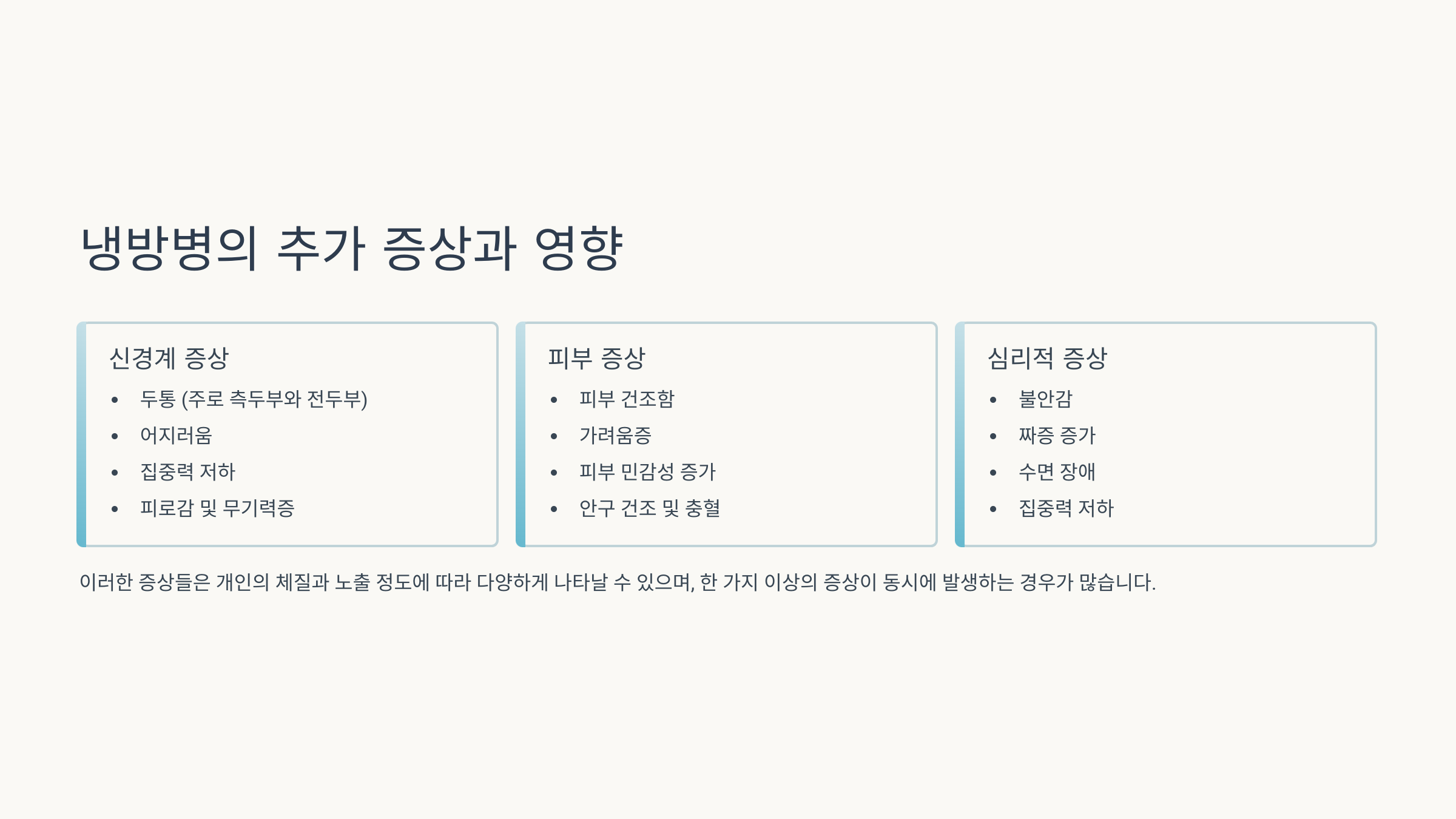 - 피로감, 졸음, 집중력 저하: 몸의 에너지가 체온 유지에 과도하게 소모되면서 나타나는 증상입니다. 만성 피로와 헷갈릴 수 있습니다.