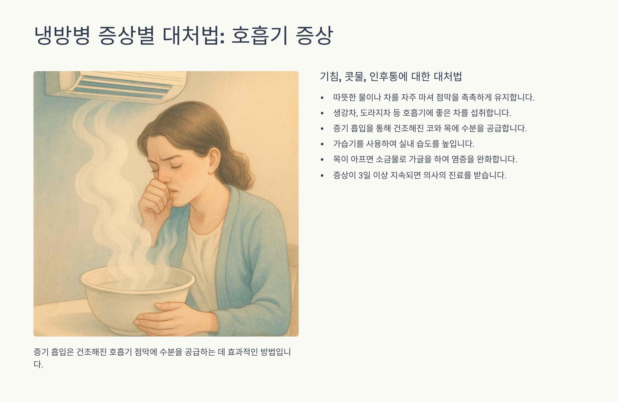 - 목 통증, 기침: 건조하고 차가운 공기로 인해 기관지가 건조해지고 자극받아 발생할 수 있습니다.