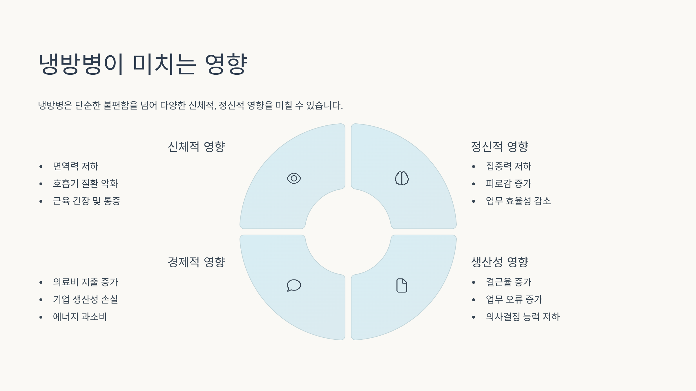 여름철 시원함을 선사하는 에어컨도 잘못 사용하면 '냉방병'을 유발할 수 있습니다. 냉방병은 과도한 냉방으로 인해 우리 몸의 자율신경계가 균형을 잃으면서 발생하는 다양한 증상들을 말합니다. 시원하다고 무작정 에어컨을 틀었다간, 오히려 건강을 해칠 수 있습니다. 지금부터 냉방병의 모든 것을 파헤쳐 보고, 올여름 건강하게 나기 위한 특급 비법을 알려드릴게요!