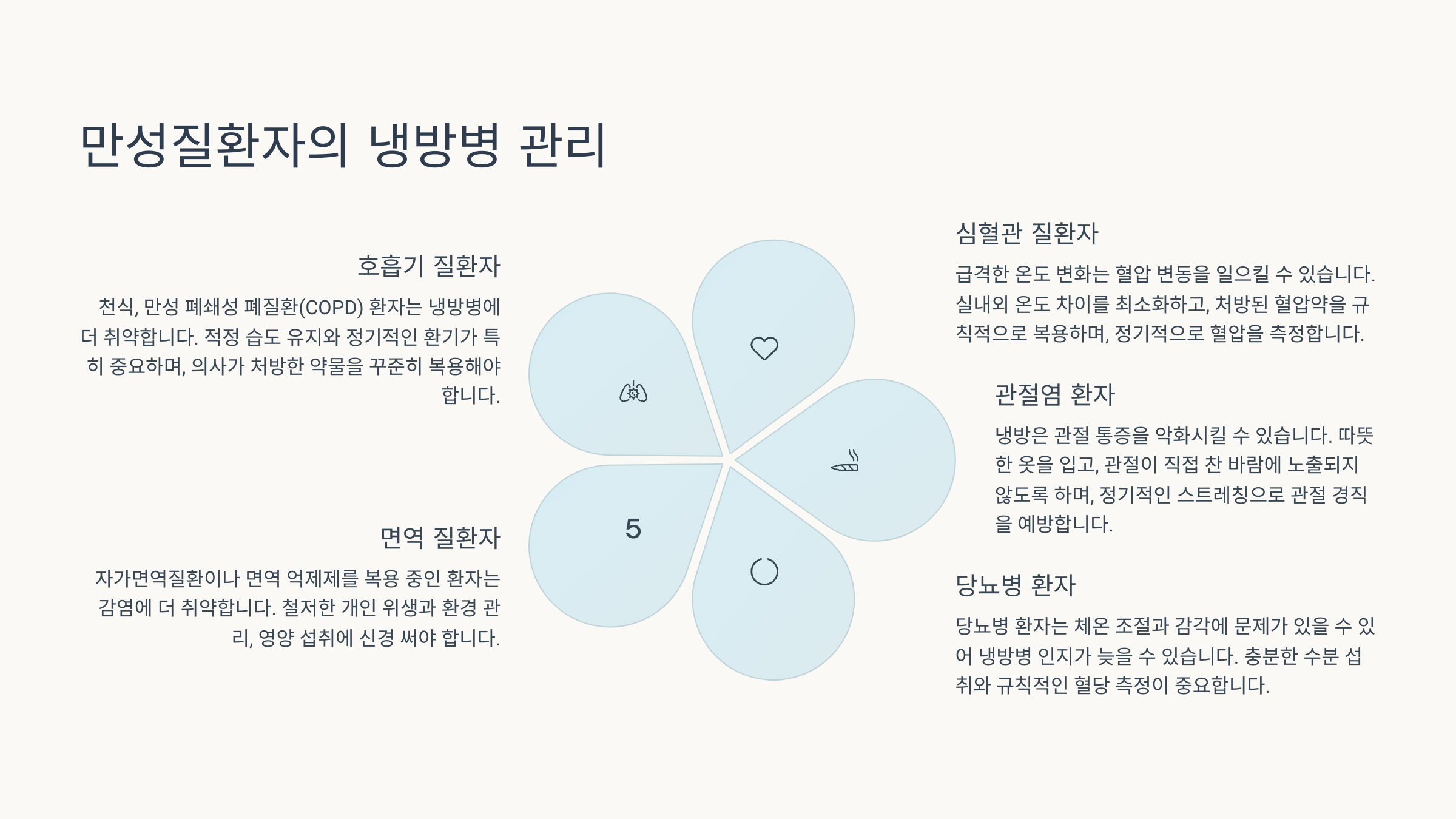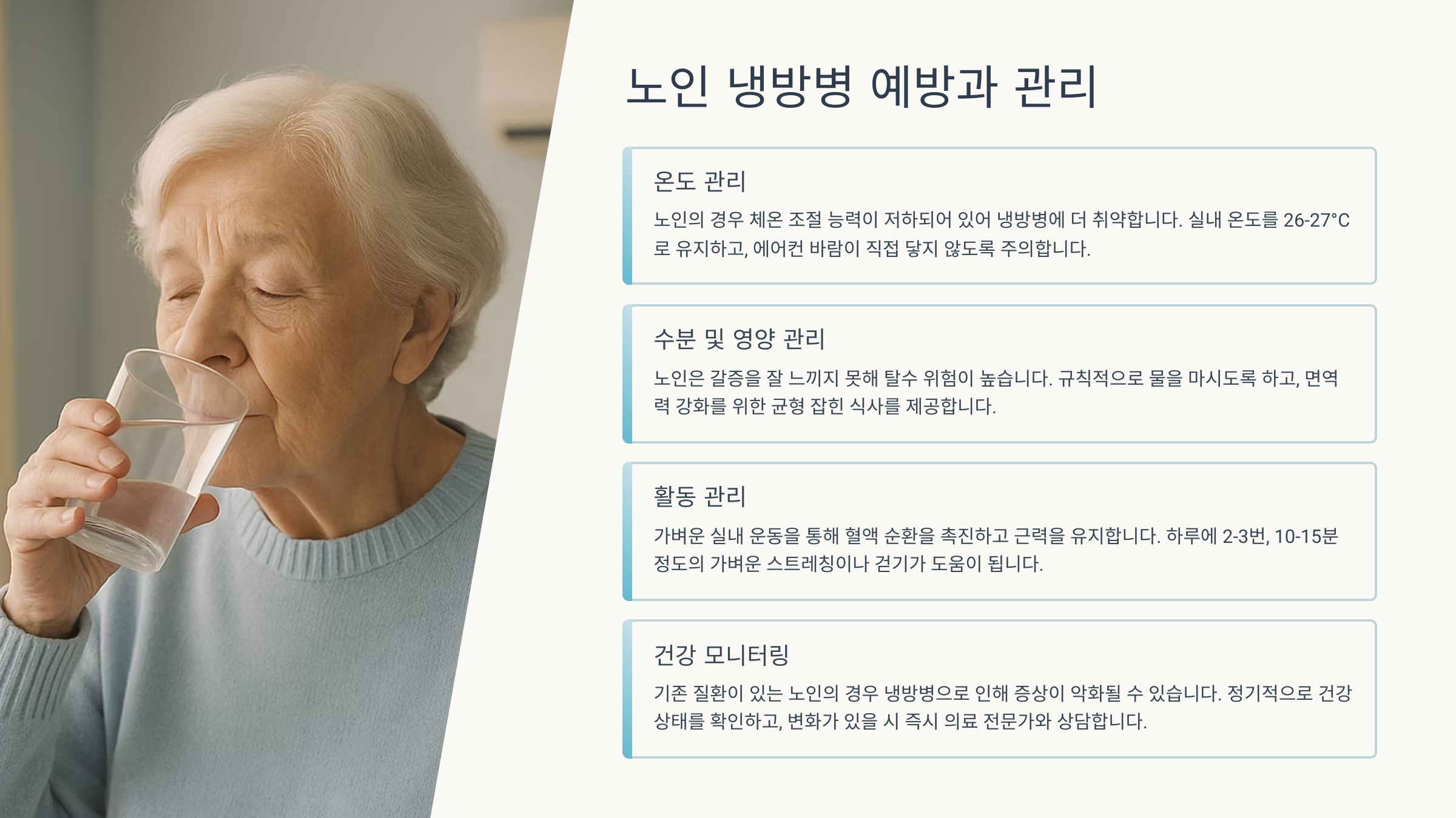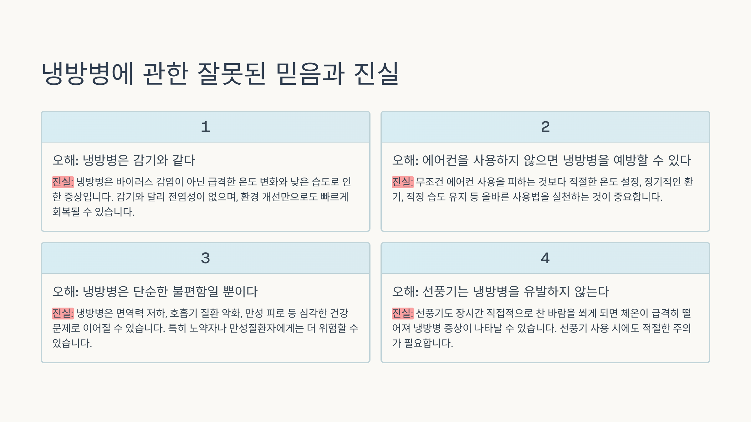 진실: 에어컨이 주된 원인이지만, 지나치게 낮은 온도의 선풍기 바람, 찬물 샤워, 찬 음식 과다 섭취 등도 냉방병과 유사한 증상을 유발할 수 있습니다. 몸의 체온 조절 능력이 저하되는 것이 핵심 원인이므로, 찬 기운에 몸이 과도하게 노출되는 모든 상황을 주의해야 합니다.
