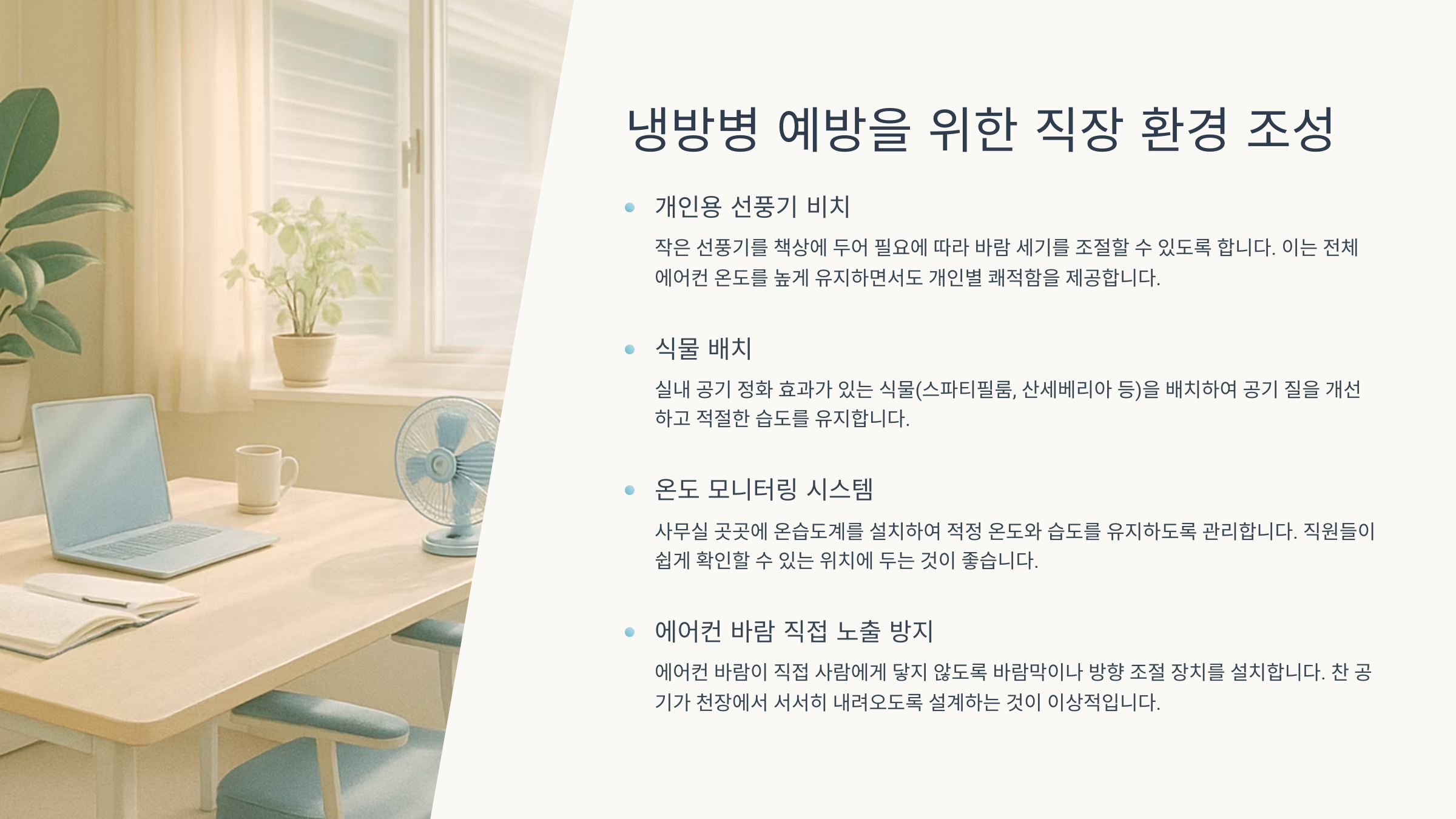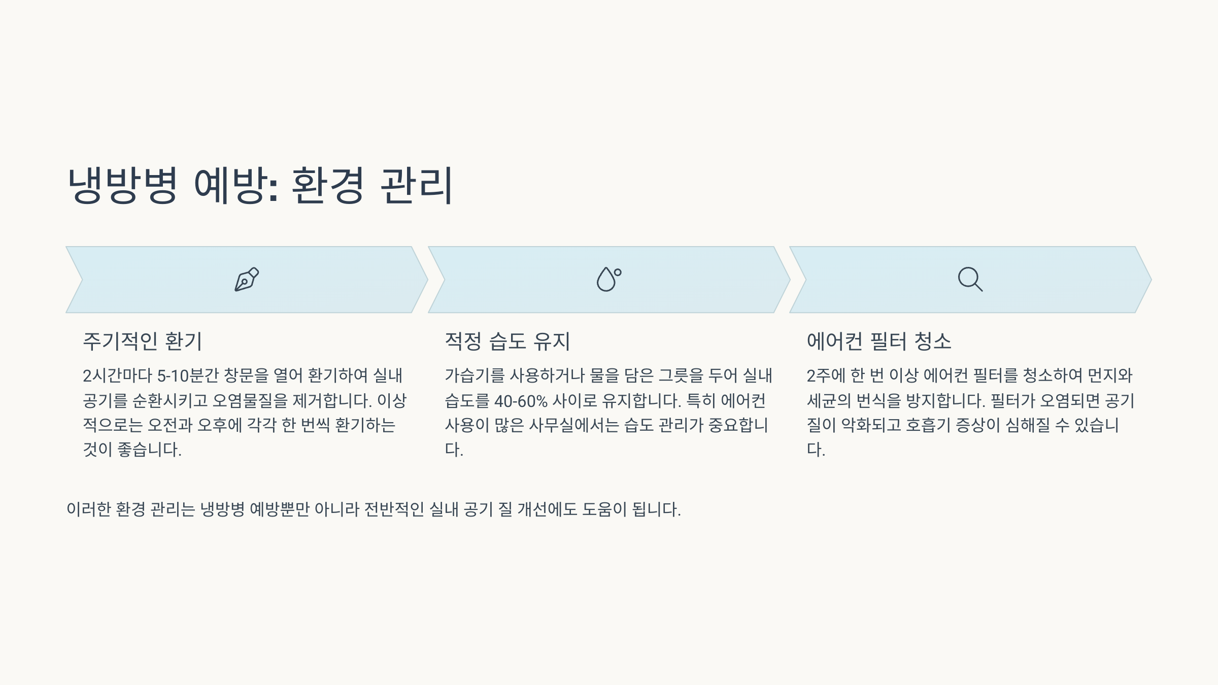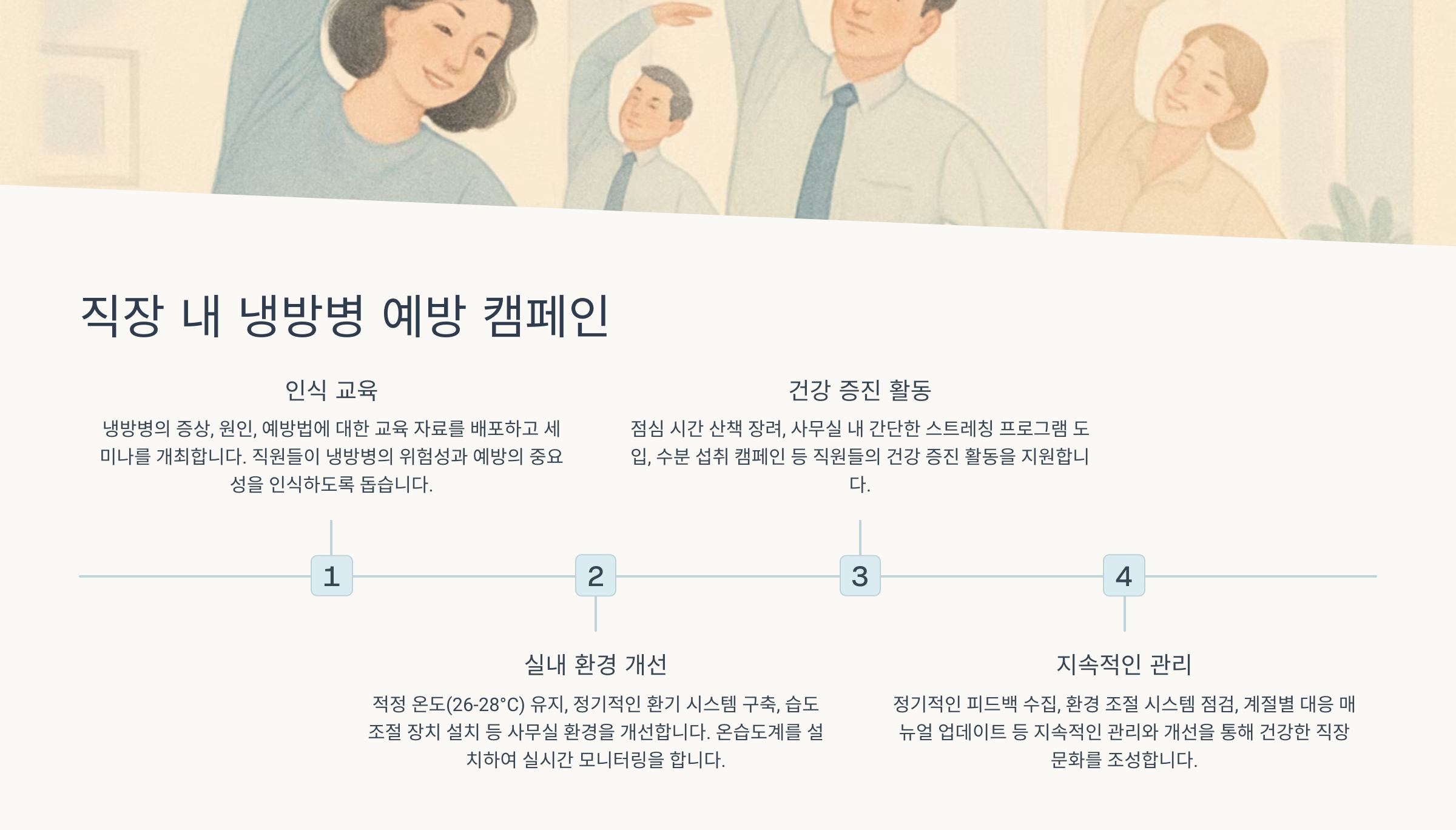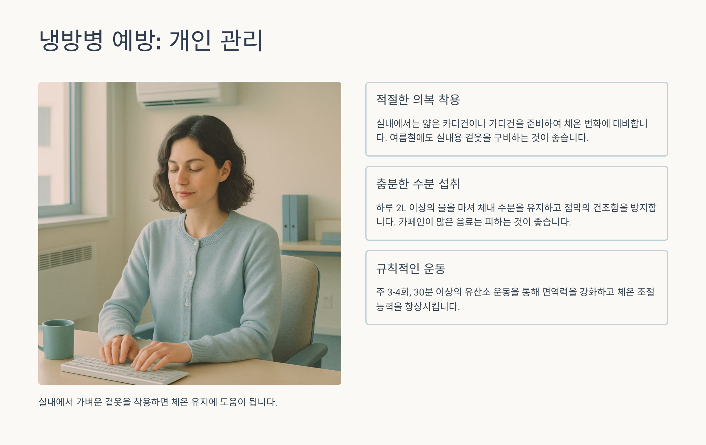 냉방병은 무엇보다 예방이 중요하며, 증상이 나타났을 때는 빠르게 대처하는 것이 좋습니다. 선제적인 대응이 건강을 지키는 지름길입니다!