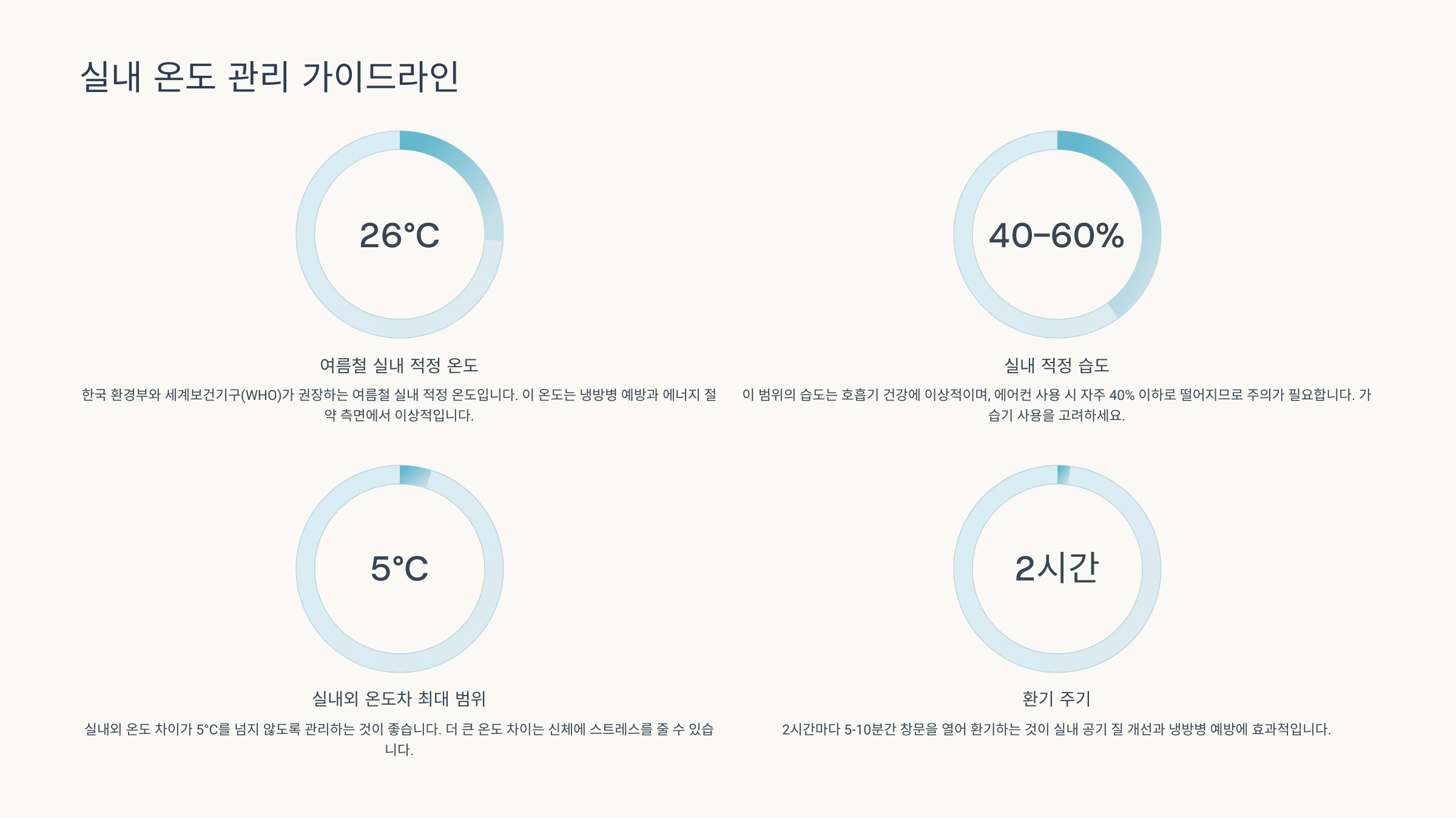 - 26~28℃ 유지: 실내 온도는 26~28℃를 유지하고, 실내외 온도 차이가 5~6℃ 이상 나지 않도록 조절하는 것이 가장 중요합니다. 에어컨 설정 온도를 너무 낮추지 않도록 주의하세요. 냉방 효율을 높이는 동시에 건강을 지키는 황금 온도입니다.