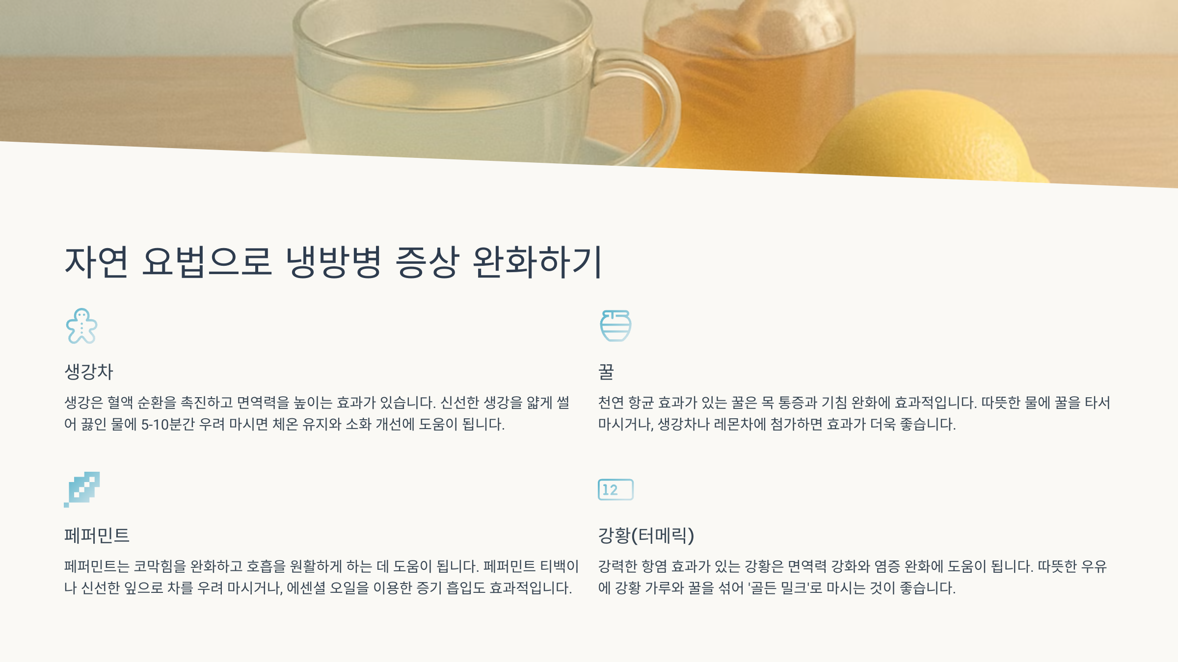 - 생강차, 대추차: 몸을 따뜻하게 하고 혈액 순환을 돕습니다.