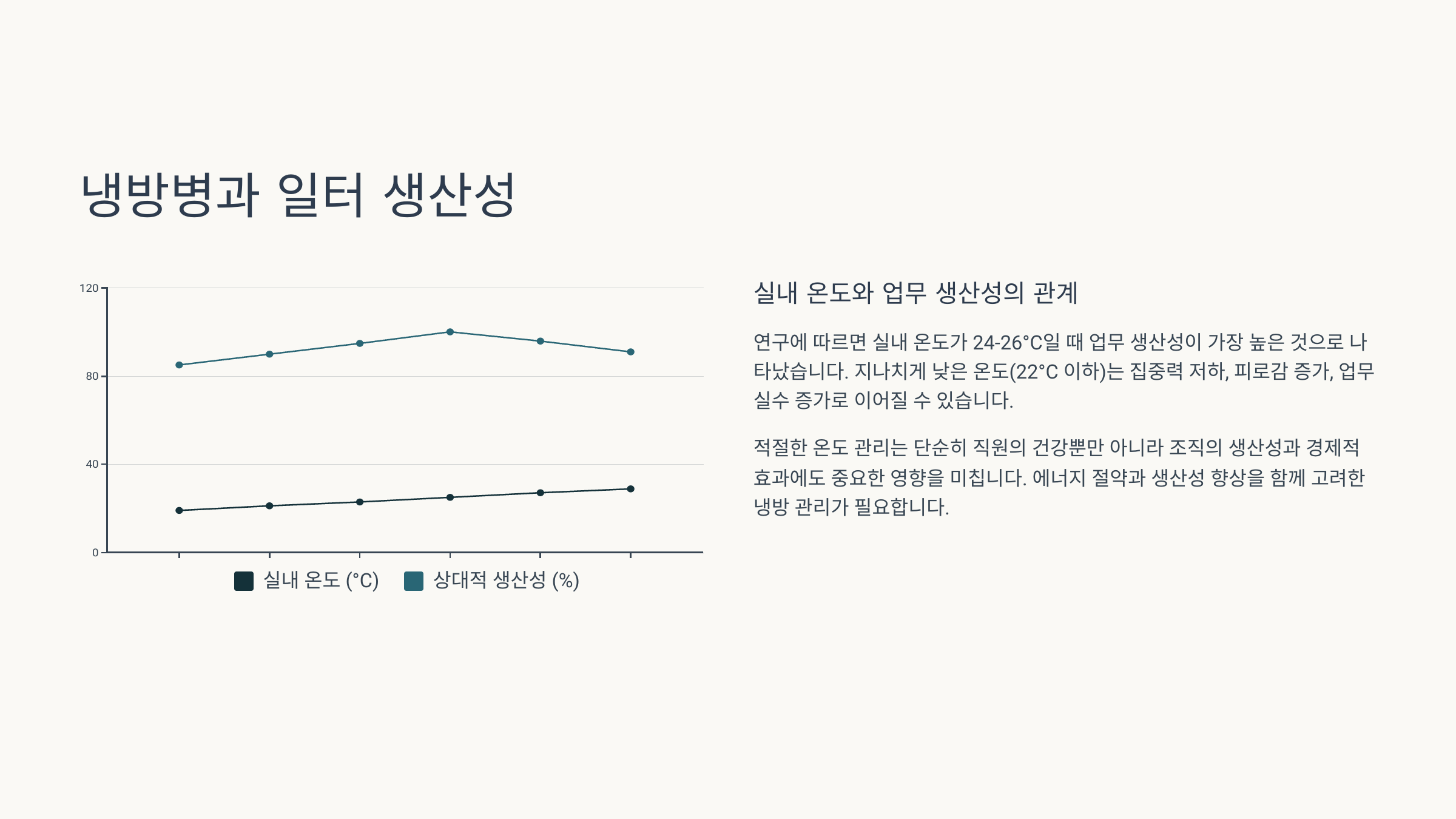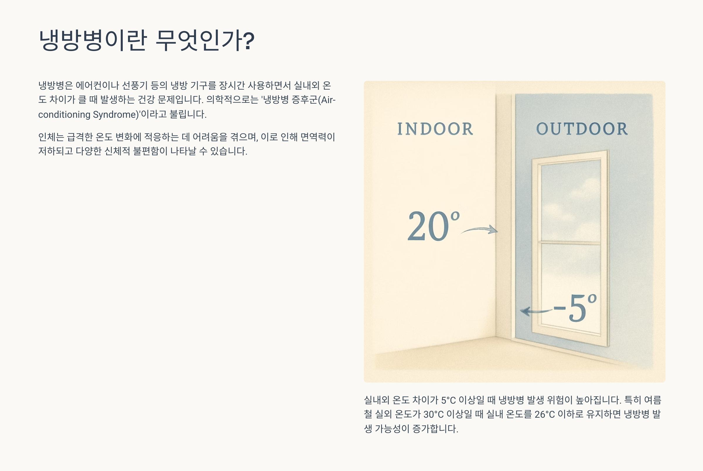 우리 몸은 외부 기온에 적응하는 데 시간이 필요합니다. 하지만 실외 온도가 높은데 실내 온도를 에어컨으로 너무 낮게 설정하면, 몸이 온도 변화에 적응하지 못하고 자율신경계에 무리가 와서 혈액 순환 및 체온 조절 능력이 저하됩니다. 일반적으로 실내외 온도 차이가 5~8℃ 이상으로 장시간 유지될 때 냉방병에 걸릴 위험이 커집니다. 갑작스러운 온도 변화는 우리 몸에 비상 사이렌을 울리게 하는 것과 같아요.
