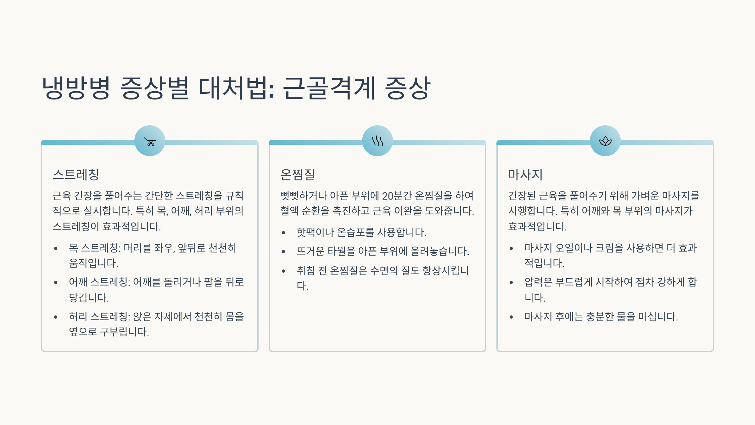 - 관절통: 특히 평소 관절염이 있는 경우 찬바람에 노출되면 통증이 악화될 수 있습니다. 시린 관절은 냉방병의 경고 신호입니다.