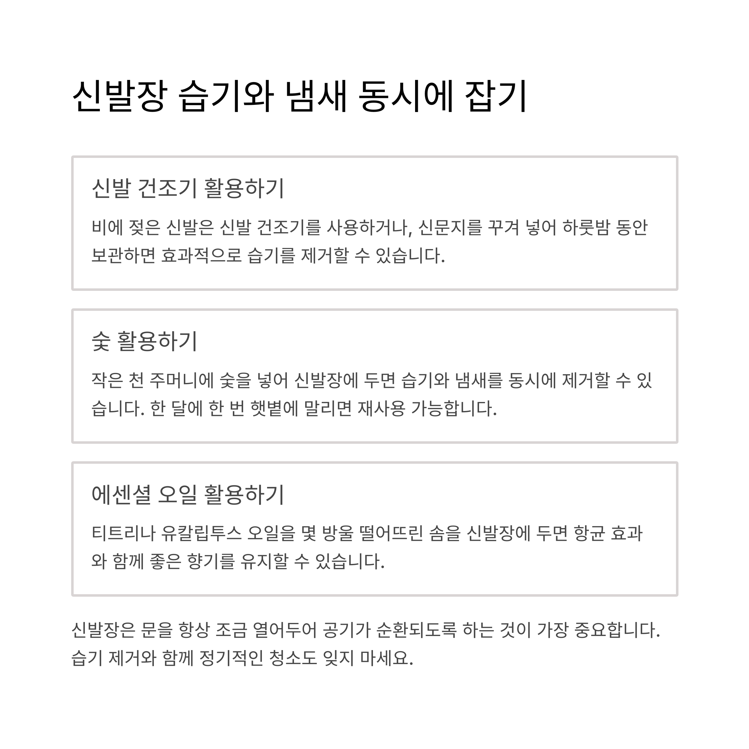 옷장과 신발장은 습기가 차기 쉬운 밀폐된 공간이므로 특별한 관리가 필요합니다. 자칫 방치하면 소중한 옷과 신발에 곰팡이가 피어 버려야 하는 상황이 생길 수도 있습니다.