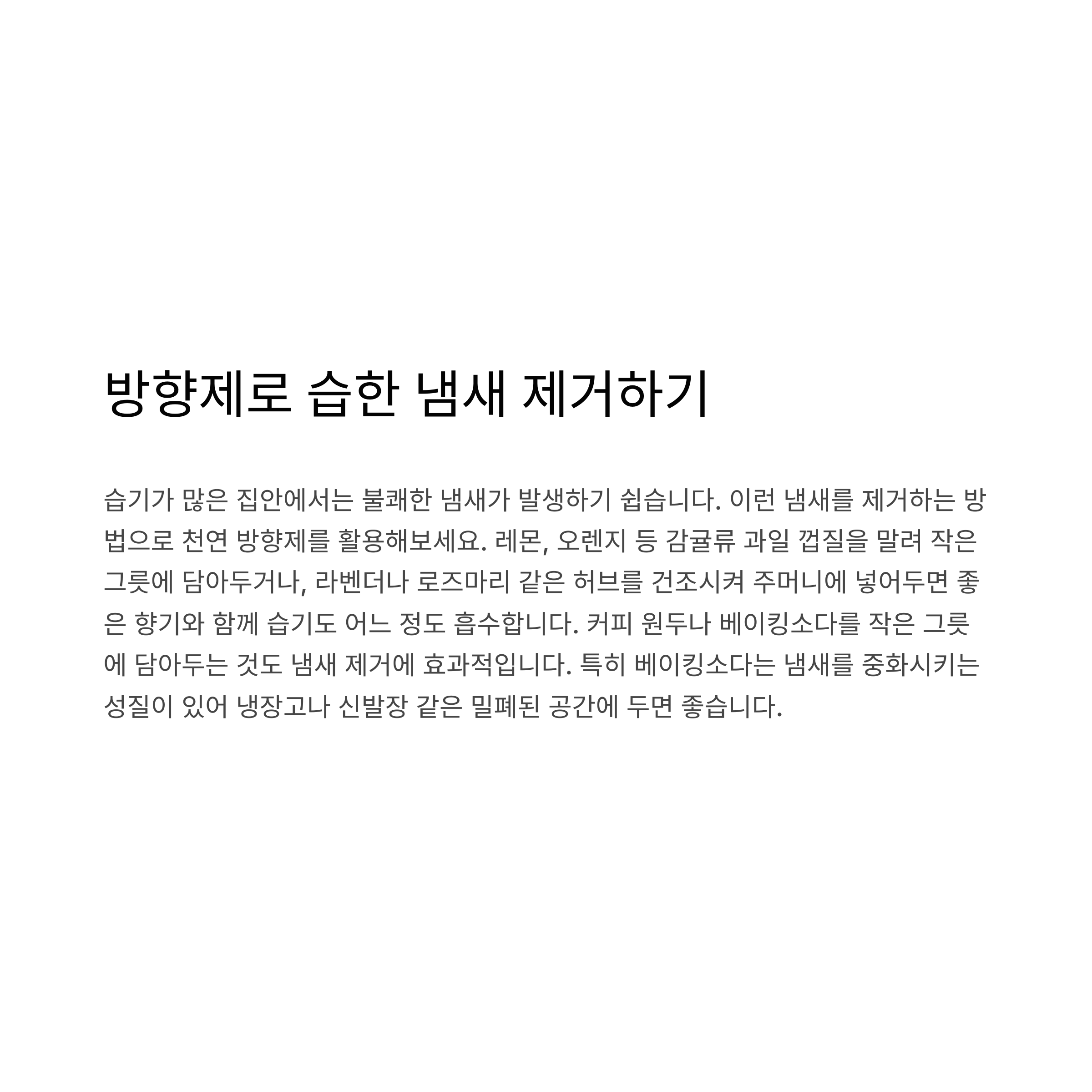 숯은 강력한 습기 흡착력과 탈취 효과를 가지고 있습니다. 적당한 크기의 숯을 망에 담아 옷장, 신발장, 서랍장, 욕실 등에 놓아두세요. 숯은 반영구적으로 사용할 수 있으며, 주기적으로 햇볕에 말려주면 다시 습기 흡착 능력이 회복됩니다.