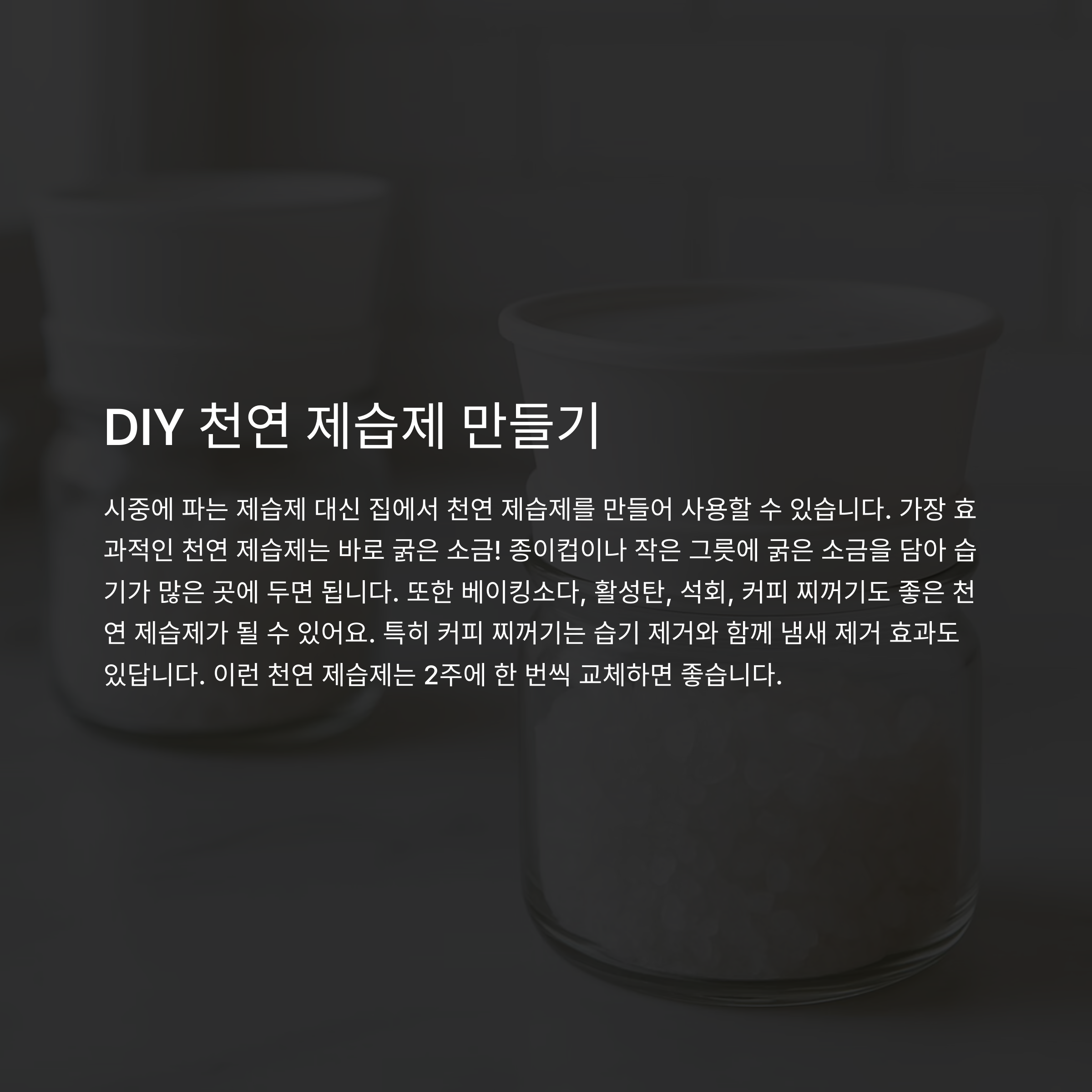 그리고 제습기를 사용할 때 선풍기를 같이 틀어 공기 순환을 도왔더니, 제습 효율이 훨씬 높아져 전기세 부담도 줄일 수 있었습니다. 특히 옷장과 신발장에는 숯과 말린 커피 찌꺼기를 넣어두었는데, 꿉꿉한 냄새가 사라지고 옷이 훨씬 뽀송해진 것을 보고 정말 놀랐습니다. 벽에 피었던 곰팡이도 식초와 베이킹소다를 섞어 뿌리고 닦아내니 깨끗하게 제거되었습니다.
