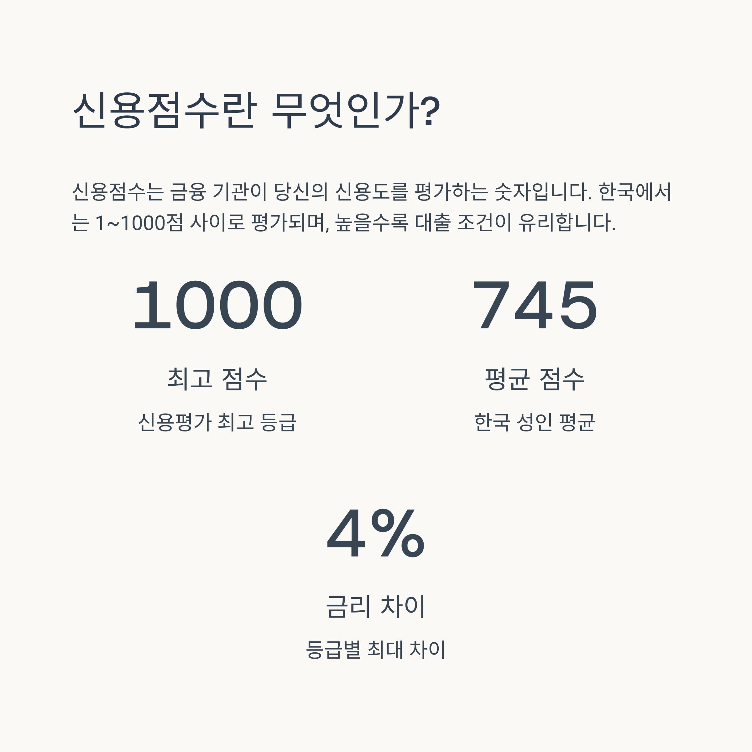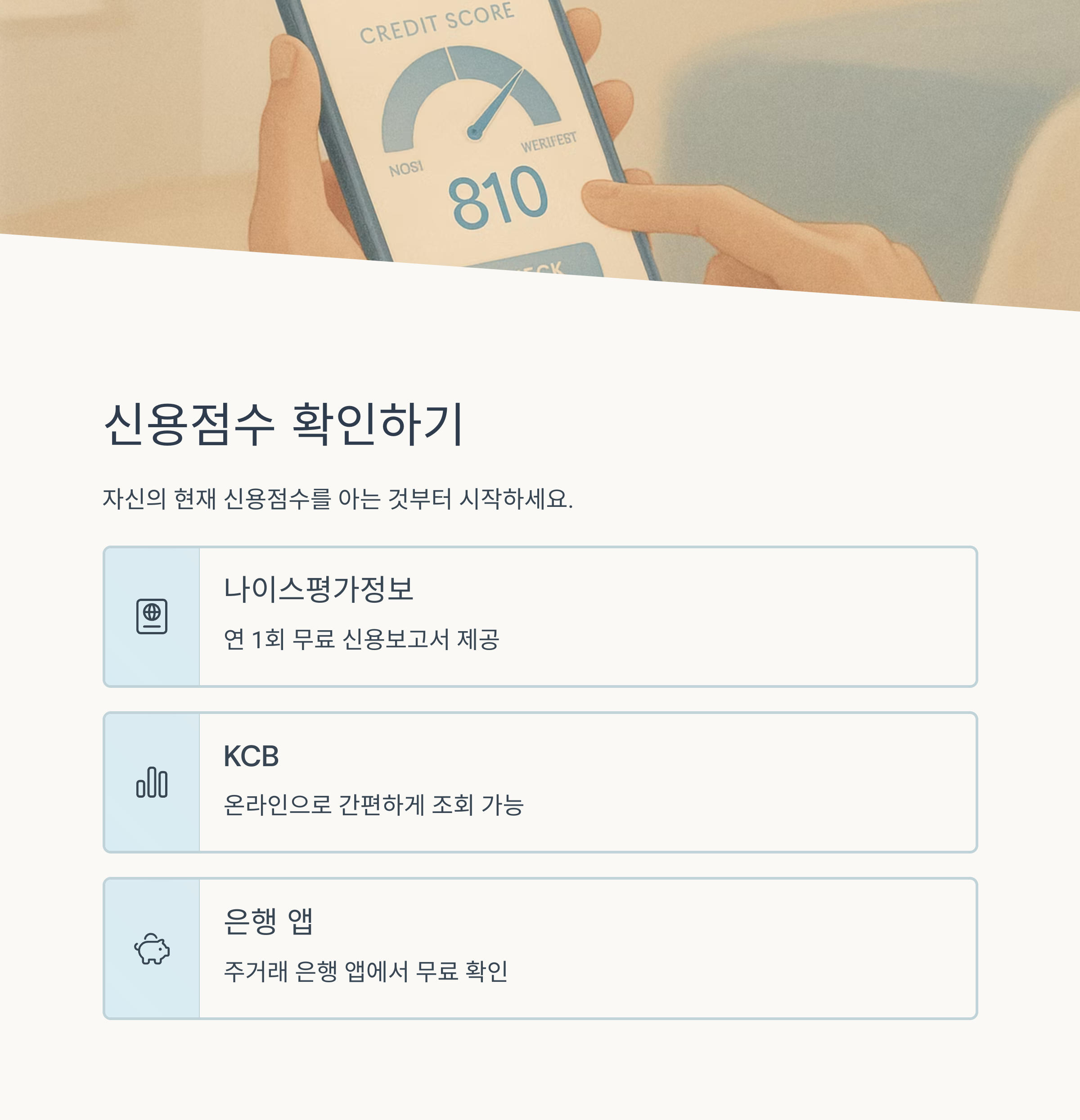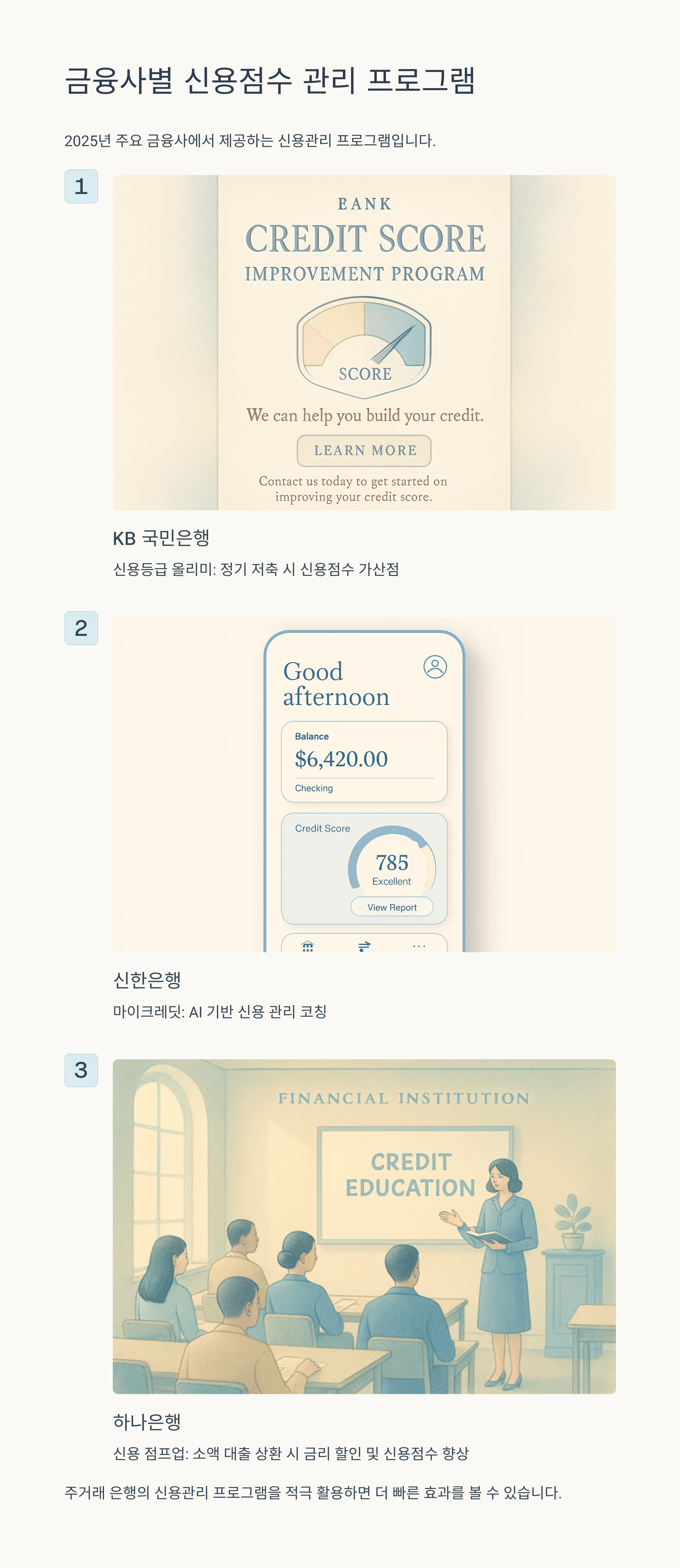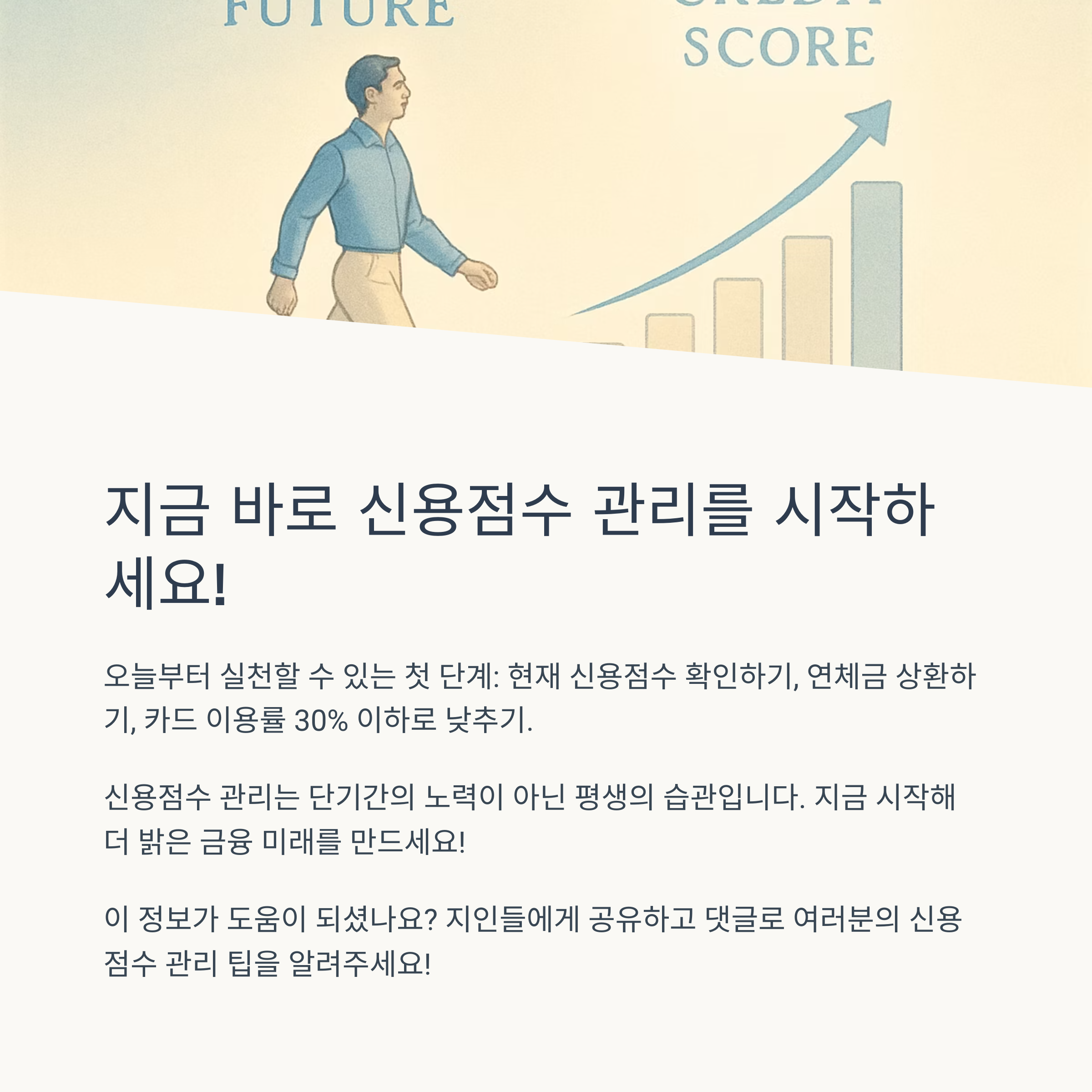 자신의 신용 상태를 정기적으로 확인하고, 작은 습관부터 개선해나간다면 누구나 높은 신용점수를 가질 수 있습니다. 높은 신용점수는 더 나은 금융 상품 이용 기회를 제공하고, 여러분의 금융 생활을 더욱 풍요롭게 만들어 줄 것입니다. 지금 바로 신용점수 관리를 시작하여, 안정적이고 성공적인 금융 미래를 만들어가시길 바랍니다!
