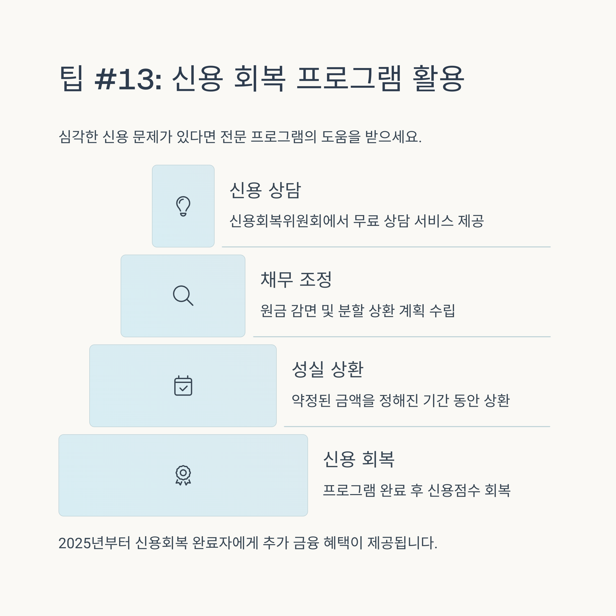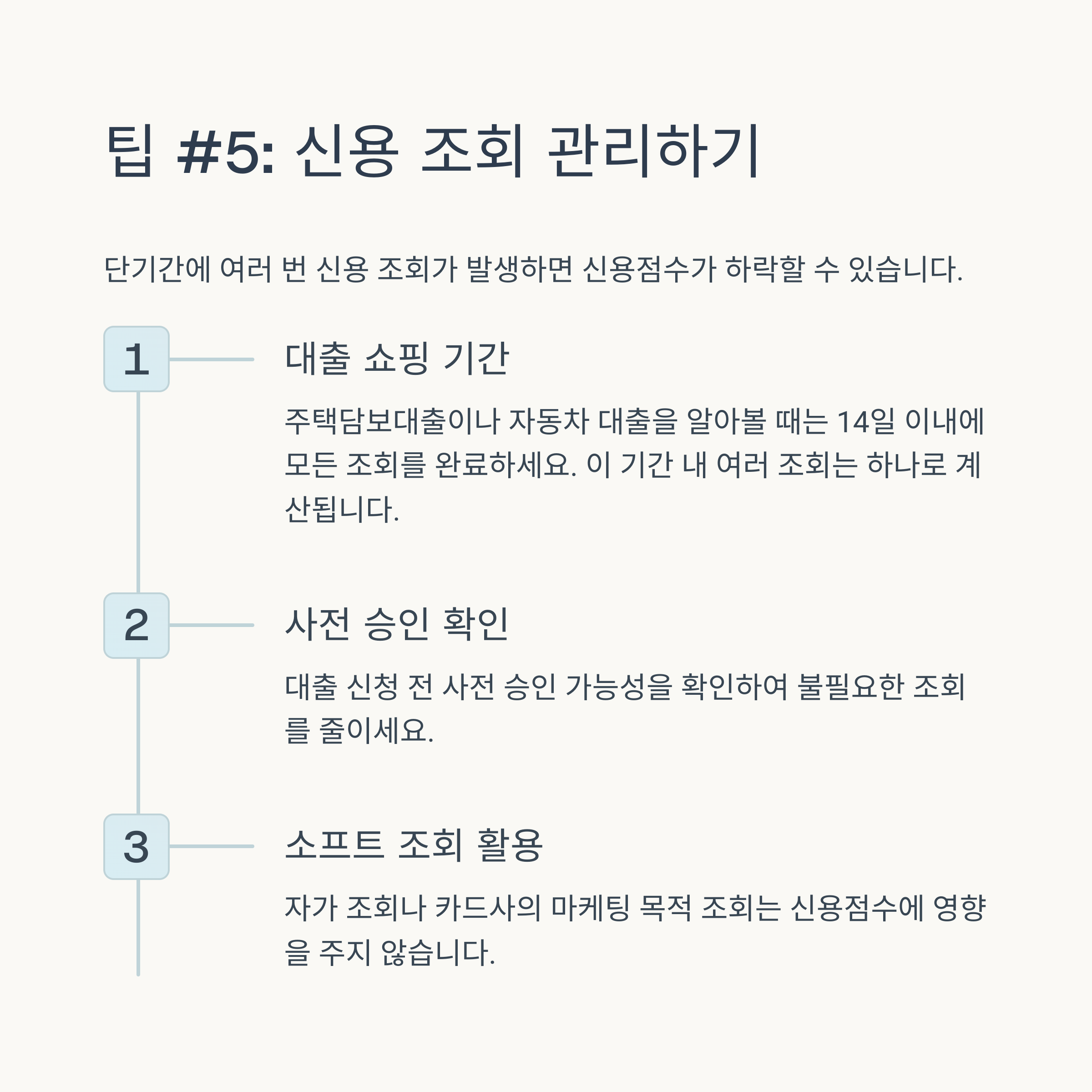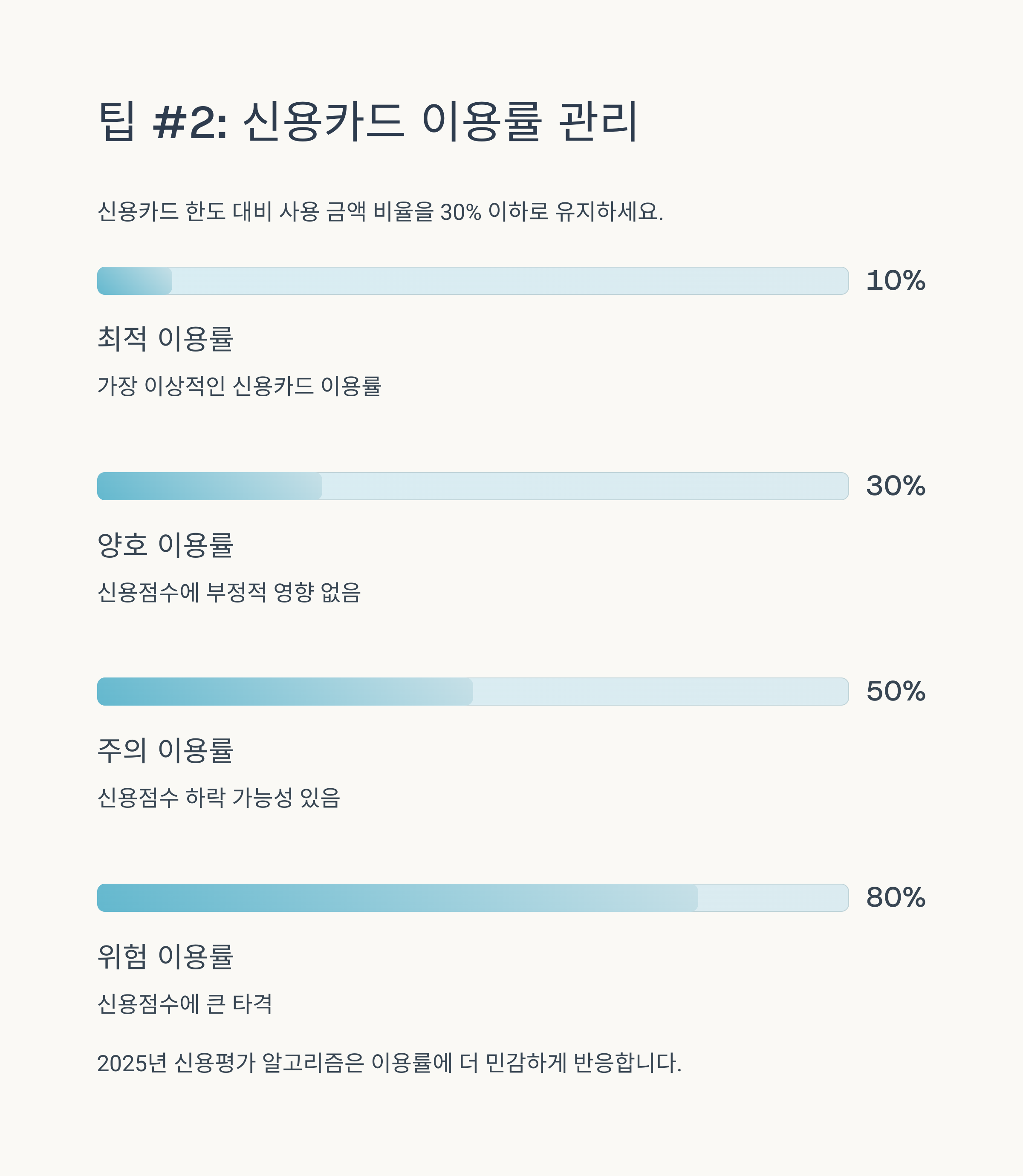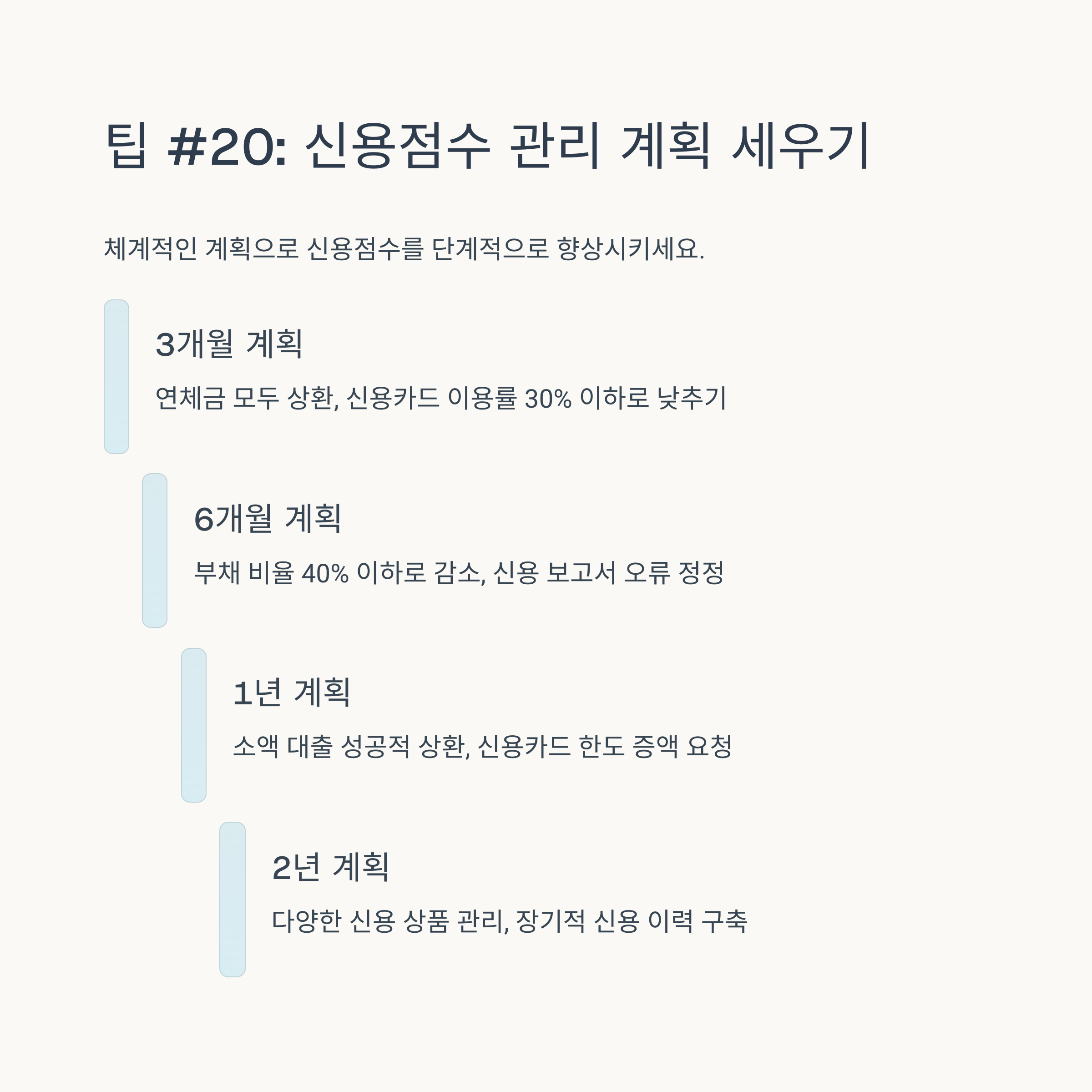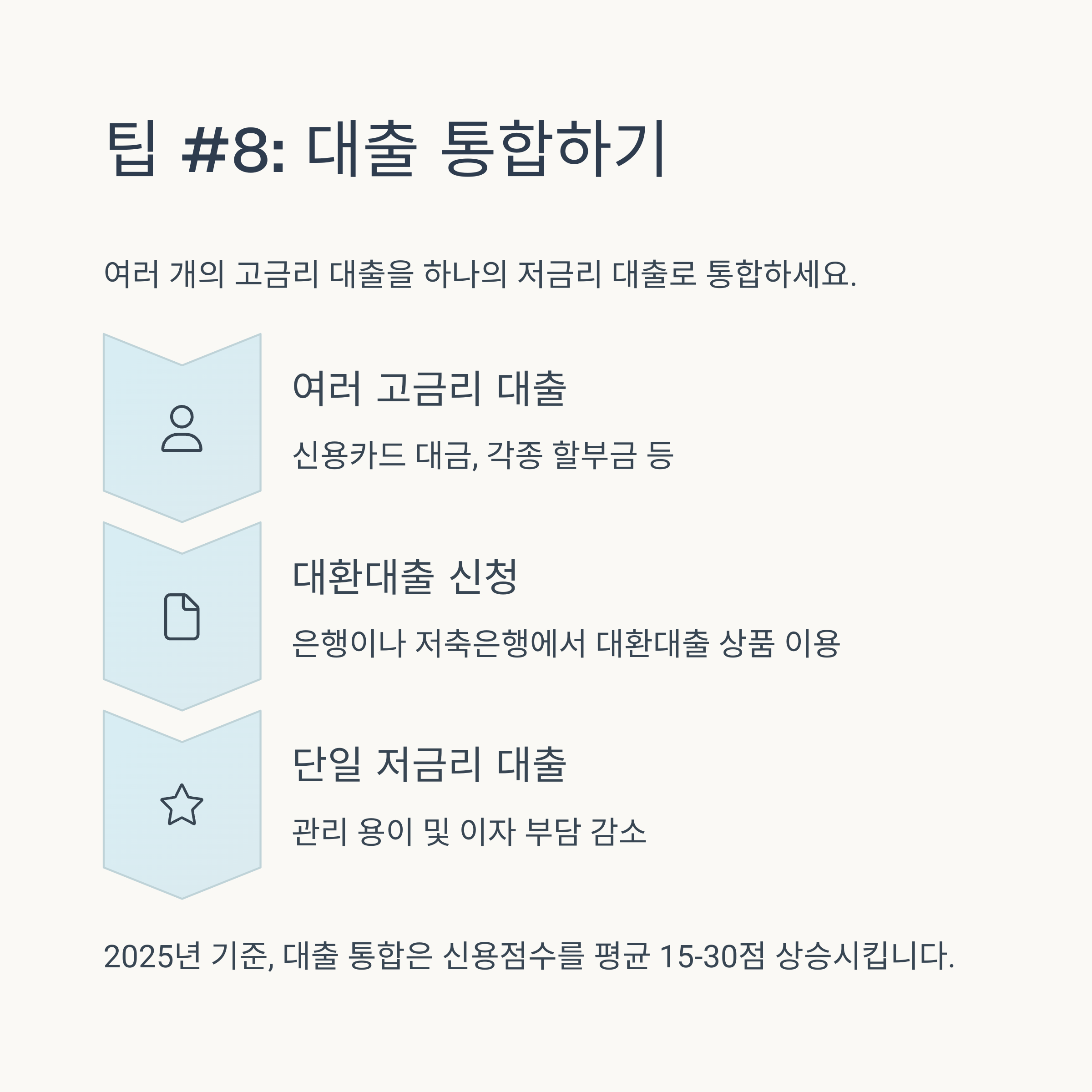 신용점수를 높이는 방법은 단기간에 극적인 효과를 기대하기보다는, 꾸준하고 성실한 금융 생활을 통해 점진적으로 개선해나가는 것이 중요합니다. 2025년 최신 신용평가 트렌드에 맞춰 연체 방지, 신용카드 현명한 사용, 대출 관리, 그리고 비금융 정보 활용이라는 네 가지 핵심 원칙을 꾸준히 실천해 보세요.