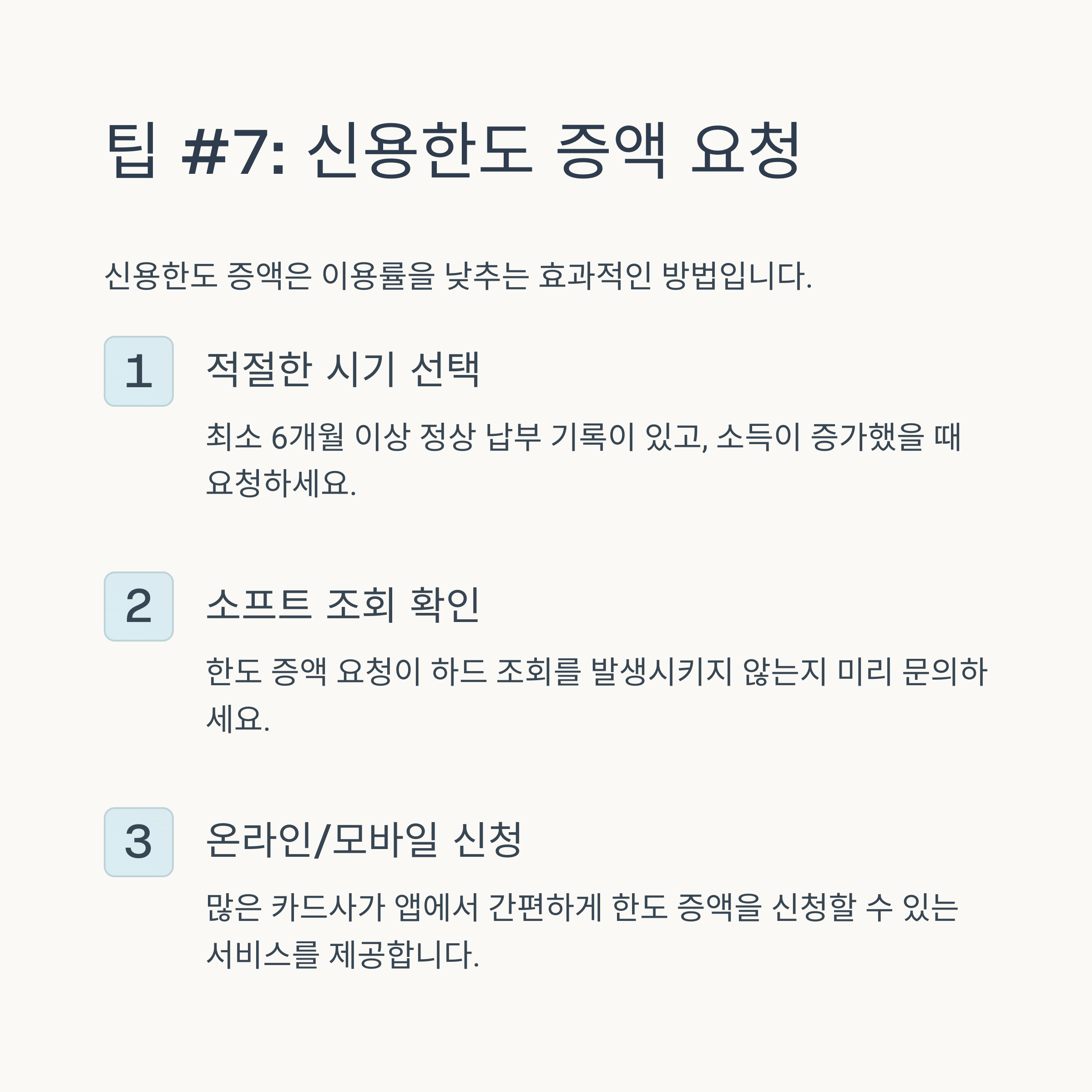매월 **적절한 금액(카드 한도의 30~50% 내외)**을 꾸준히 사용하고, 연체 없이 결제일에 상환하는 것이 중요합니다. 이는 신용평가사에게 '이 사람은 신용카드를 사용하고 상환할 능력이 있는 신뢰할 수 있는 사람'이라는 긍정적인 신호를 줍니다. 카드론, 현금서비스는 가급적 자제하는 것이 신용점수 관리에 훨씬 유리합니다.