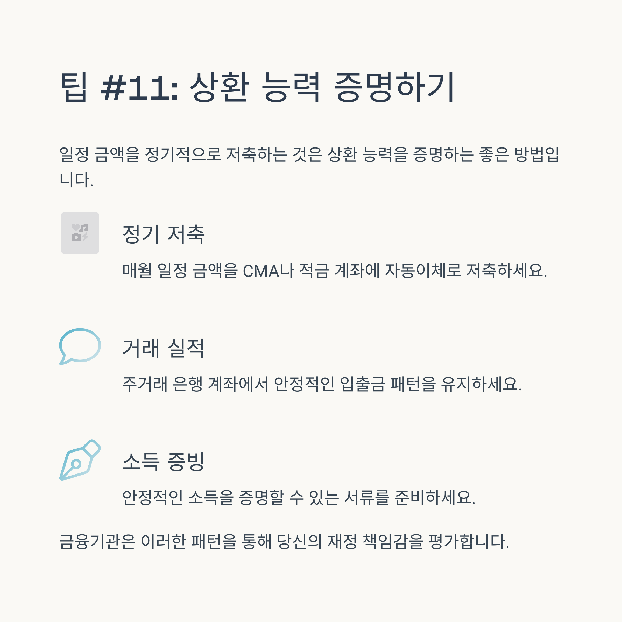 가능하다면 주거래 은행에서 대출을 이용하고, 이자를 성실하게 납부하면 긍정적인 신용 정보를 쌓을 수 있습니다. 주거래 은행은 고객의 금융 거래 이력을 종합적으로 평가하기 때문에, 성실한 상환은 좋은 영향을 미칩니다.