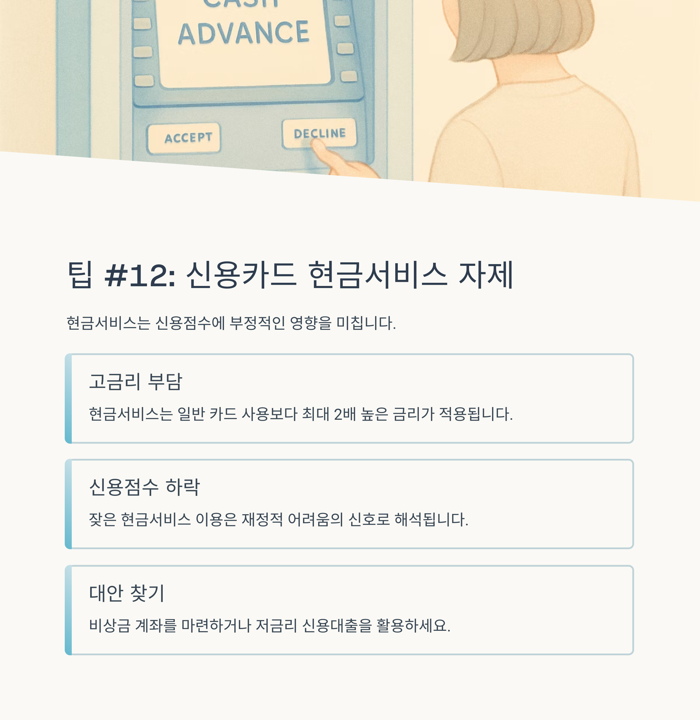 현금서비스, 카드론 등 단기 고금리 대출은 신용점수에 매우 부정적인 영향을 미치므로 피해야 합니다. 이러한 대출은 급할 때 잠시 사용하는 것처럼 보이지만, 신용평가사에게는 '위험도가 높은 대출'로 인식되어 신용점수를 크게 깎아먹습니다.