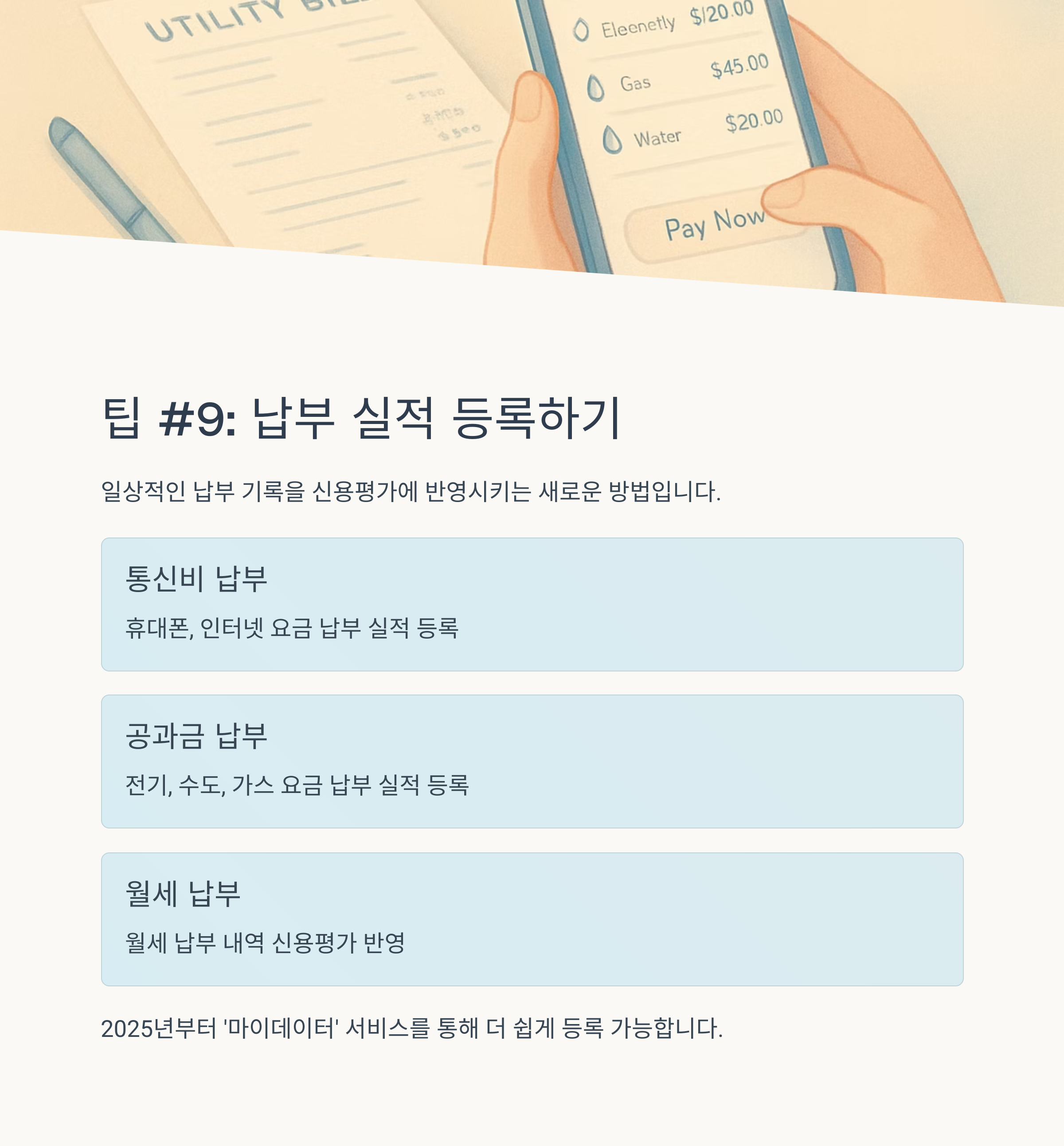 건강보험료, 국민연금, 통신비, 아파트 관리비 등 비금융 정보를 꾸준히 성실하게 납부한 내역을 신용평가사에 제출하면 신용점수를 올릴 수 있습니다. (예: NICE평가정보 '나이스 지키미', KCB '올크레딧' 등에서 신청 가능) 이 정보들은 여러분의 성실함을 증명하는 중요한 자료가 됩니다. 꾸준히 쌓아온 납부 이력이 신용점수에 긍정적으로 작용하는 것입니다. 마치 꾸준히 쌓아온 탑이 튼튼한 것처럼 말이죠.