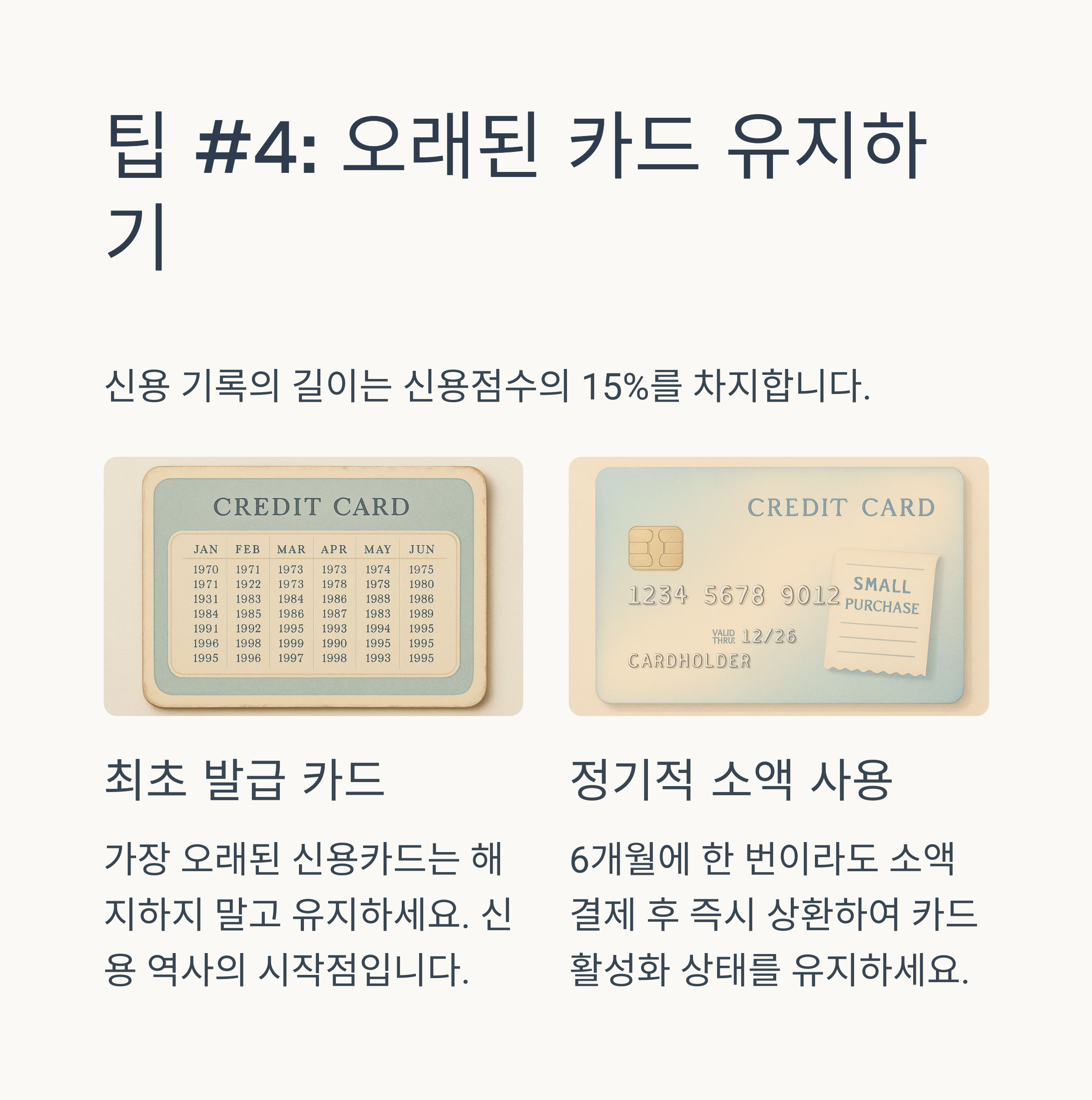 오래 사용한 신용카드는 성실한 상환 이력을 보여주므로, 해지하기보다는 유지하는 것이 신용점수 관리에 더 유리합니다. 신용 거래 기간은 신용평가 시 중요한 요소 중 하나입니다. 특별한 사유가 없다면, 오랫동안 사용해 온 카드는 계속 유지하세요.