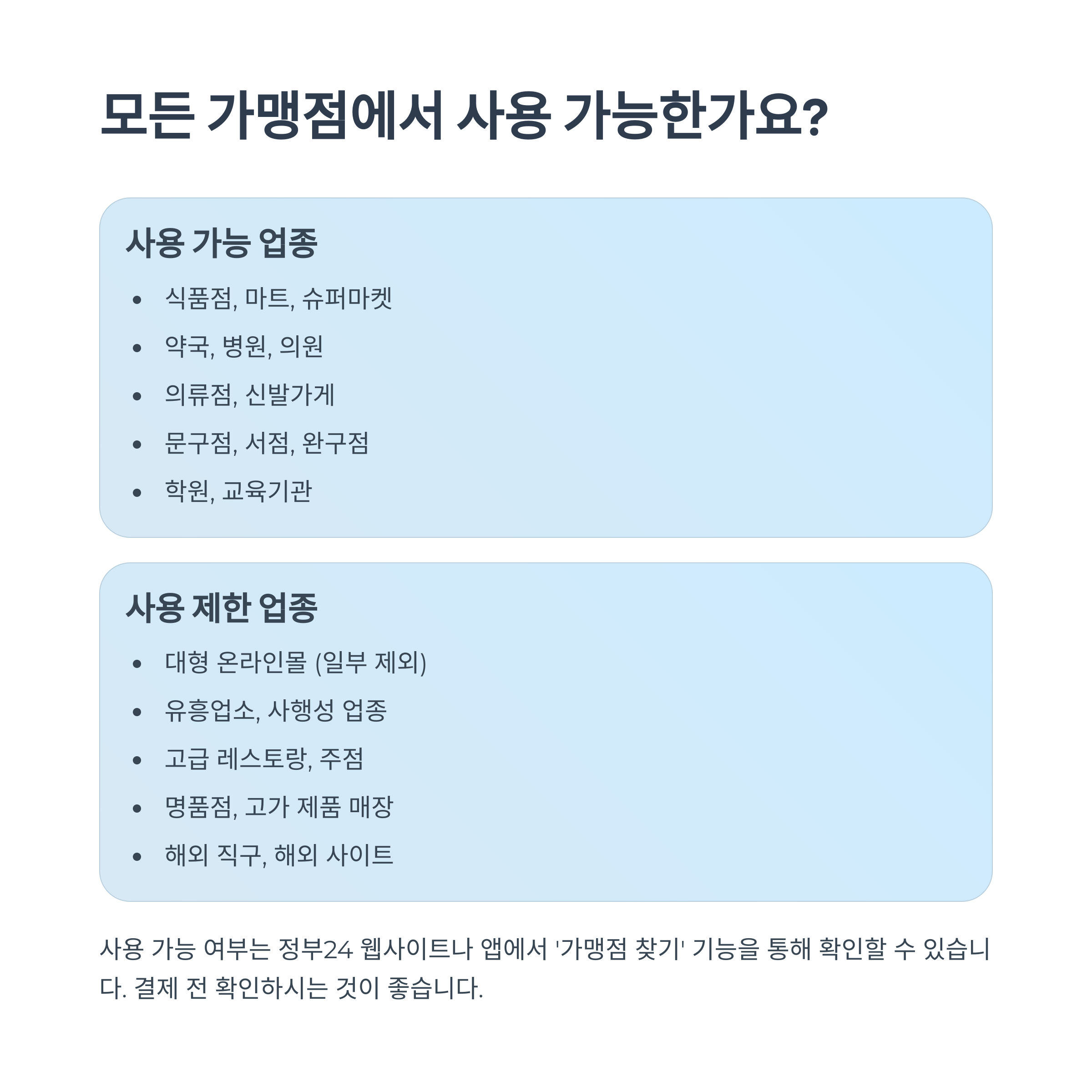 - A. 네, 대부분 가능합니다! 연 매출 30억 원 이하의 소상공인 가맹점이라면 동네 학원, 병원, 약국, 서점, 음식점 등에서 자유롭게 사용할 수 있습니다. 단, 대형 프랜차이즈 직영점이나 일부 온라인 결제는 제한될 수 있으니 결제 전 확인하는 습관이 중요합니다.