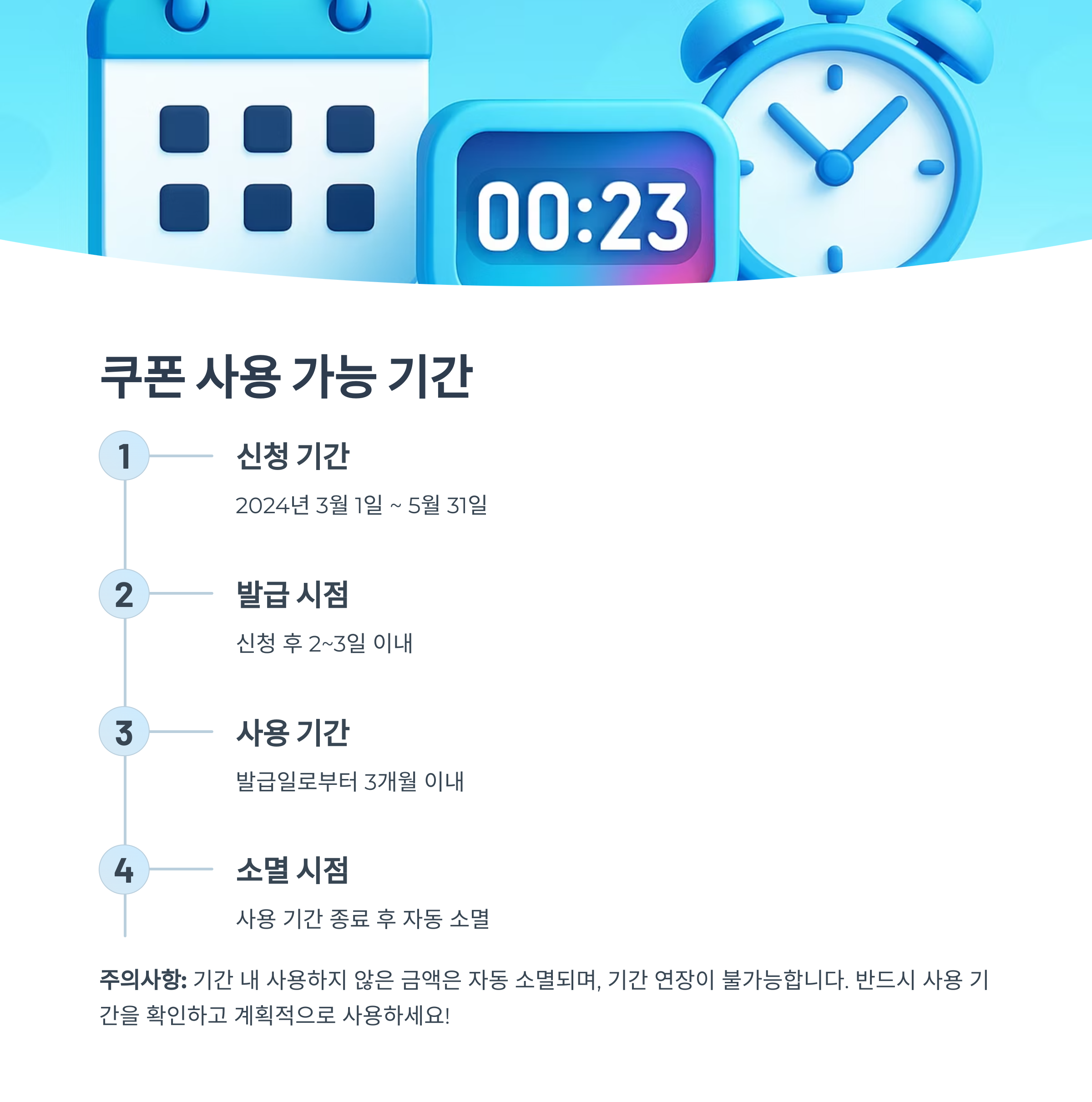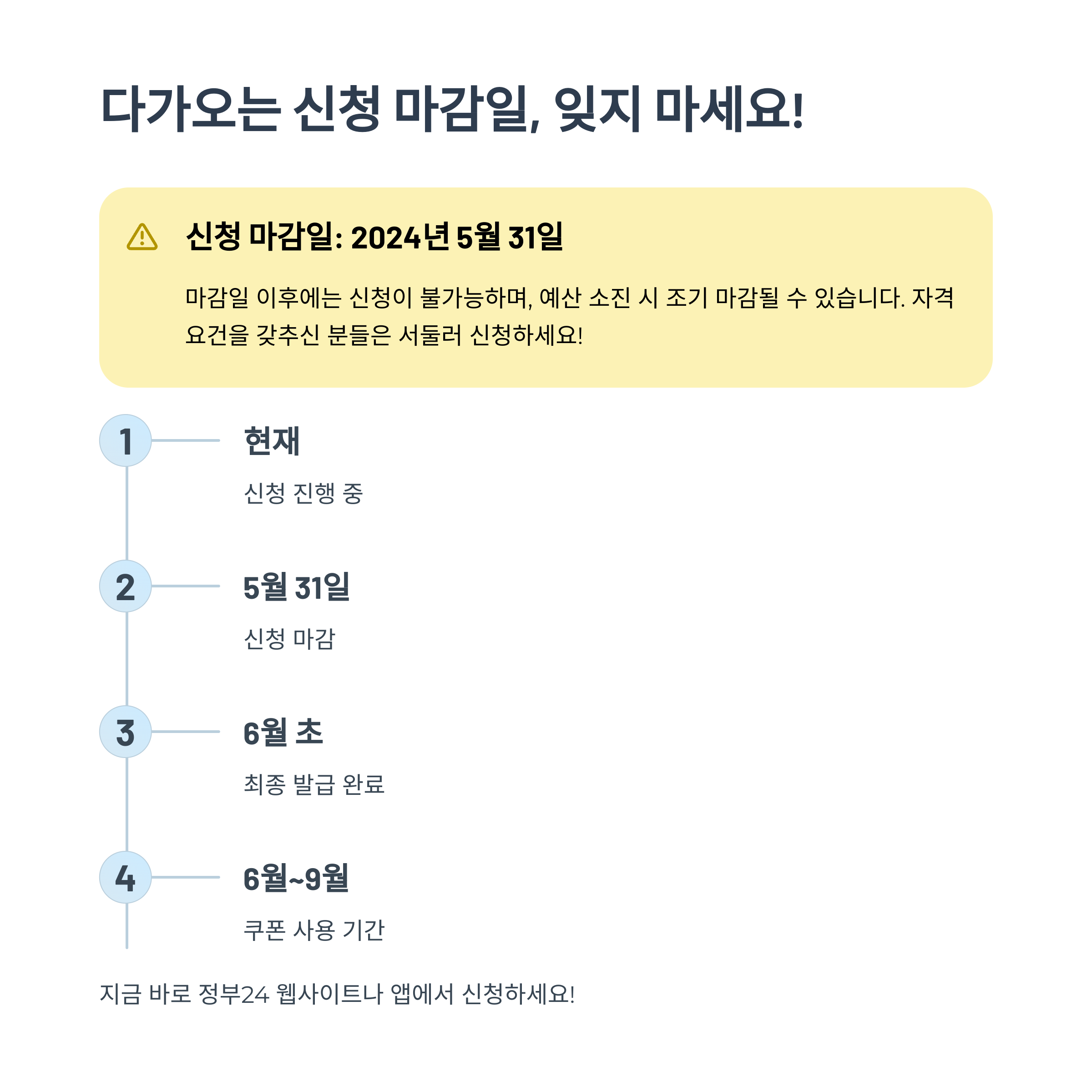 - 4️⃣ 신청 기간 엄수: 7월 21일부터 시작되는 신청 기간을 놓치지 않도록 주의하고, 초기 5일간의 요일제도 확인하세요.
