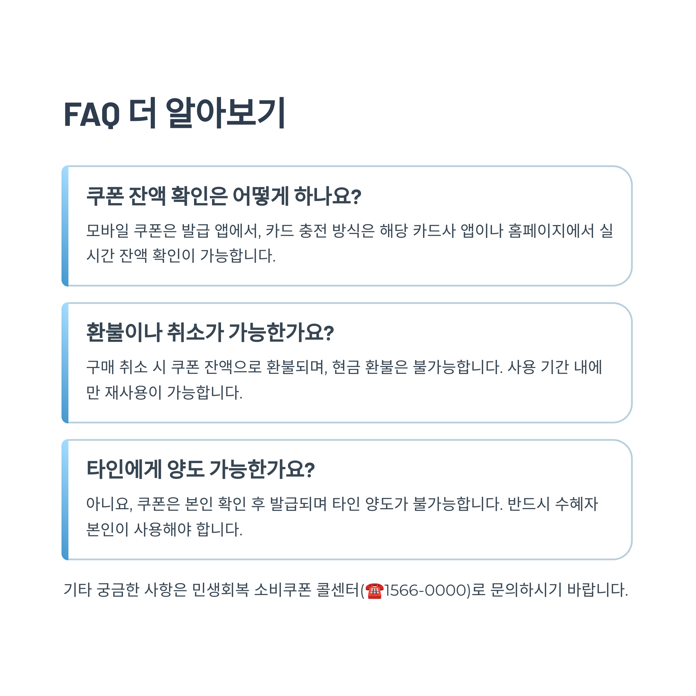 - A. 신용/체크카드로 받으셨다면 카드사 앱이나 홈페이지에서 실시간으로 잔액 조회가 가능합니다. 결제 시마다 카드사에서 보내주는 문자 알림에도 남은 잔액이 표시되니 편리하게 확인할 수 있습니다. 저도 이 기능 덕분에 남김없이 알뜰하게 사용할 수 있었어요.