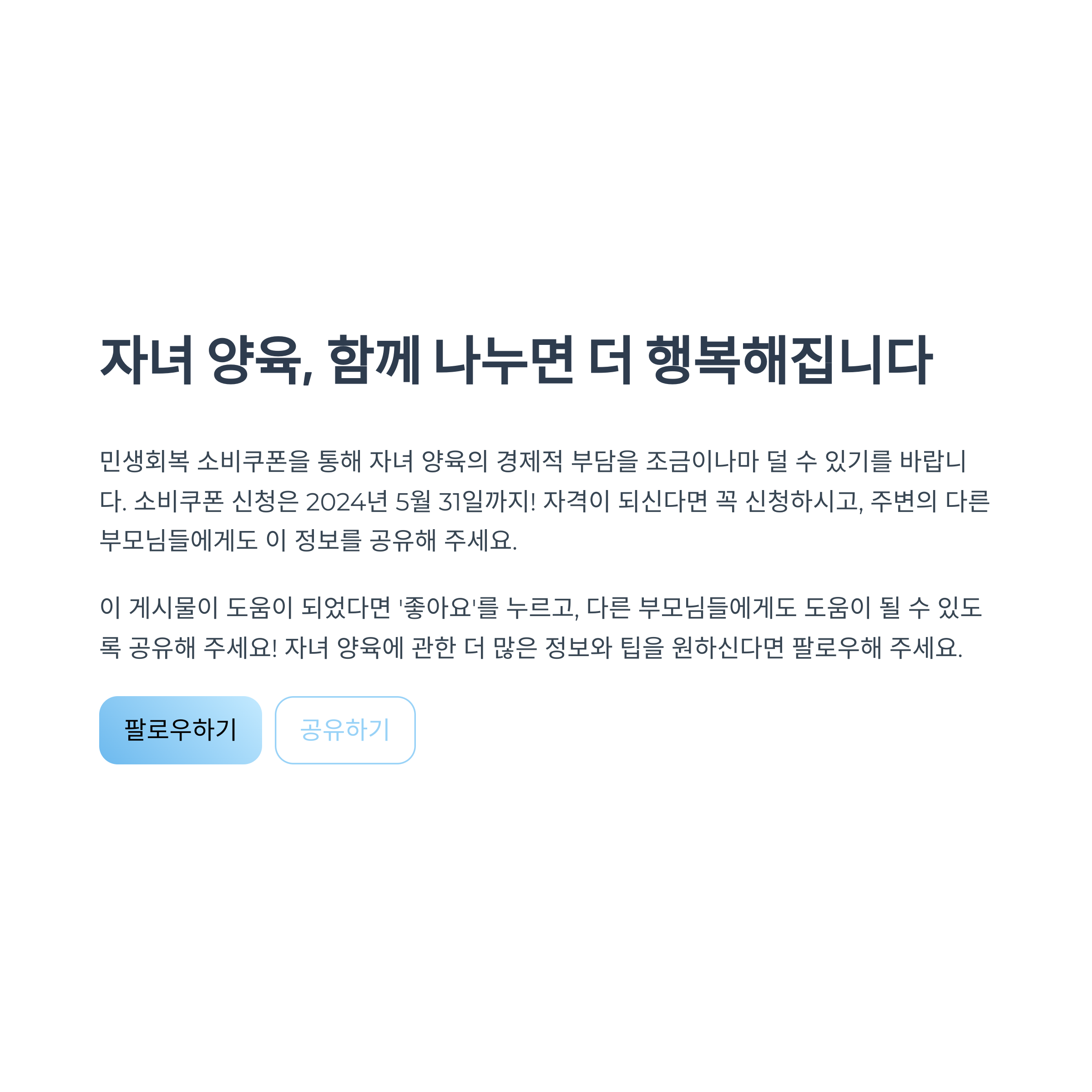 - 5️⃣ 스미싱 주의: 정부는 절대 문자로 신청 링크를 보내지 않습니다. 출처 불분명한 URL은 절대 클릭 금지!