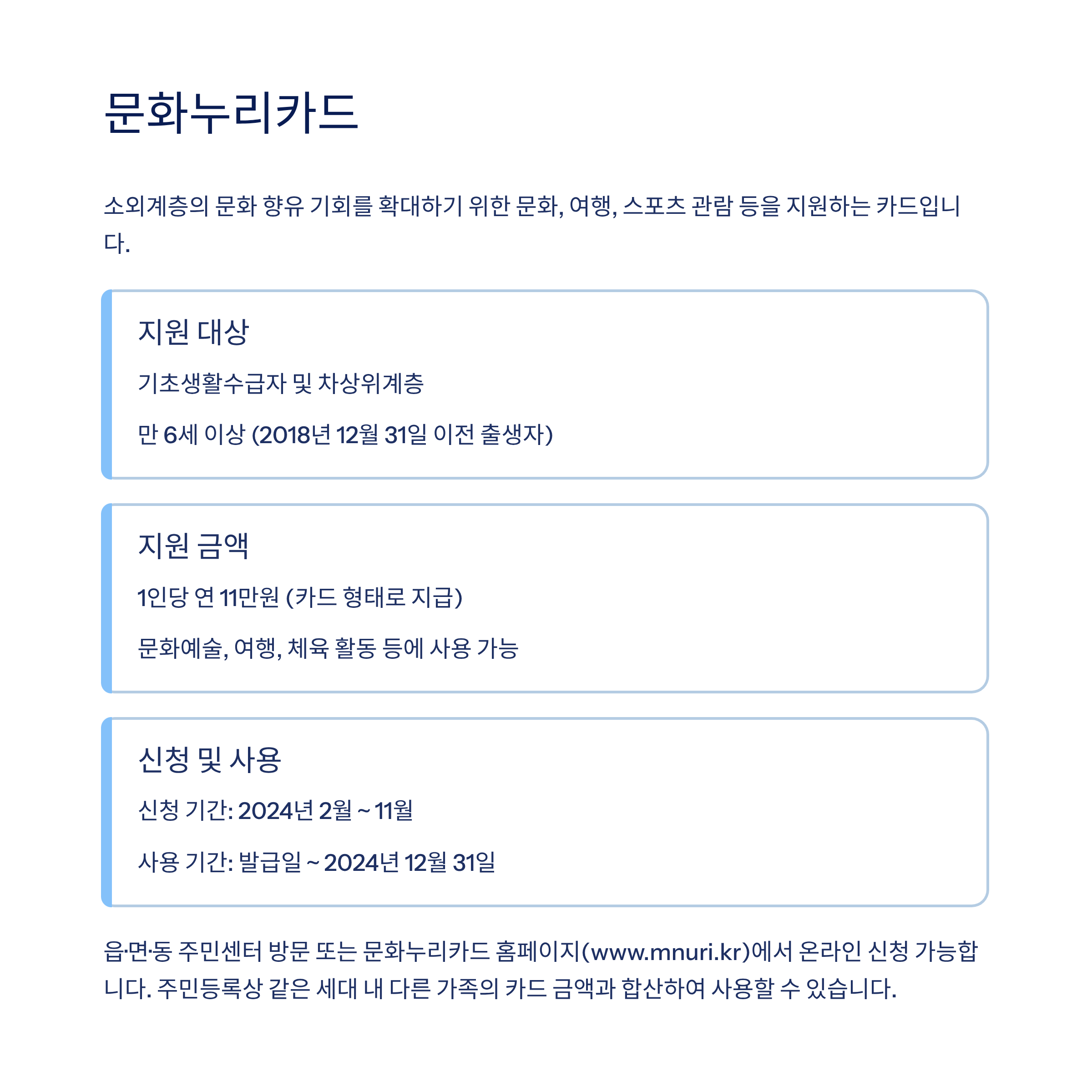- 신청 절차: 신분증과 본인 명의 카드를 지참하고 제휴 은행 방문 → 신청서 작성 → 은행원이 신청 처리