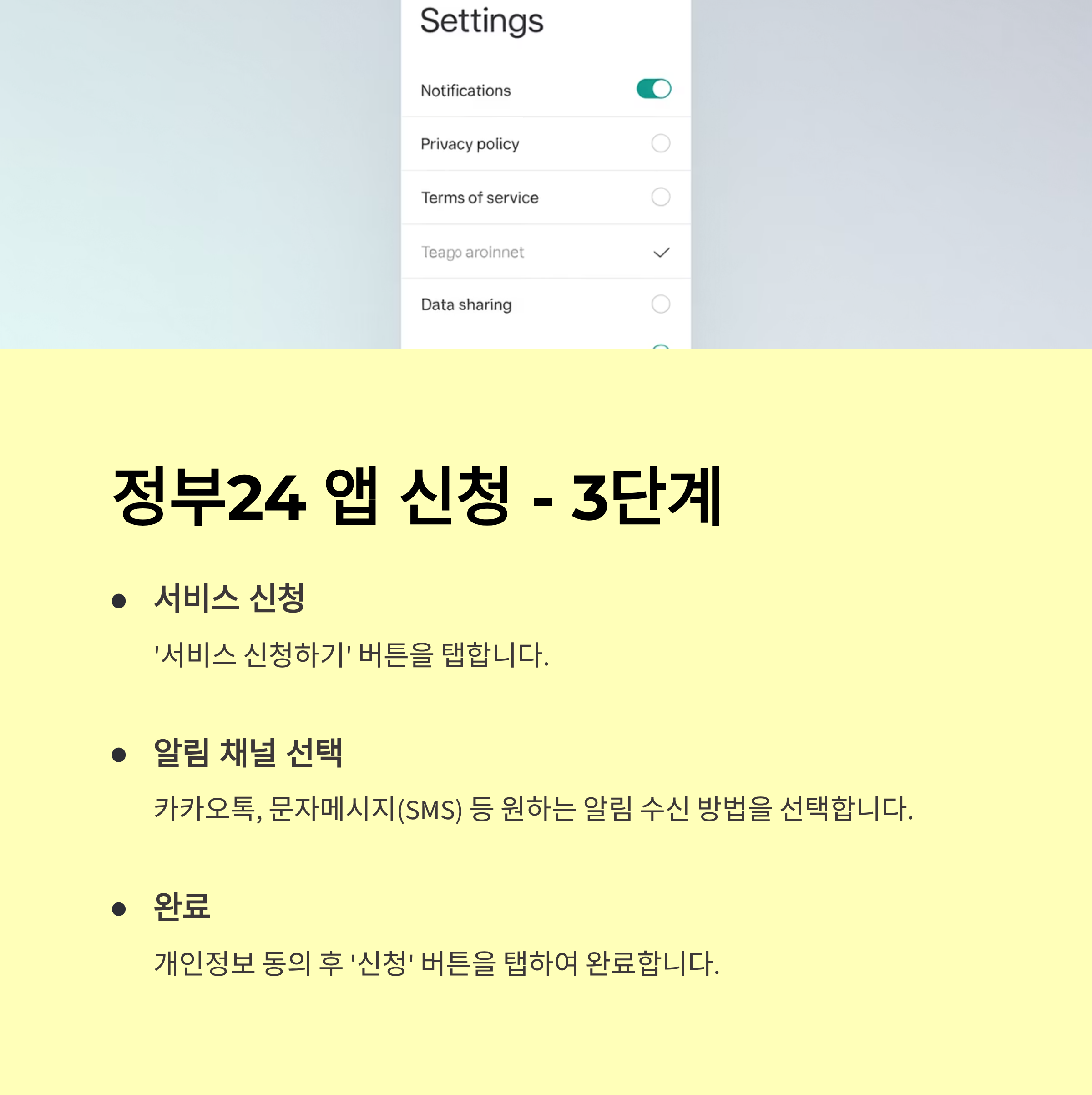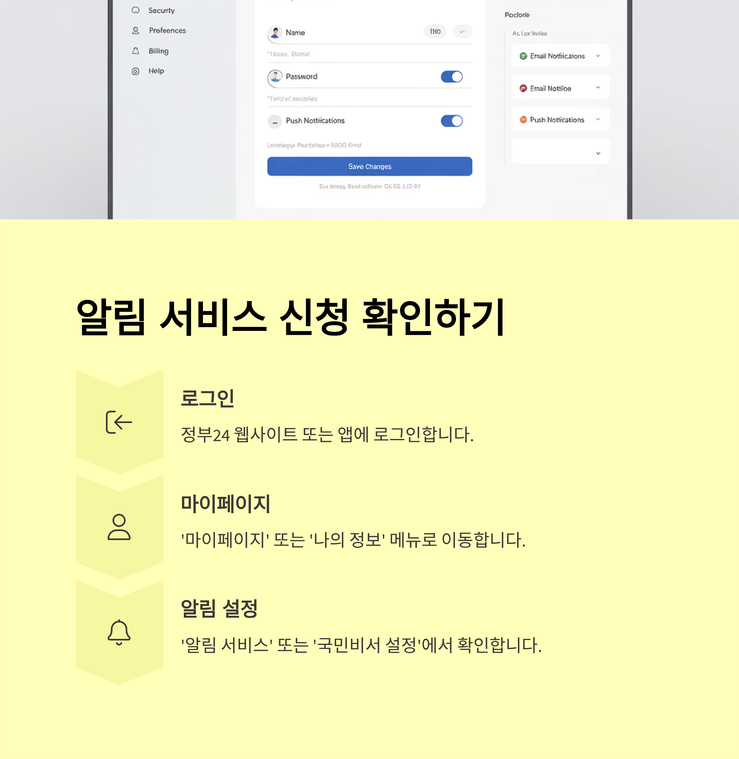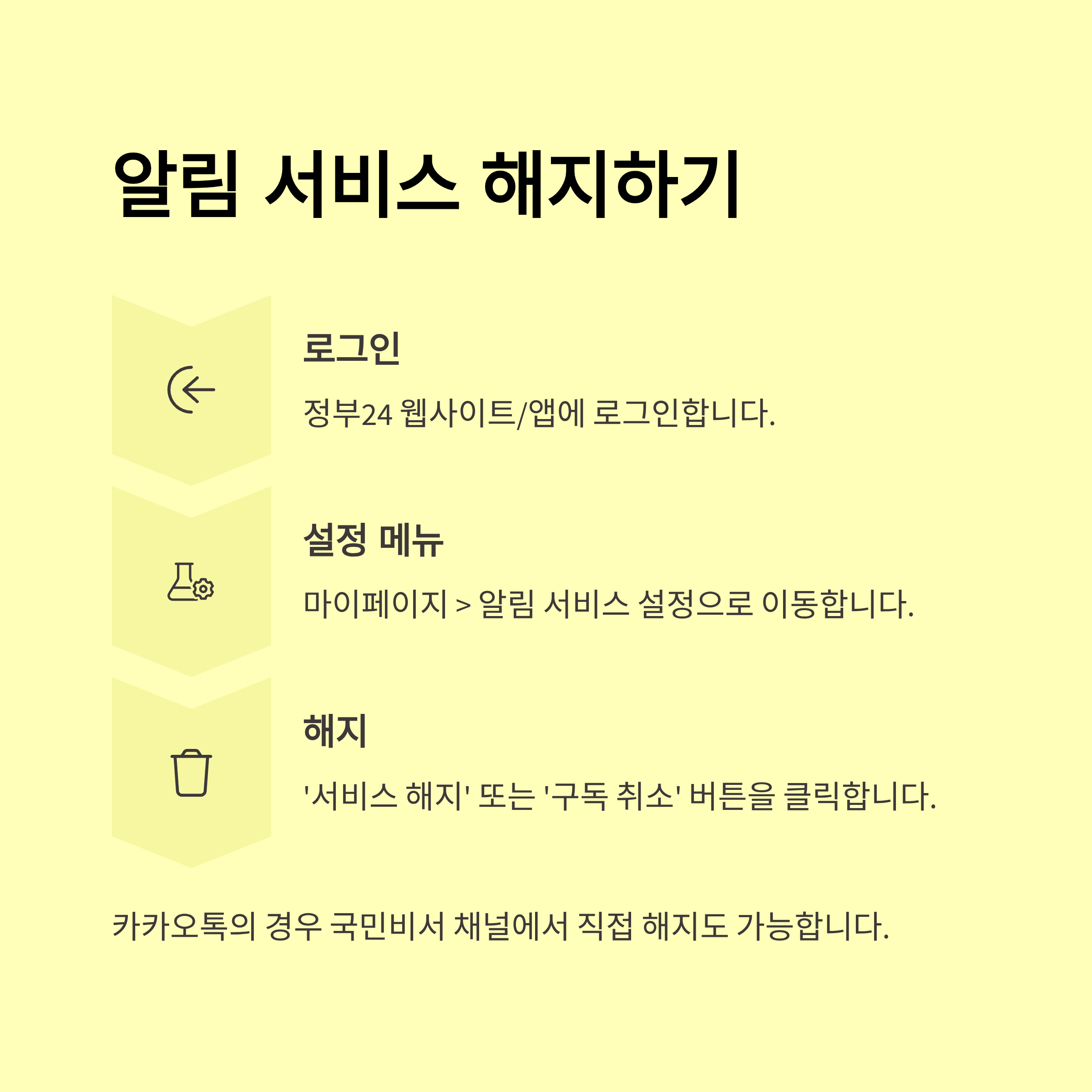 '정부24' 로그인 → '국민비서' 메뉴 → 수신받을 앱(카톡/네이버/토스/문자) 선택 → 알림 종류 선택