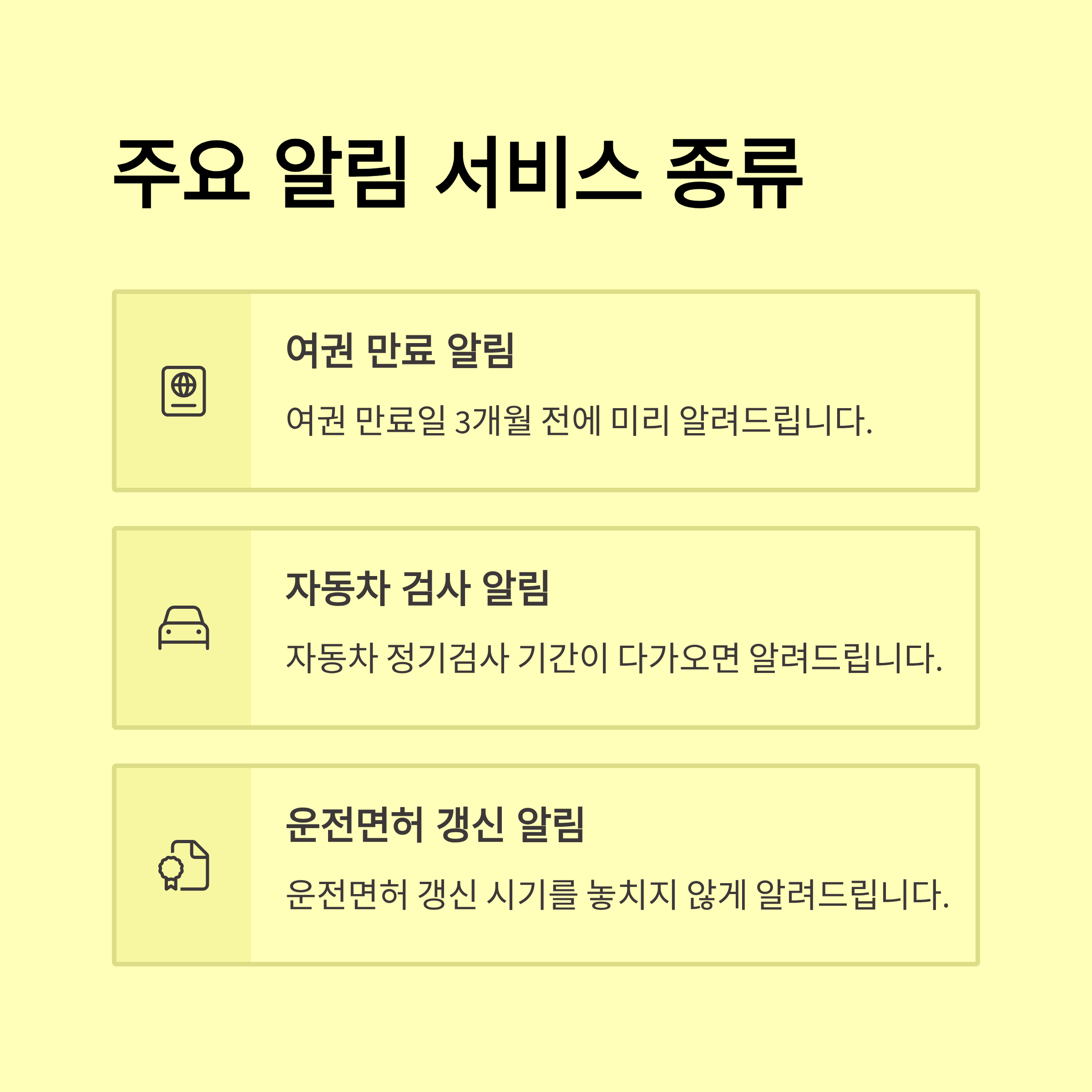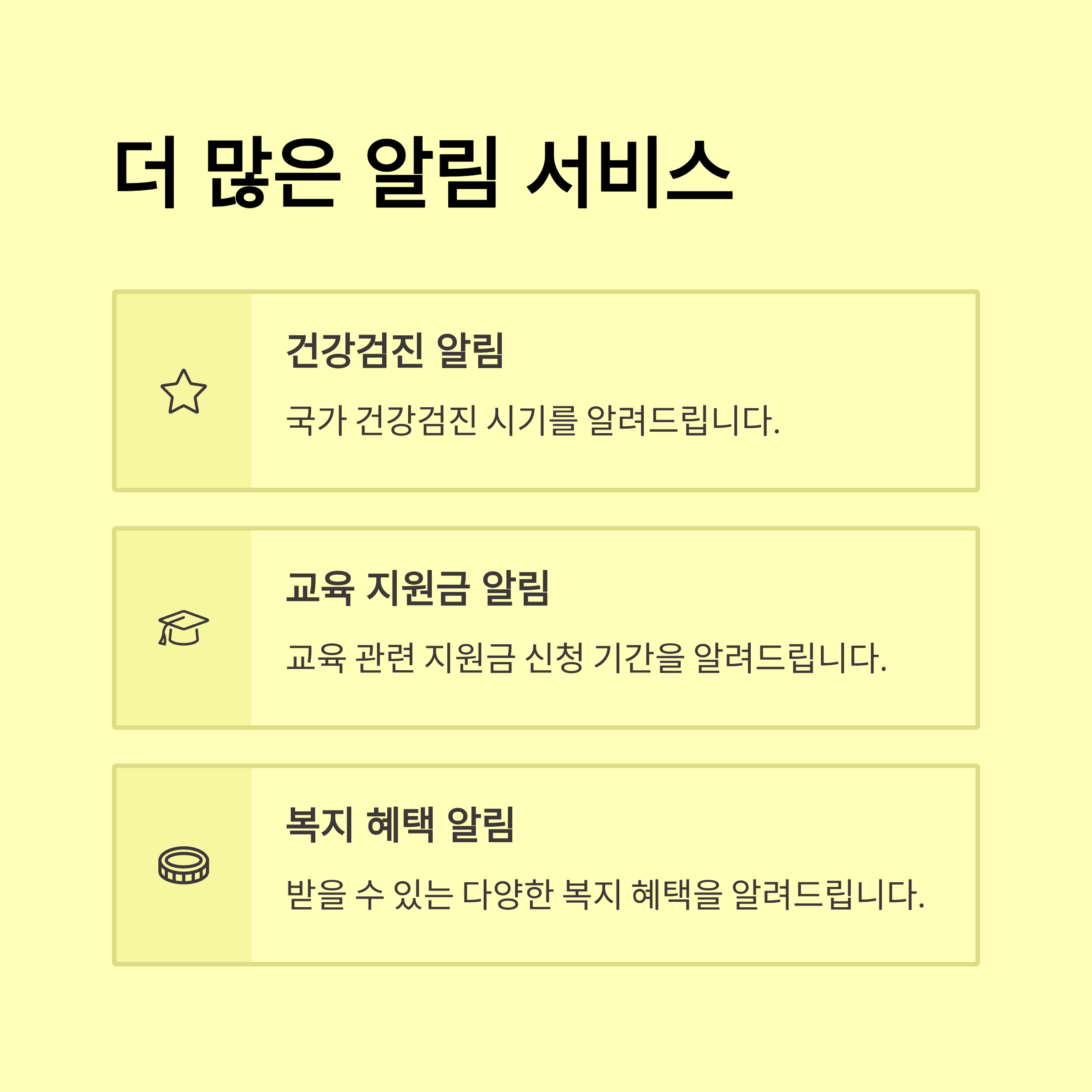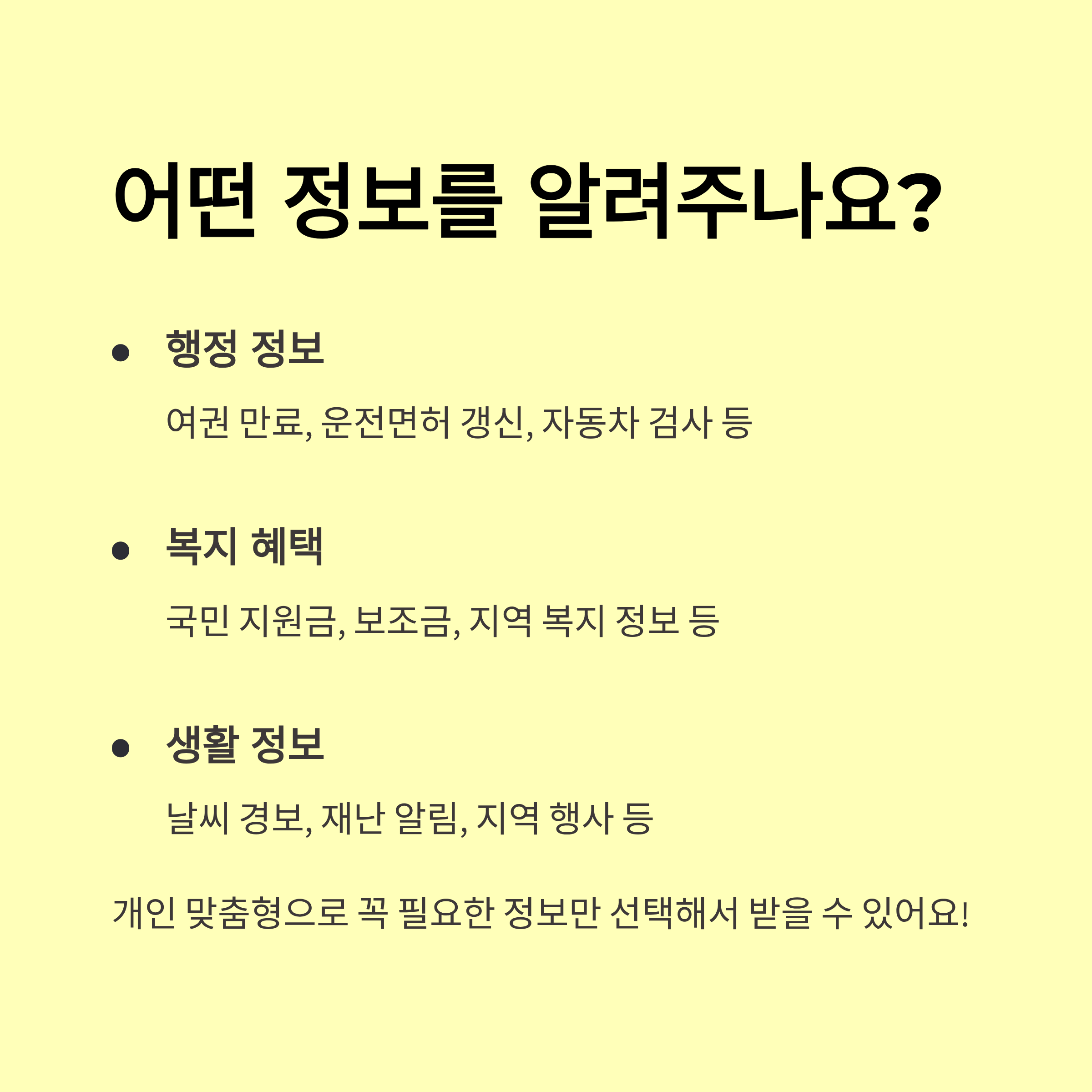 - 💰 왜? 과태료, 지원금, 건강검진 등 놓치면 손해인 정보를 놓치지 않기 위해!