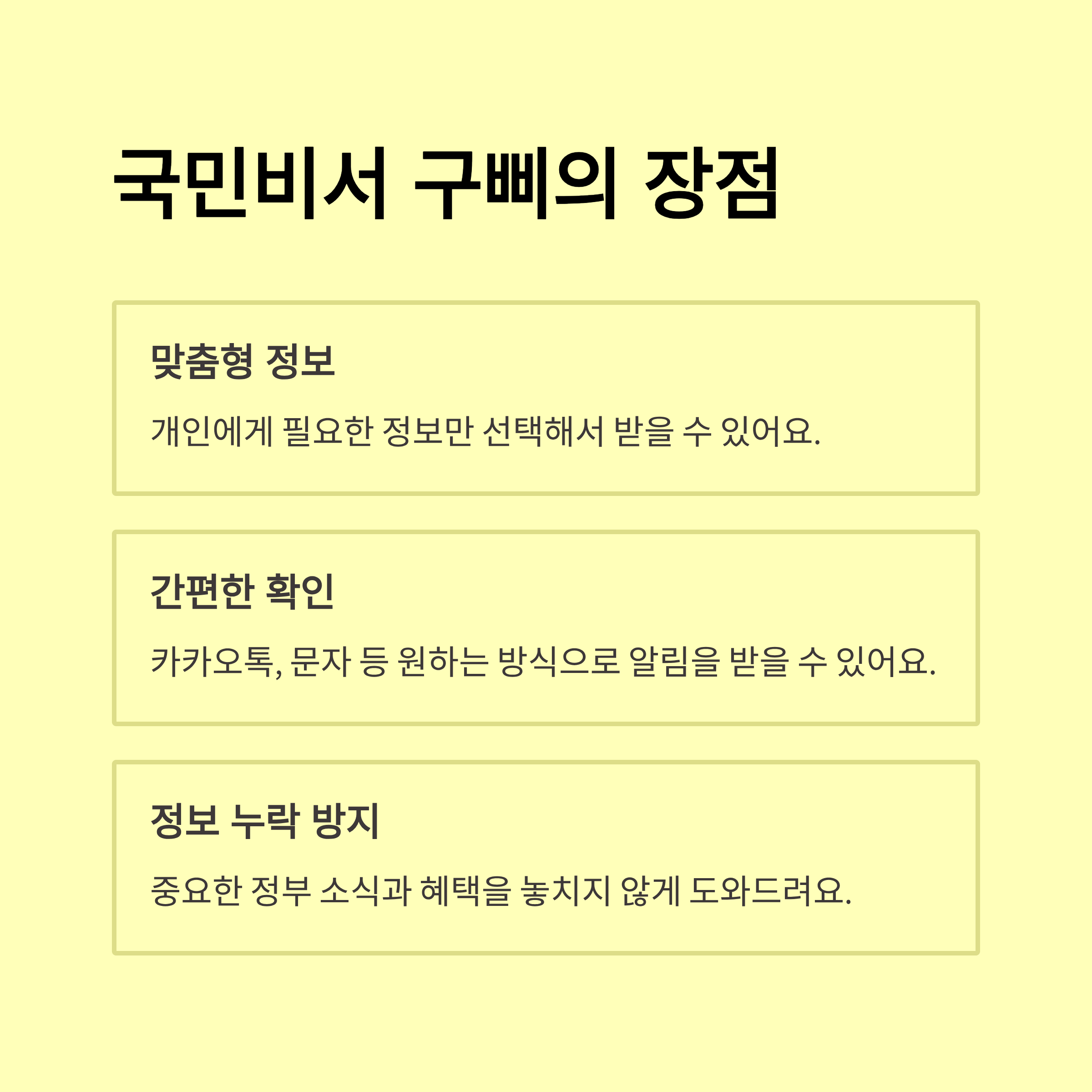 단 1분의 투자로 놓치는 정보 없이, 내 모든 권리를 알뜰하게 챙길 수 있습니다. 지금 바로 '국민비서 구삐'를 신청해서 스마트한 대한민국 국민이 되어보세요!