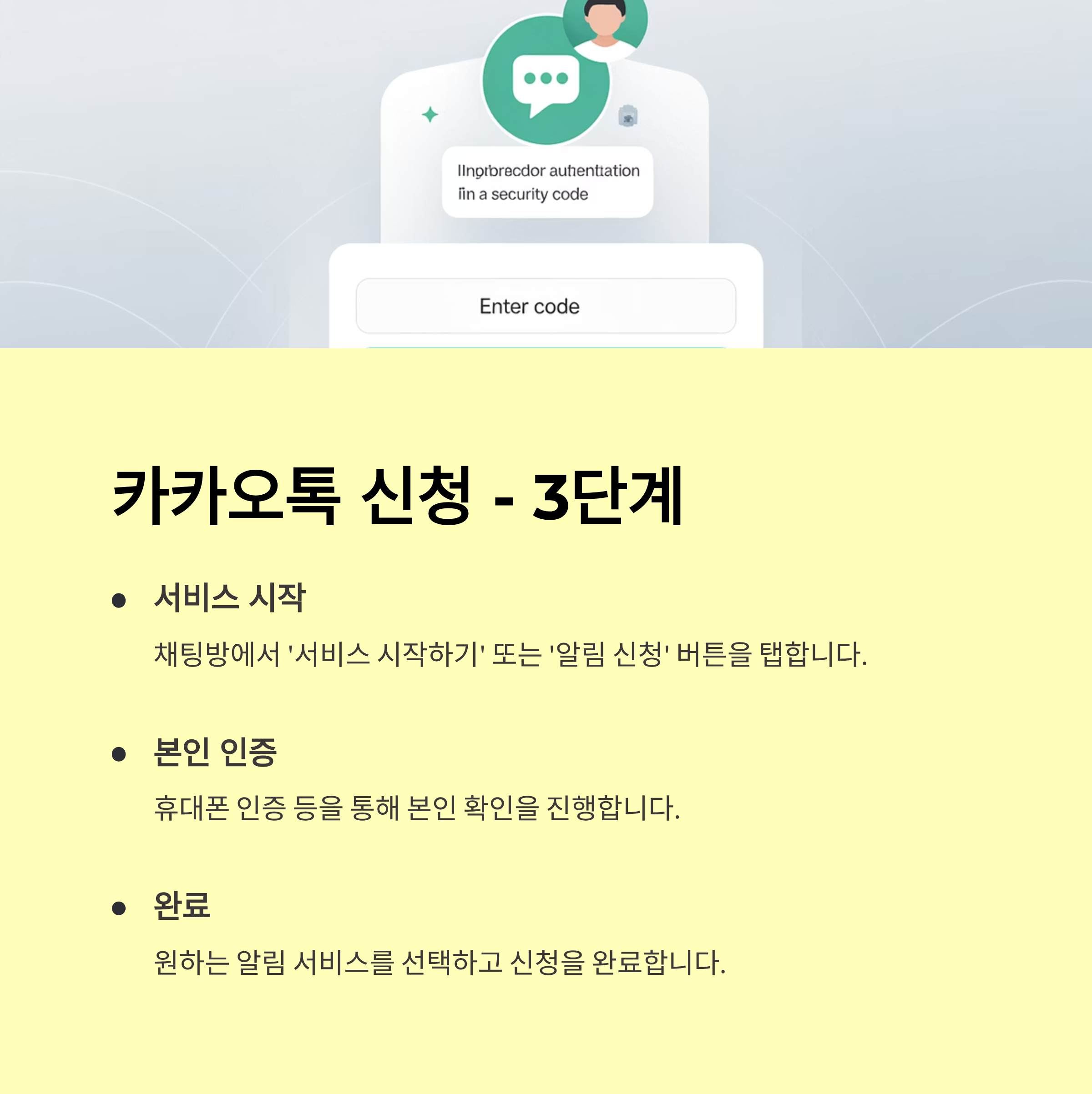 대한민국 국민이라면 누구나 쓰는 카카오톡! 바로 이 카카오톡 안에서 모든 신청을 끝낼 수 있습니다. 다른 앱을 설치할 필요도, 복잡한 사이트에 가입할 필요도 없습니다.