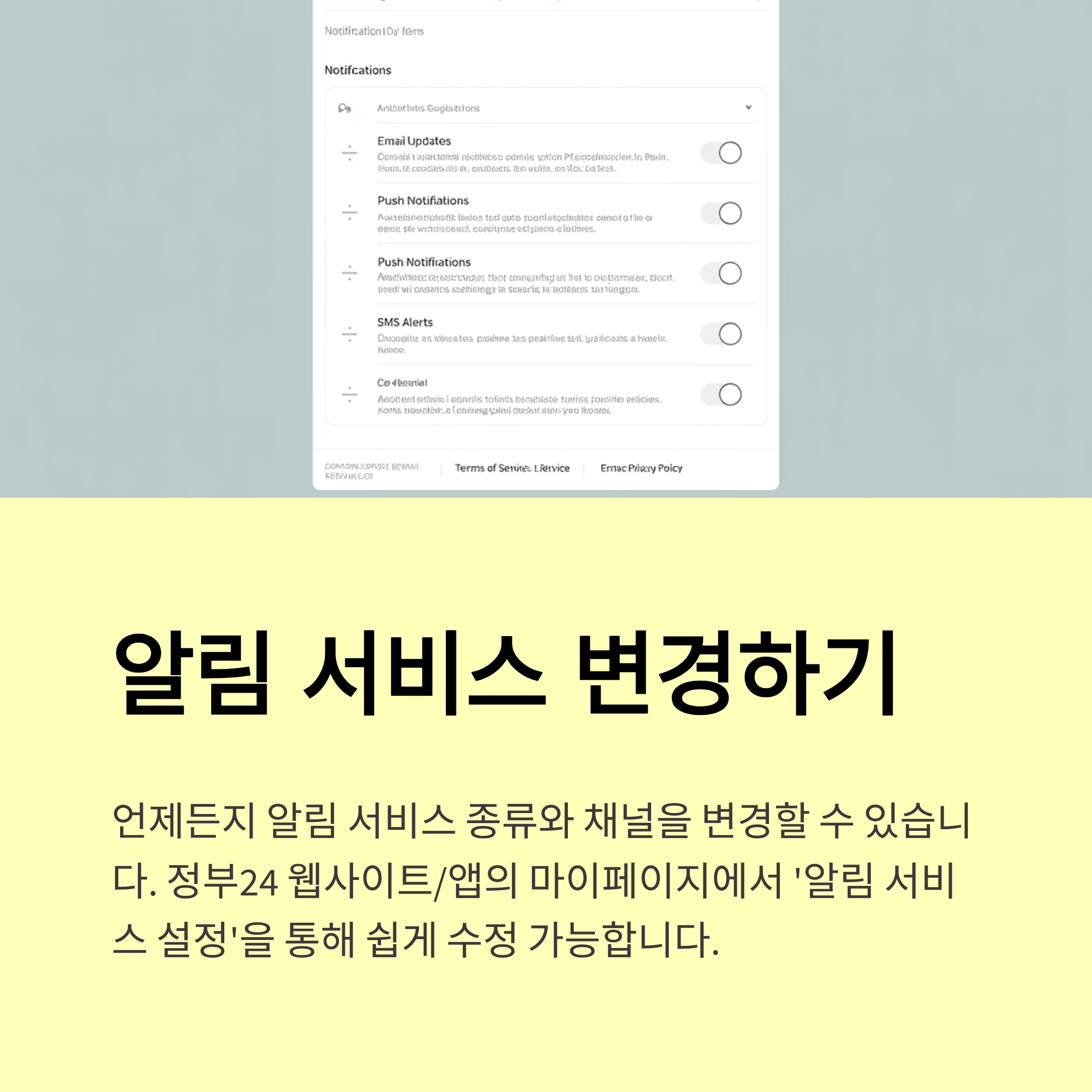 A. 네, 물론입니다. '정부24'에 로그인한 후 '국민비서' → '알림 설정' 메뉴에서 언제든지 수신 채널을 변경하거나, 받고 싶은 알림 종류를 수정할 수 있습니다.
