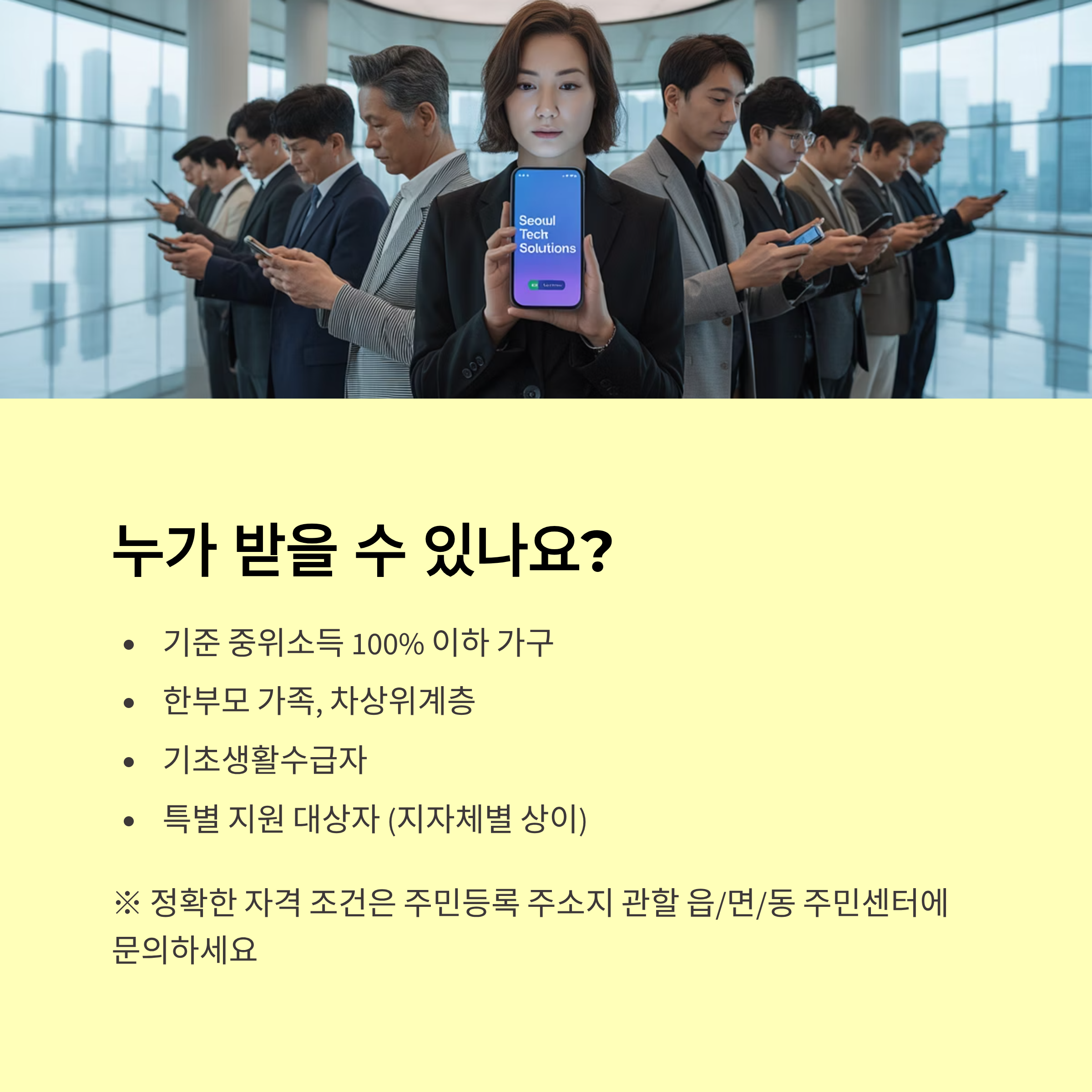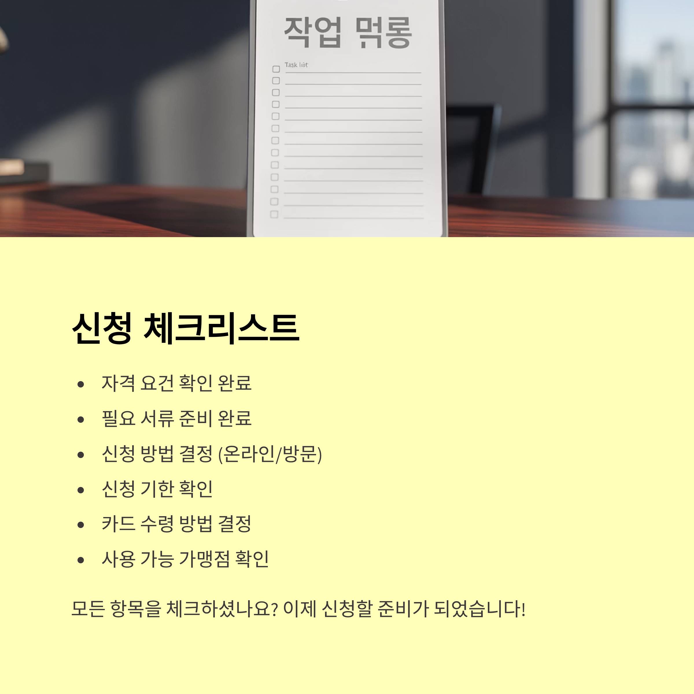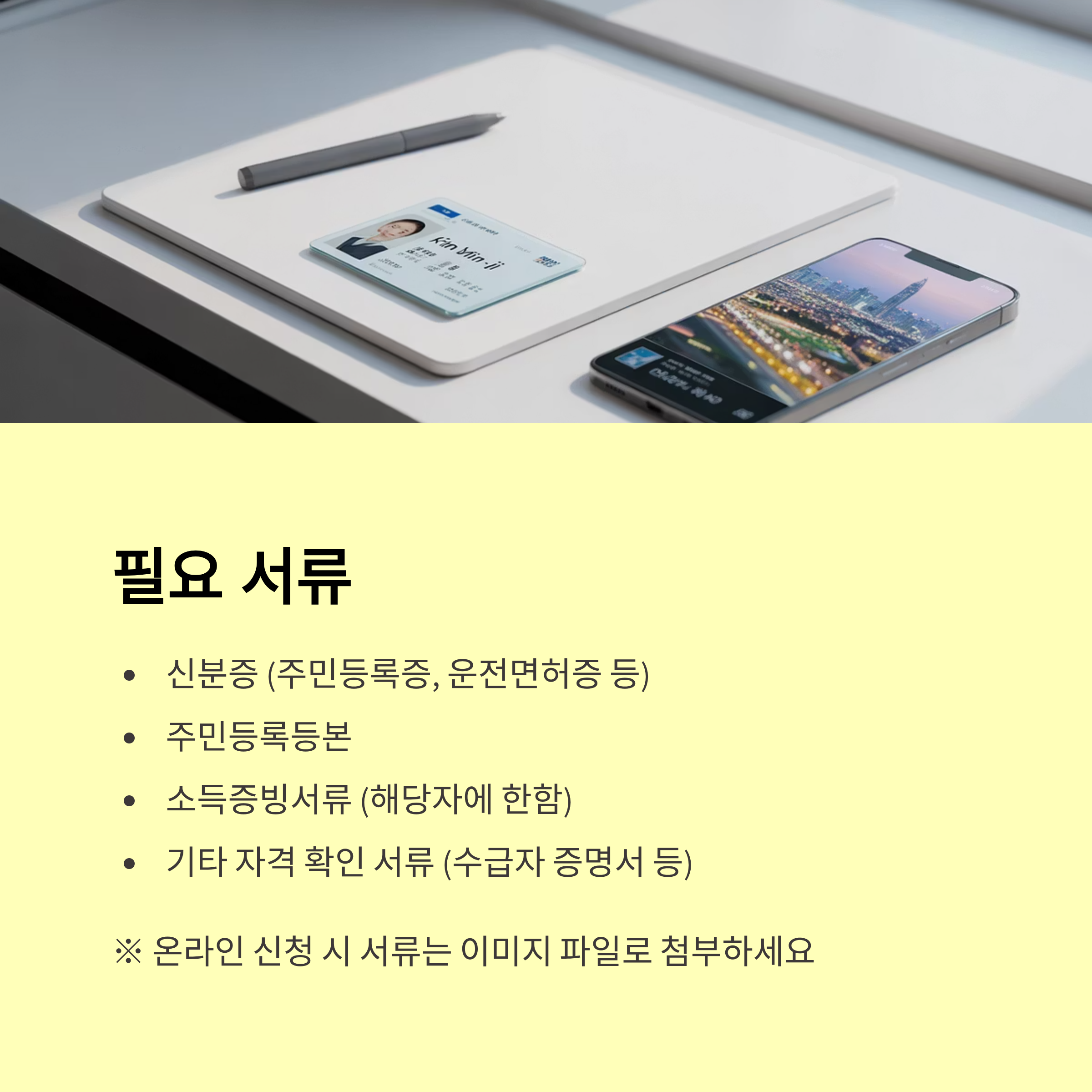 - 신분증, 신청서, 통장(계좌번호) 또는 선불카드 지참