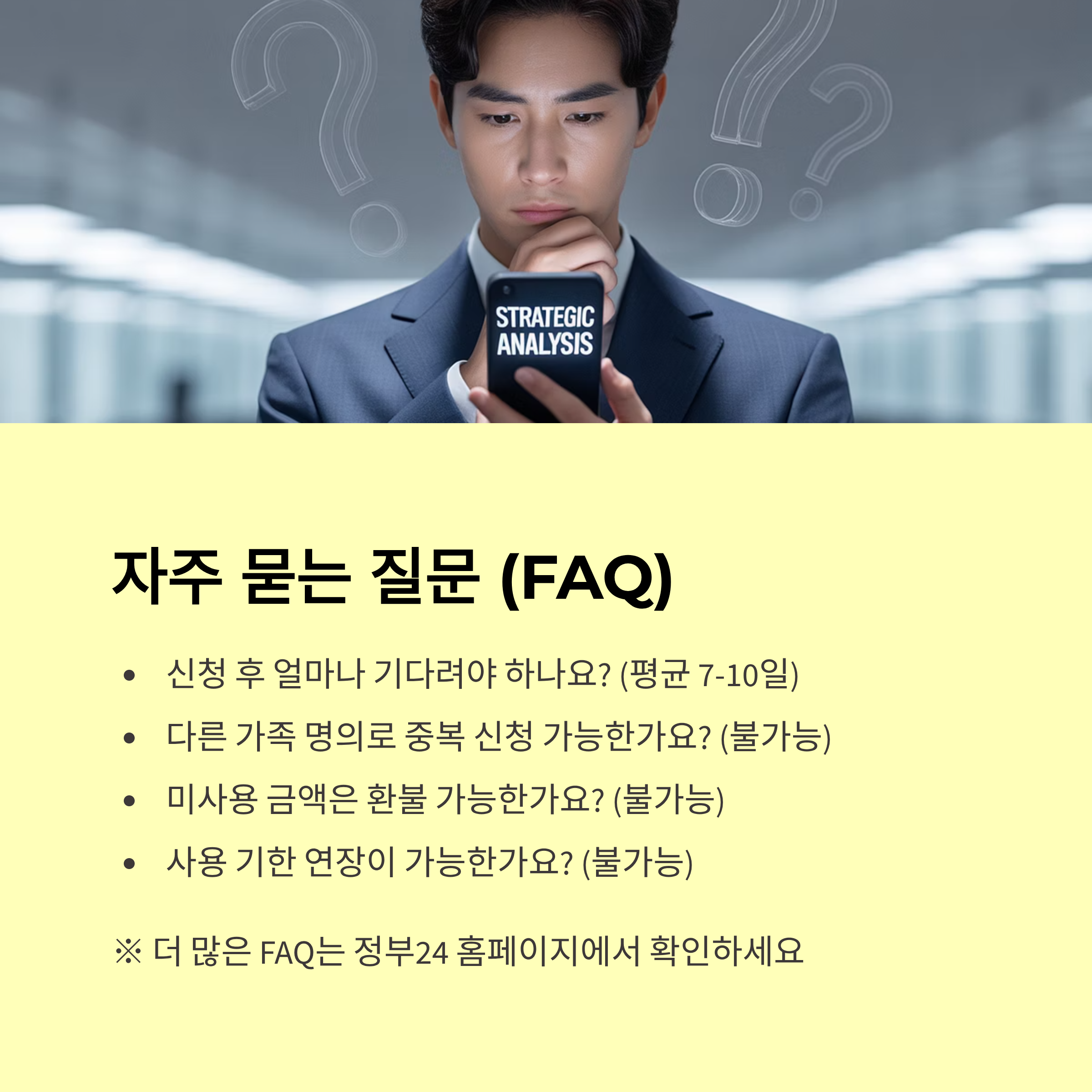 A: 신청 후 7일 내 미수령 시 해당 주민센터에 문의하세요. - Q: 가족 명의로도 신청 가능한가요?
