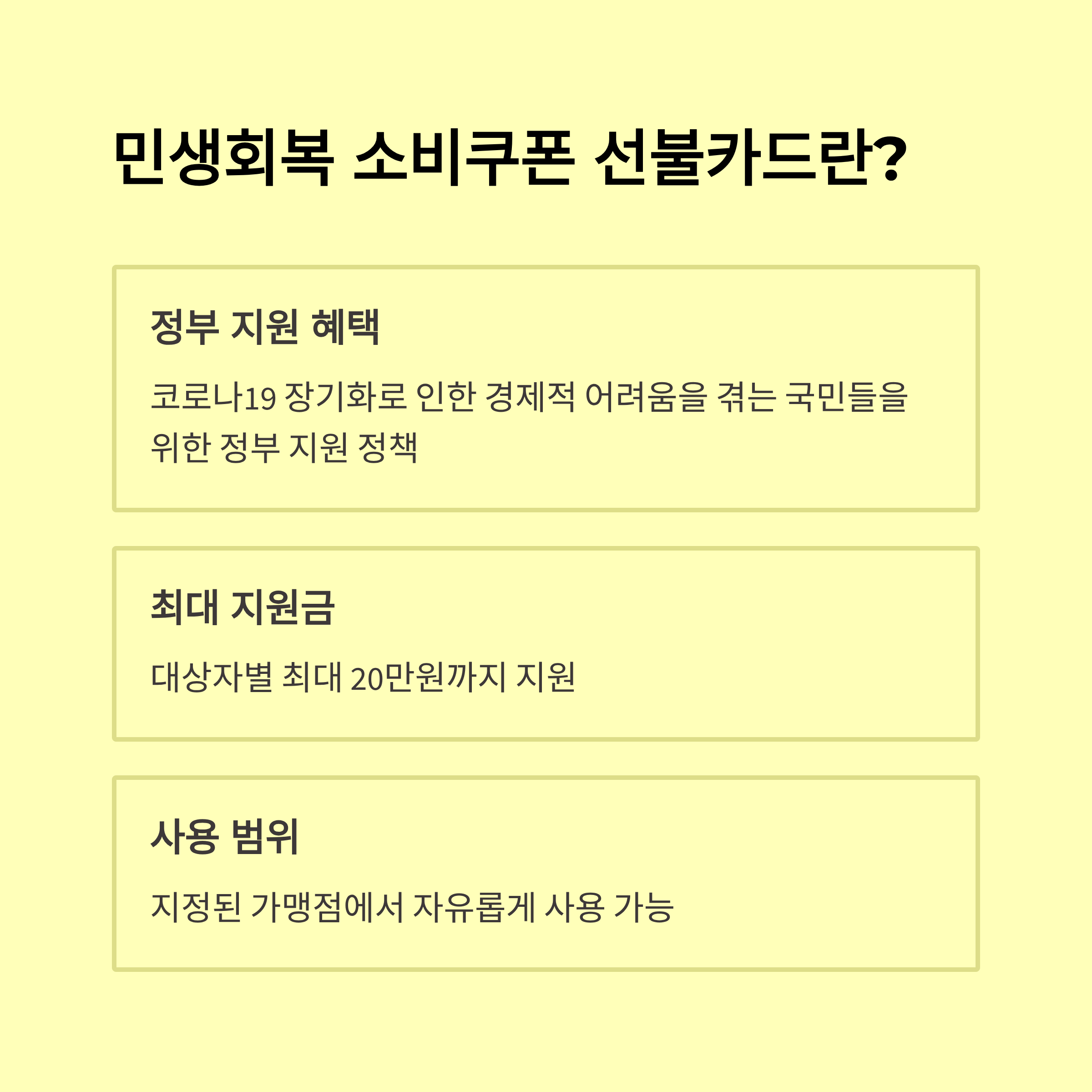 민생회복 소비쿠폰 선불카드는 코로나 이후 급감한 소비 심리를 회복하기 위한 **국민 지원 정책**입니다. 신용카드 방식 대신 **선불카드** 형태로 지급되어, 사용 제한과 투명성을 확보했습니다.