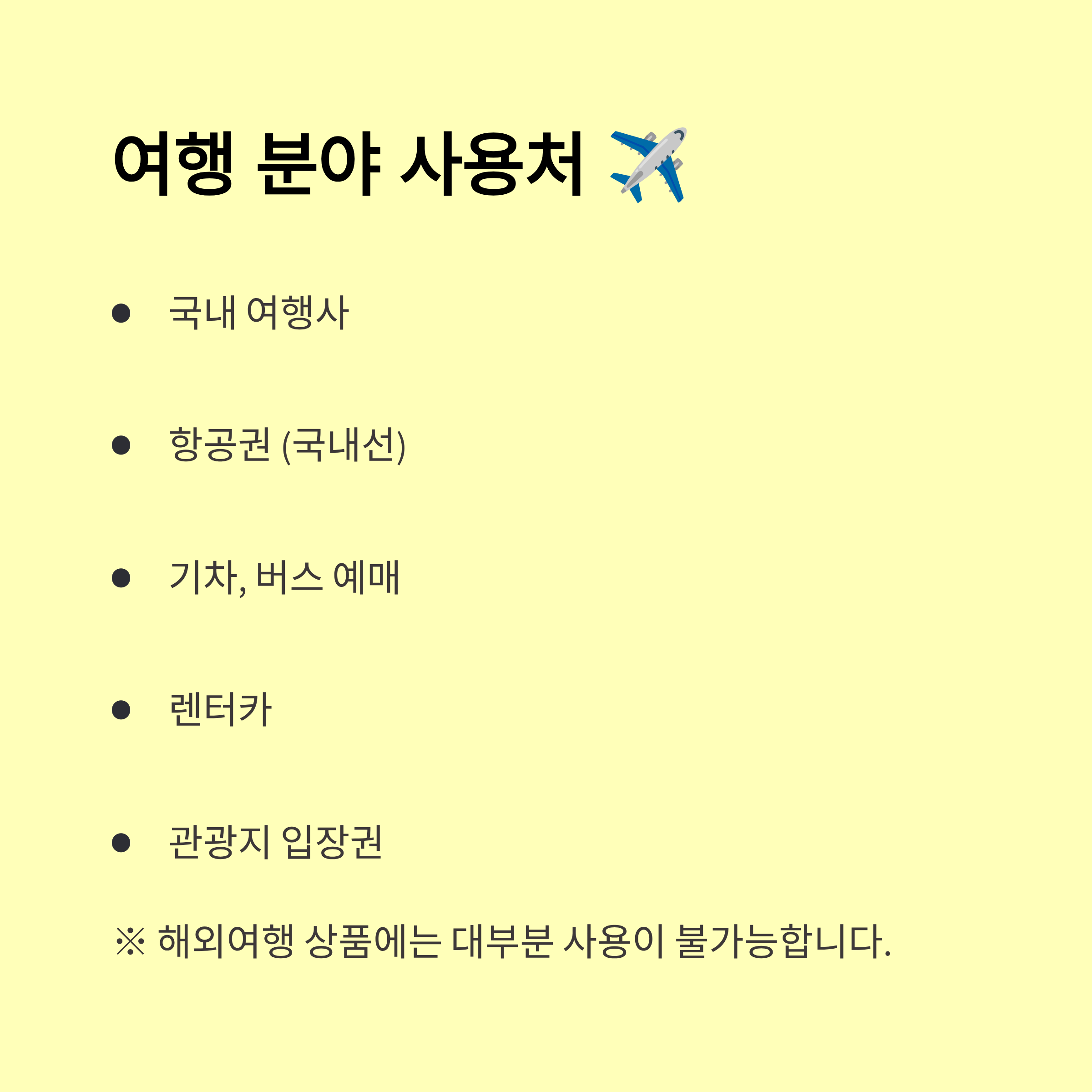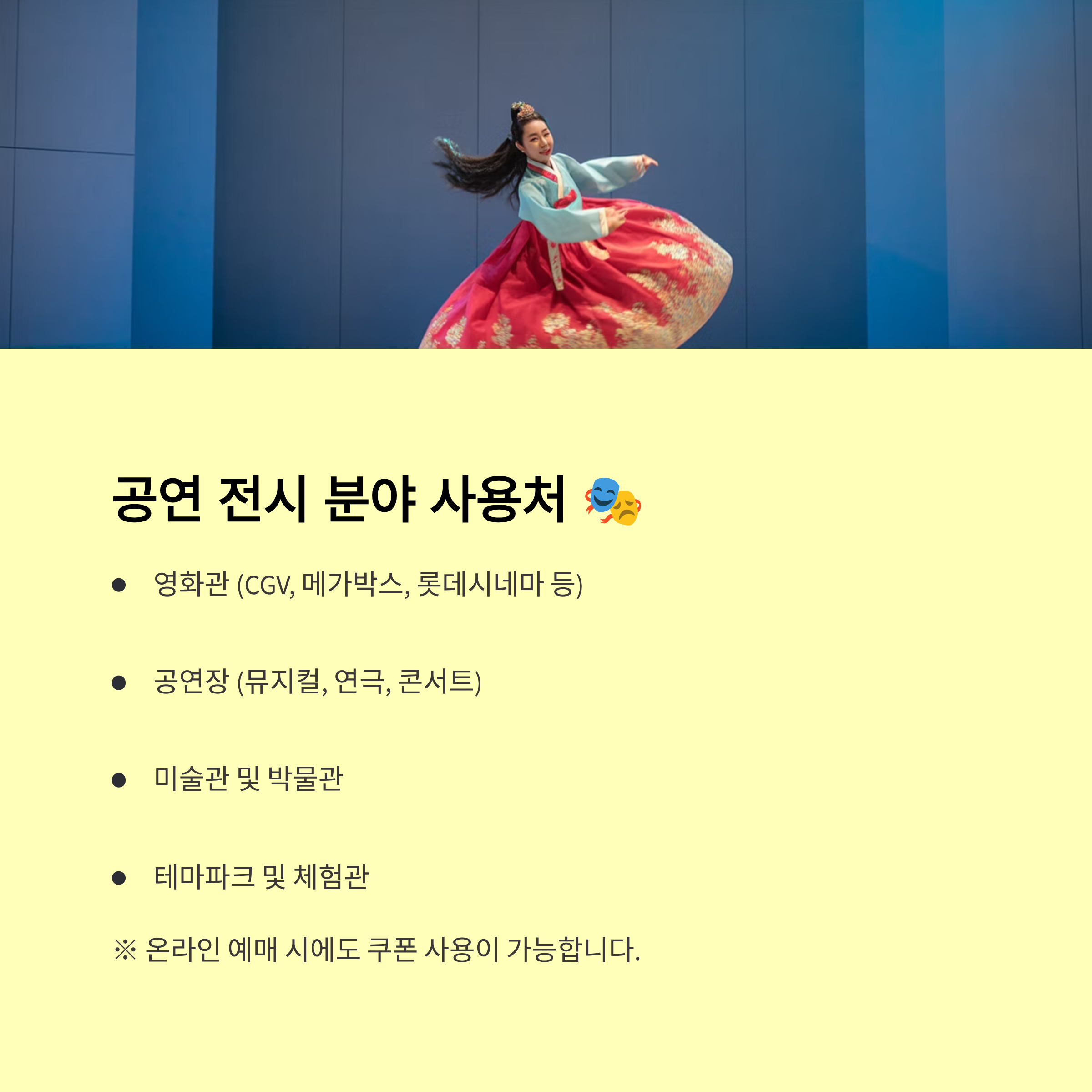 | 문화·체험 | 영화관·공연장 일부 | 테마파크·전시 할인 | 박물관·체험관 포함 |