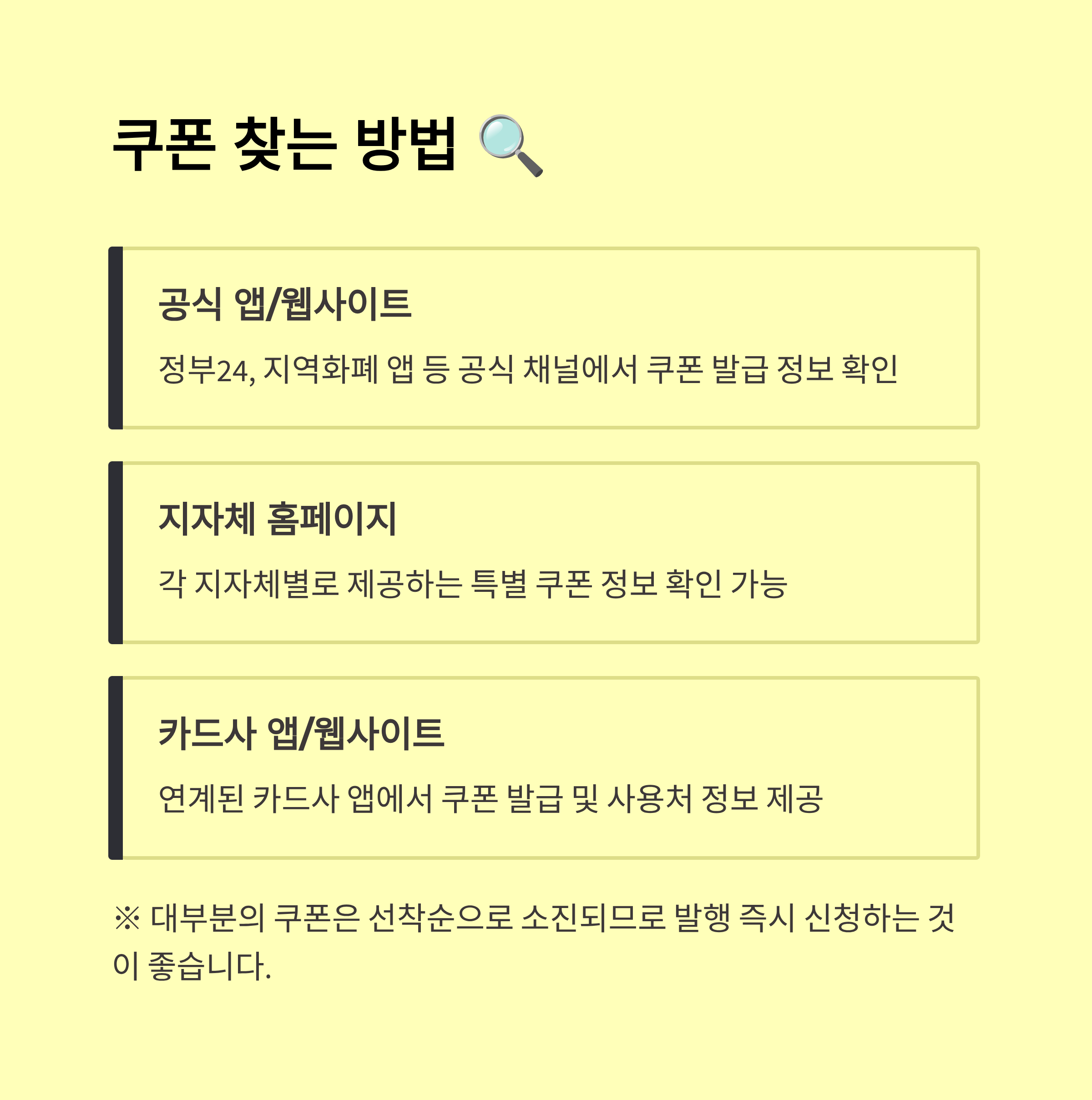 쿠폰을 사용하는 방법은 어렵지 않아요. 지자체별로 발급 방식은 조금씩 다르지만, 대부분 아래 순서로 진행됩니다.